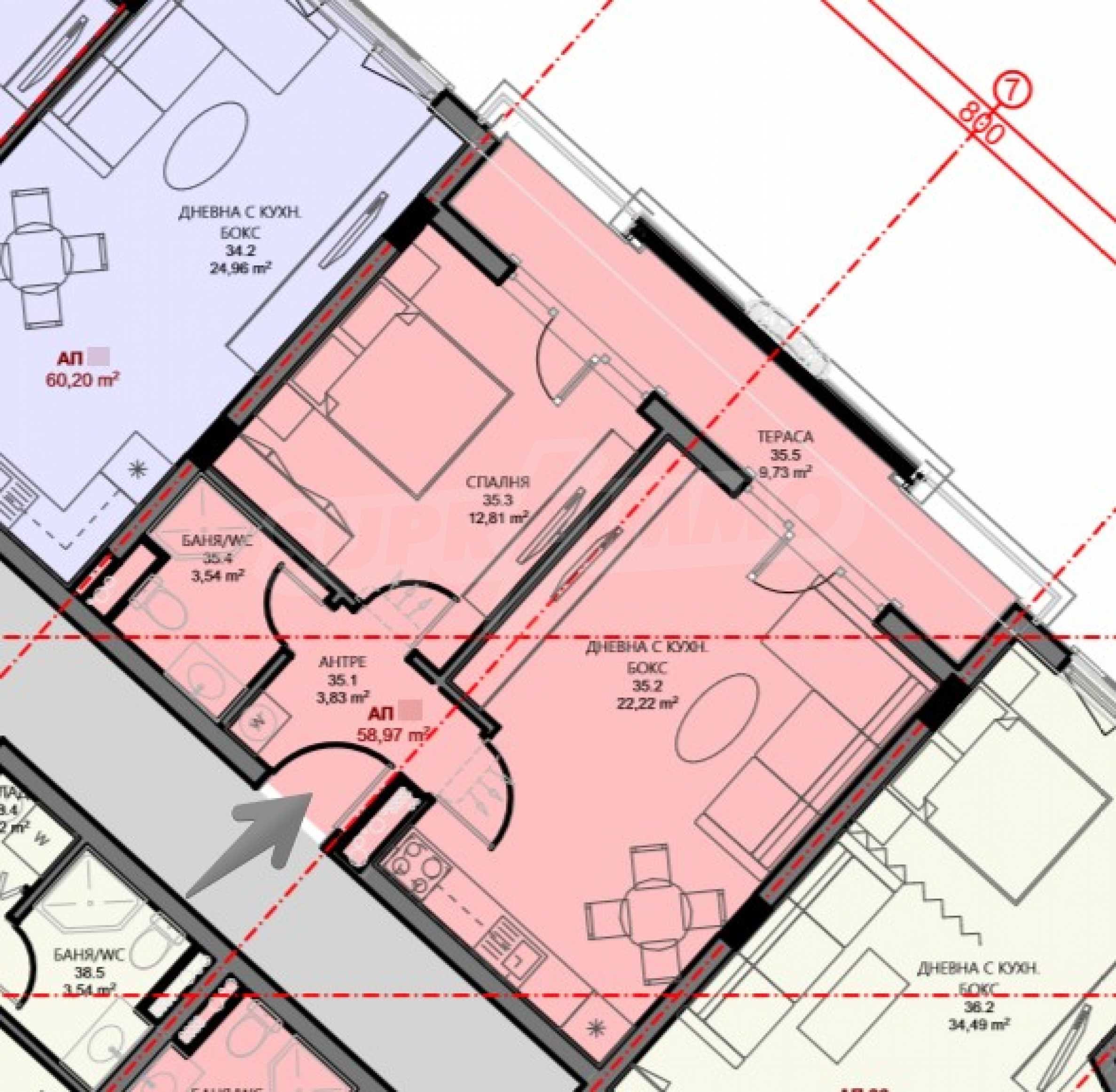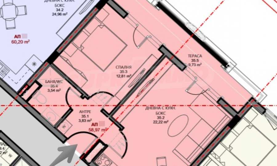 The residential detached sites in the building are a total of 60, distributed in 3 entrances. The apartments are of one-room (studio) type - 9 pcs., One-bedroom (with 1 bedroom) - 43 pcs. and 6 two-bedroom properties. There is a possibility to acquire more penthouse properties in this building. Contact the responsible broker for this offer.