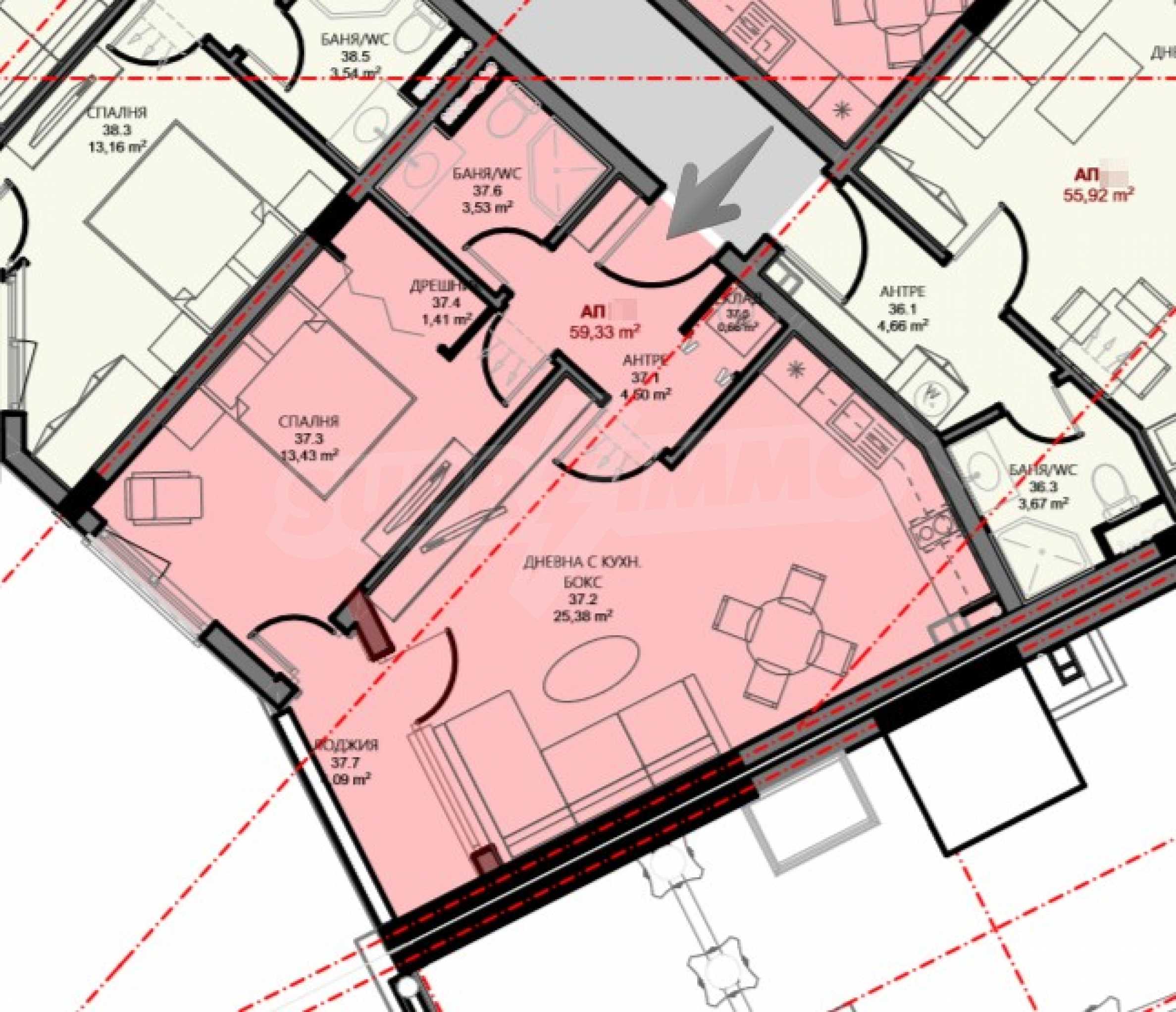 The residential detached sites in the building are a total of 60, distributed in 3 entrances. The apartments are of one-room (studio) type - 9 pcs., One-bedroom (with 1 bedroom) - 43 pcs. and 6 two-bedroom properties. There is a possibility to acquire more penthouse properties in this building. Contact the responsible broker for this offer.