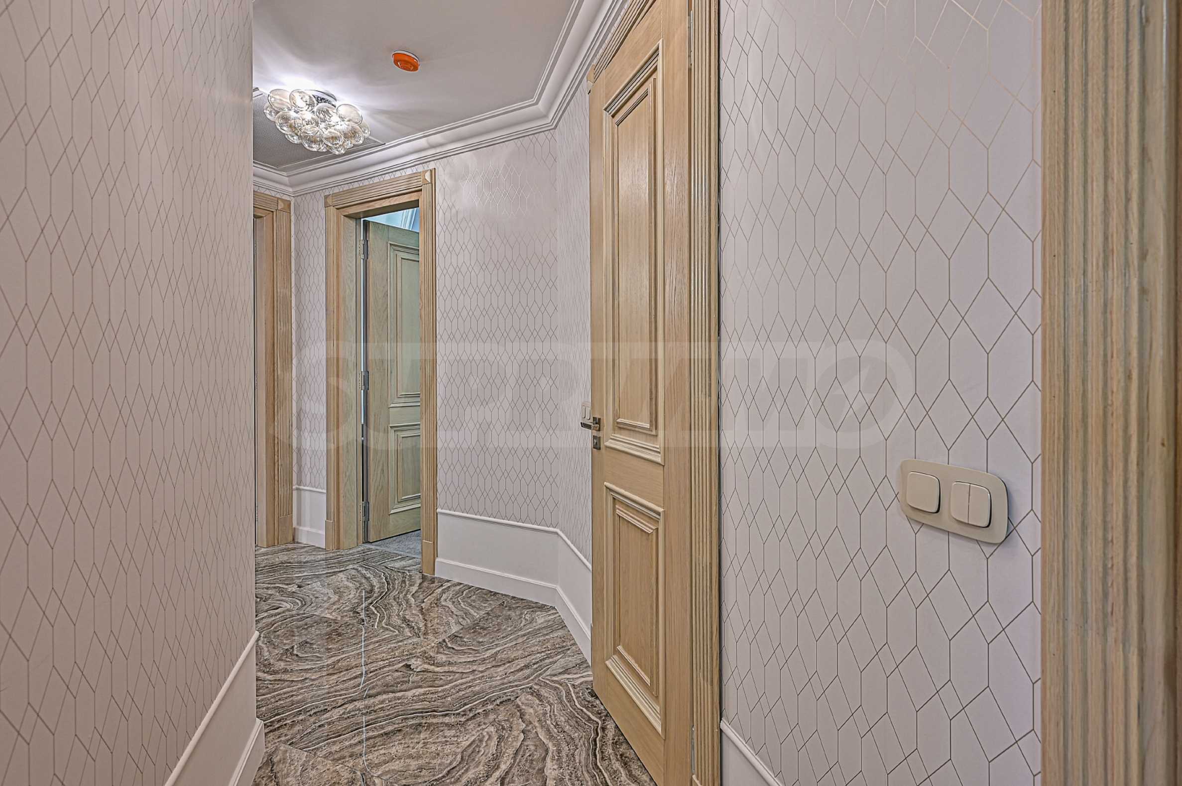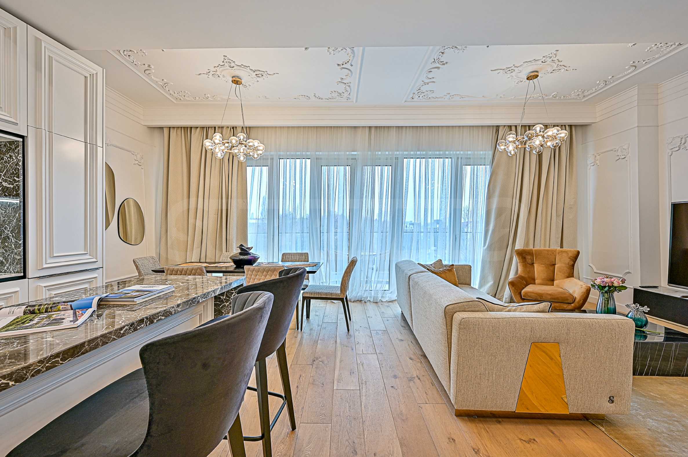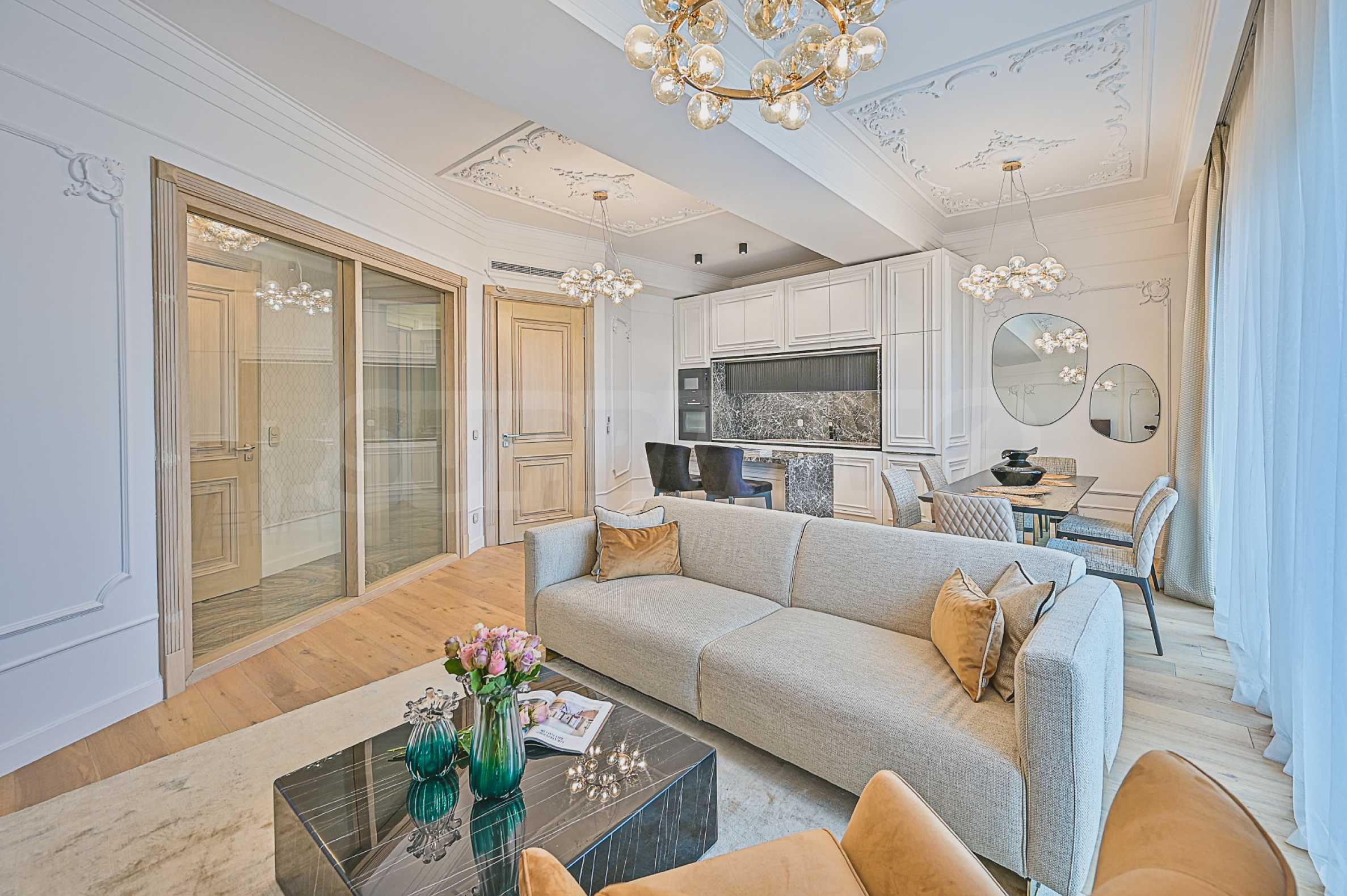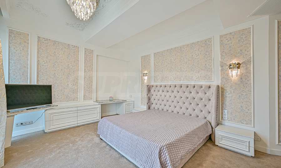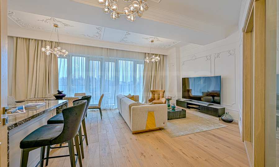 High ceilings 3.20 m, lots of light, attention to every detail, excellent design solutions, warm colors and fabrics. The massive interior doors are 2.40 m high, plaster ornaments, high-class furniture and electrical appliances. Convenience, comfort, coziness and feeling of a real home.