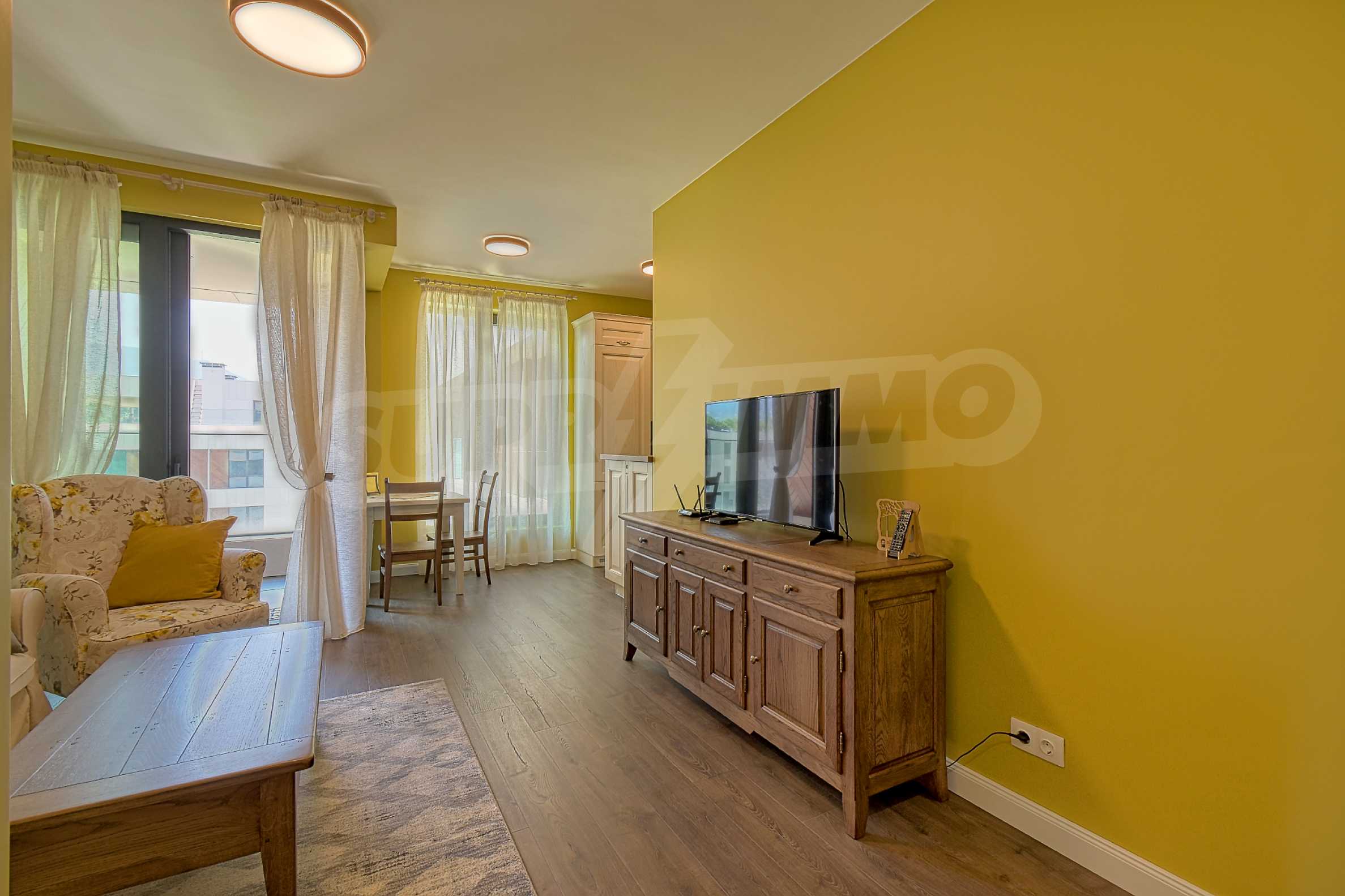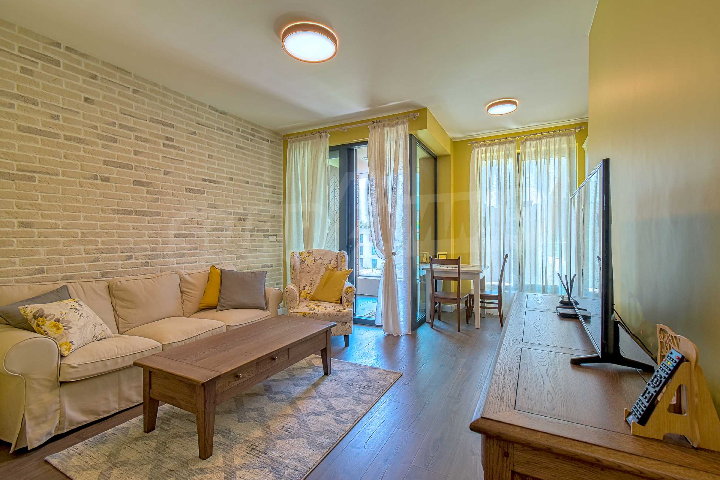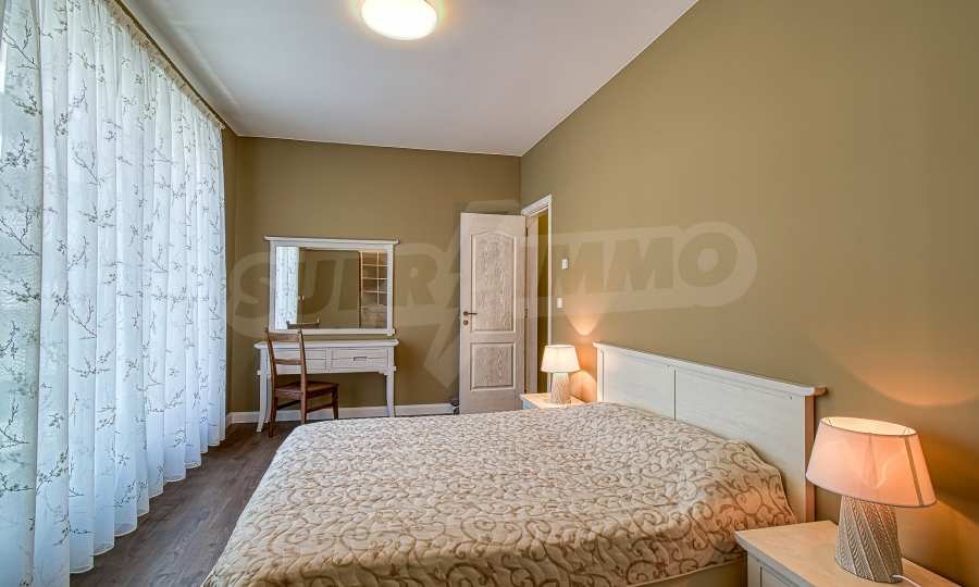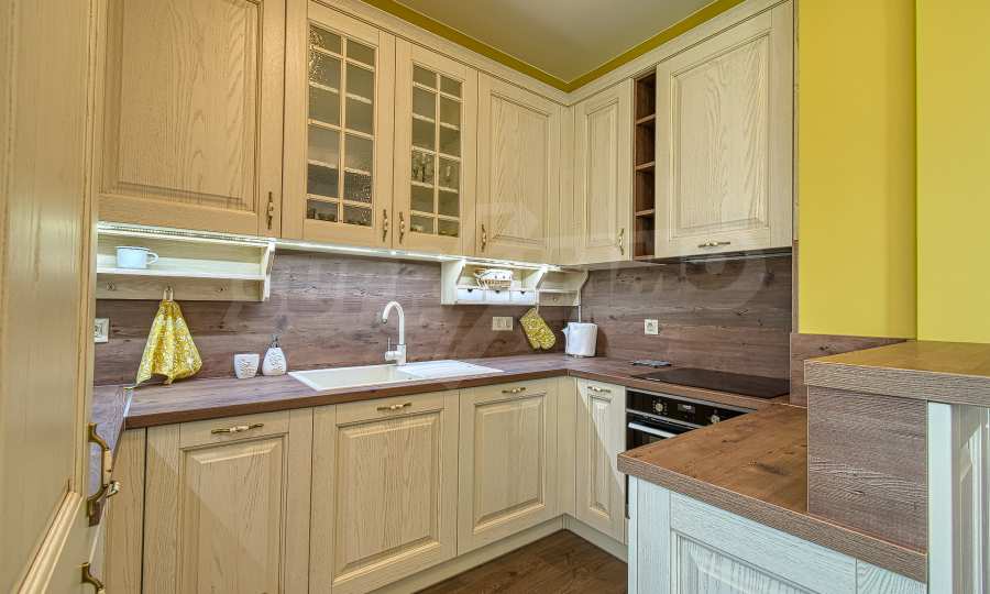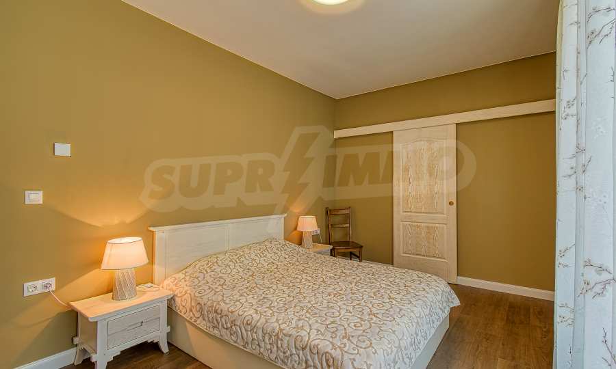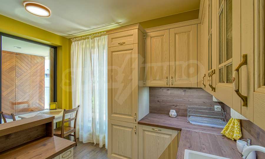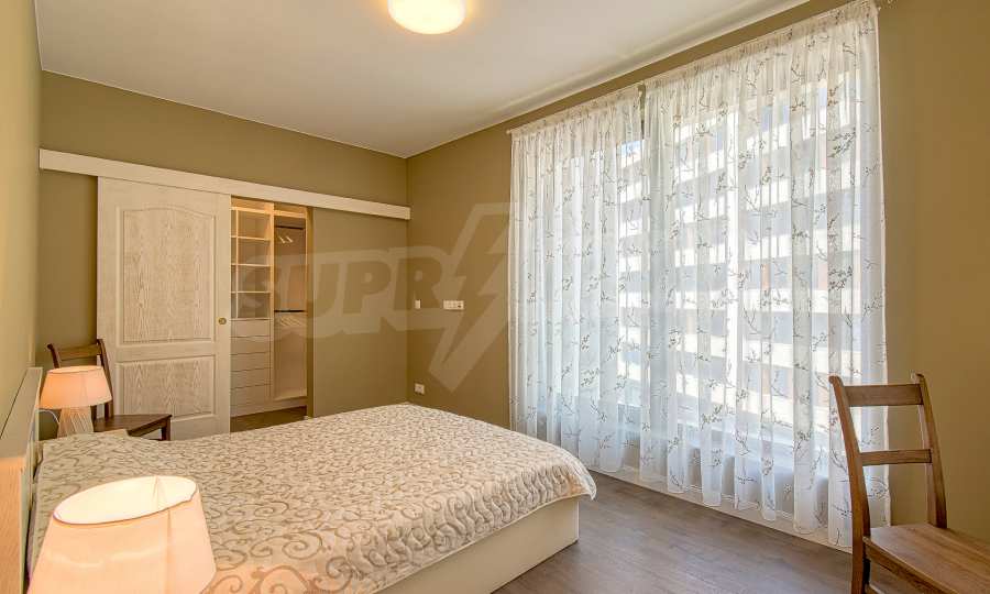 The apartment consists of a living room with a separate kitchen, a dining room and a corner with sofas, a spacious bedroom with a large wardrobe and a bathroom, as well as a terrace to the living room, from which there is a magnificent panoramic view of Vitosha. The apartment is offered fully furnished with top-class furniture made of solid wood (oak) and equipped with built-in electrical appliances and sanitary ware from leading global brands. Underfloor heating has been installed and a standalone Bosch gas boiler has been installed. The system is equipped with the NEA SMART 2.0 regulators, which allow remote control (for each room) of the underfloor heating via a smartphone. Massive entrance door, armored with MDF wood decor with mechanical and electronic control, 3D adjustable hidden hinges, automatic threshold, video peephole with built-in touch display, with the possibility of remote control via mobile phone.