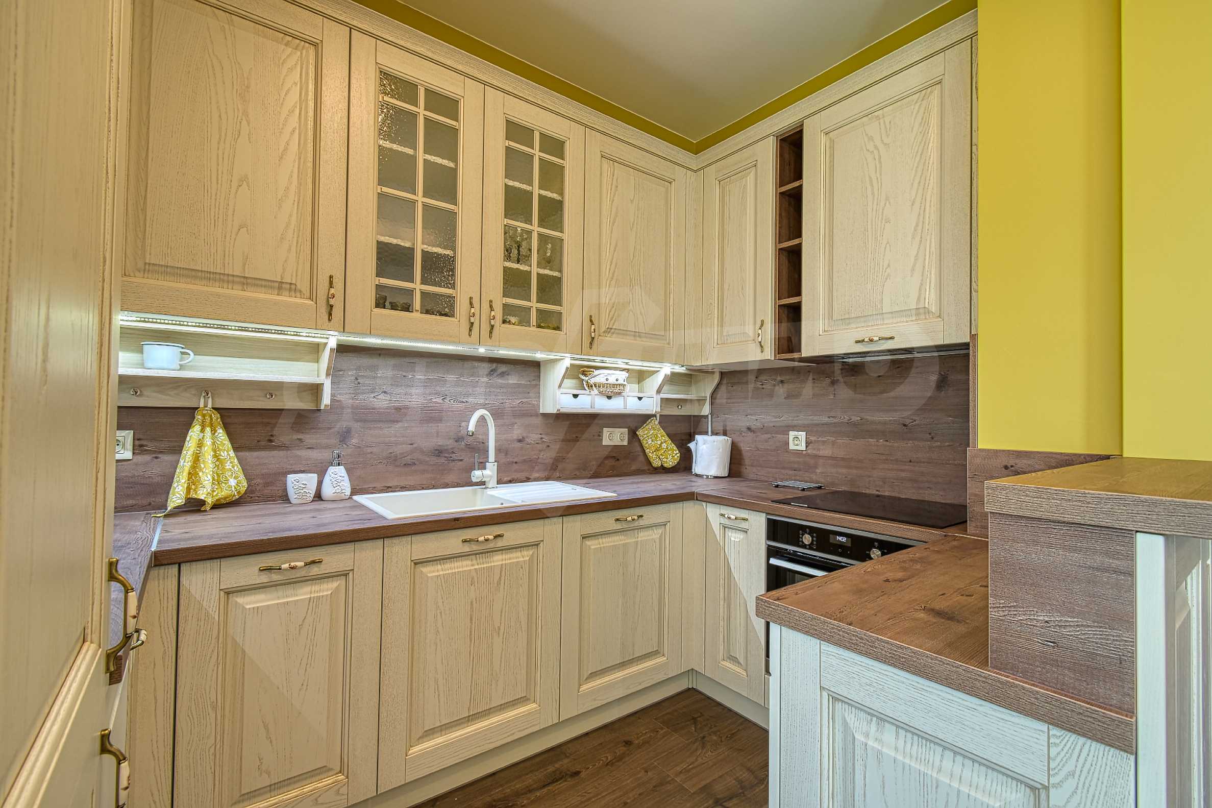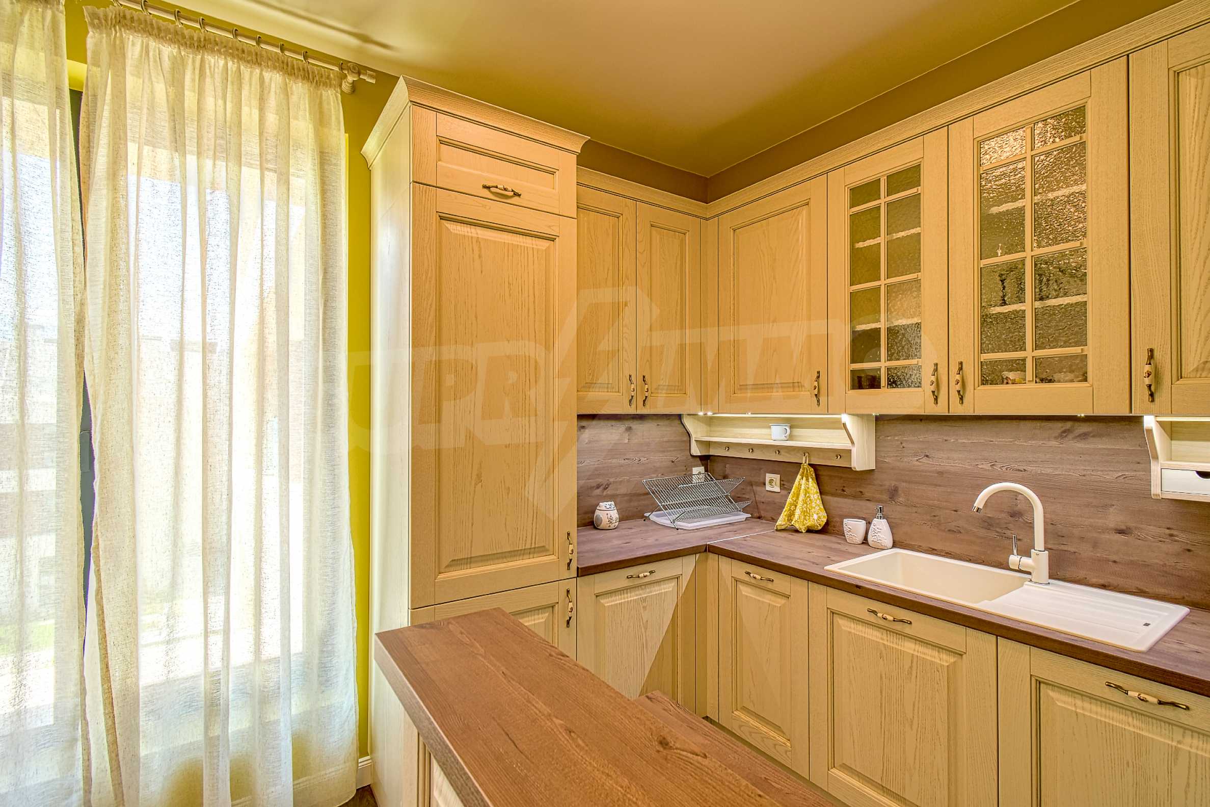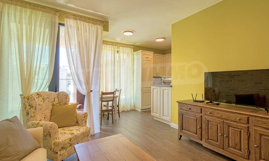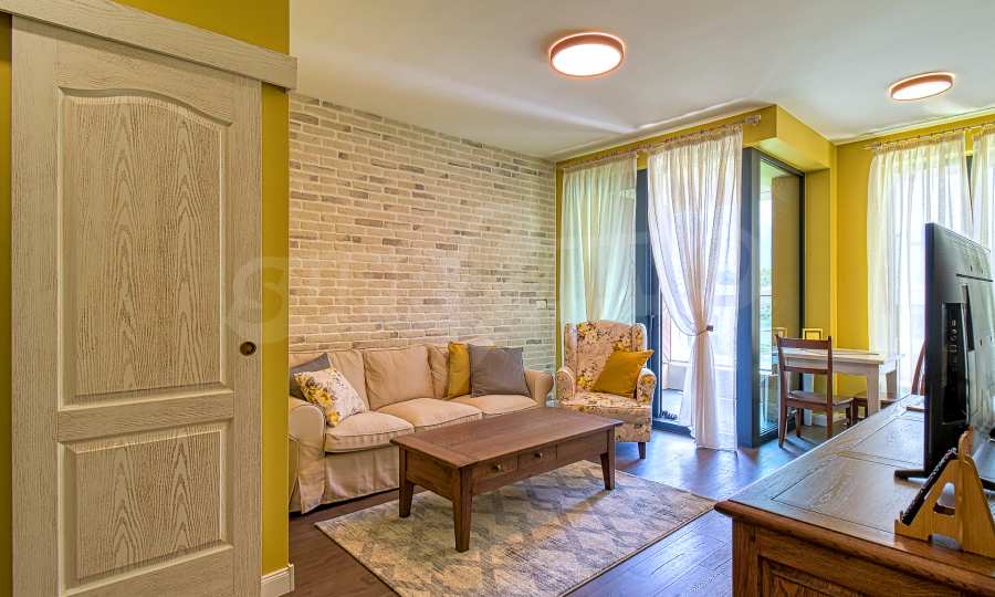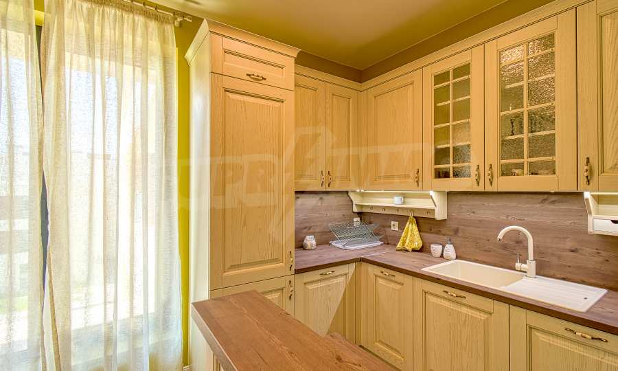 The apartment consists of a living room with a separate kitchen, a dining room and a corner with sofas, a spacious bedroom with a large wardrobe and a bathroom, as well as a terrace to the living room, from which there is a magnificent panoramic view of Vitosha. The apartment is offered fully furnished with top-class furniture made of solid wood (oak) and equipped with built-in electrical appliances and sanitary ware from leading global brands. Underfloor heating has been installed and a standalone Bosch gas boiler has been installed. The system is equipped with the NEA SMART 2.0 regulators, which allow remote control (for each room) of the underfloor heating via a smartphone. Massive entrance door, armored with MDF wood decor with mechanical and electronic control, 3D adjustable hidden hinges, automatic threshold, video peephole with built-in touch display, with the possibility of remote control via mobile phone.