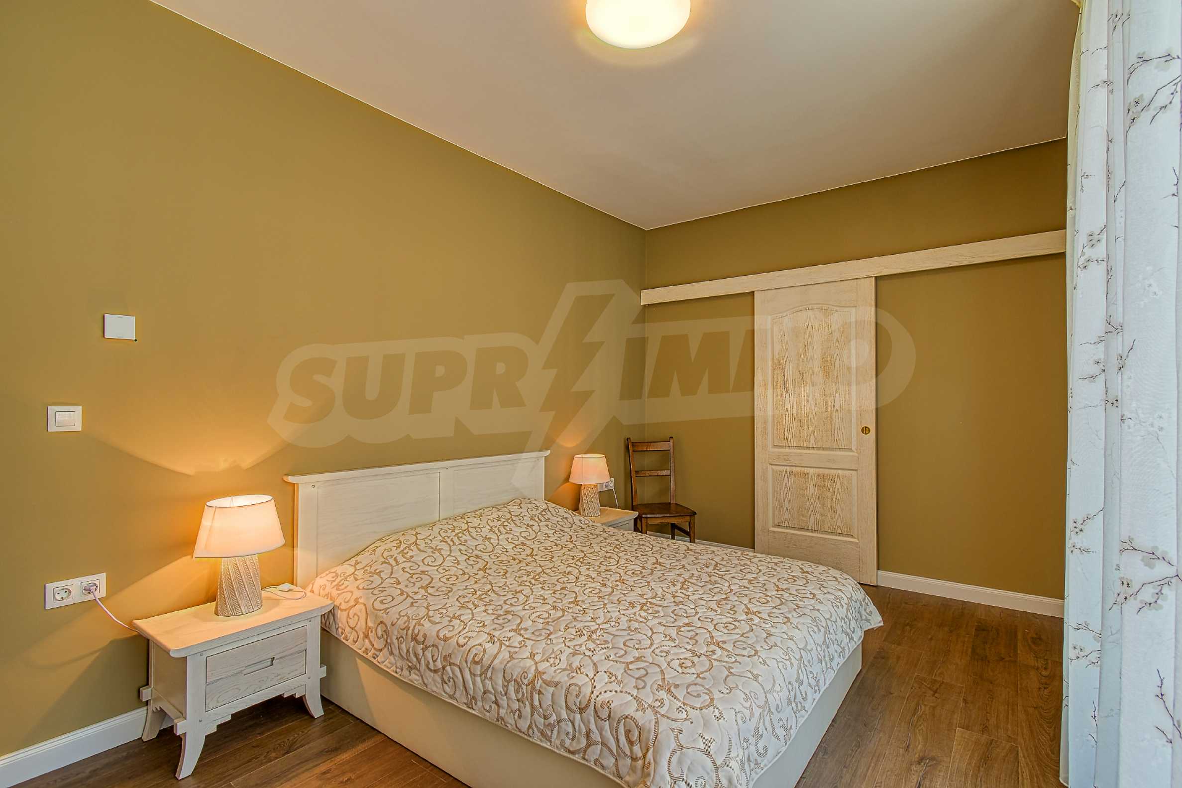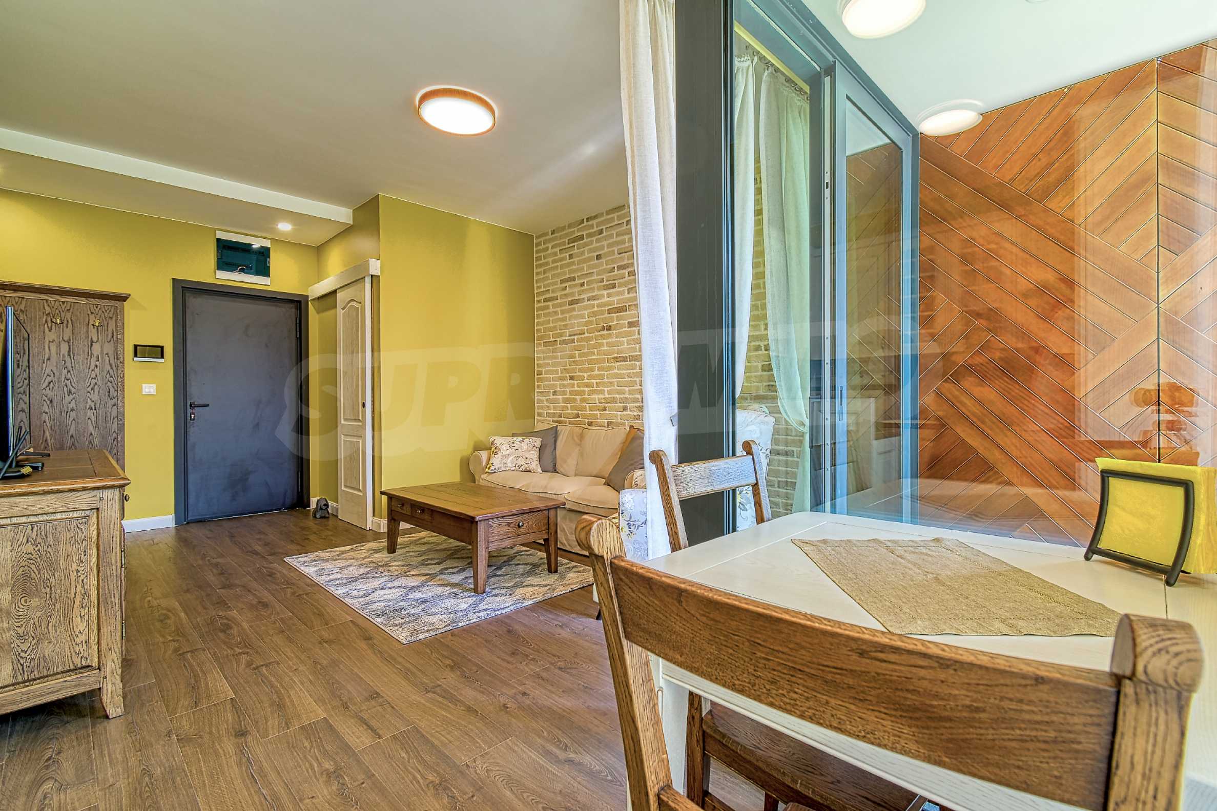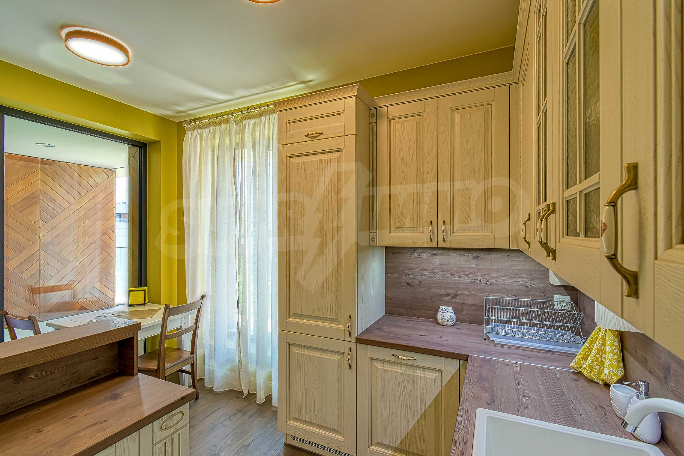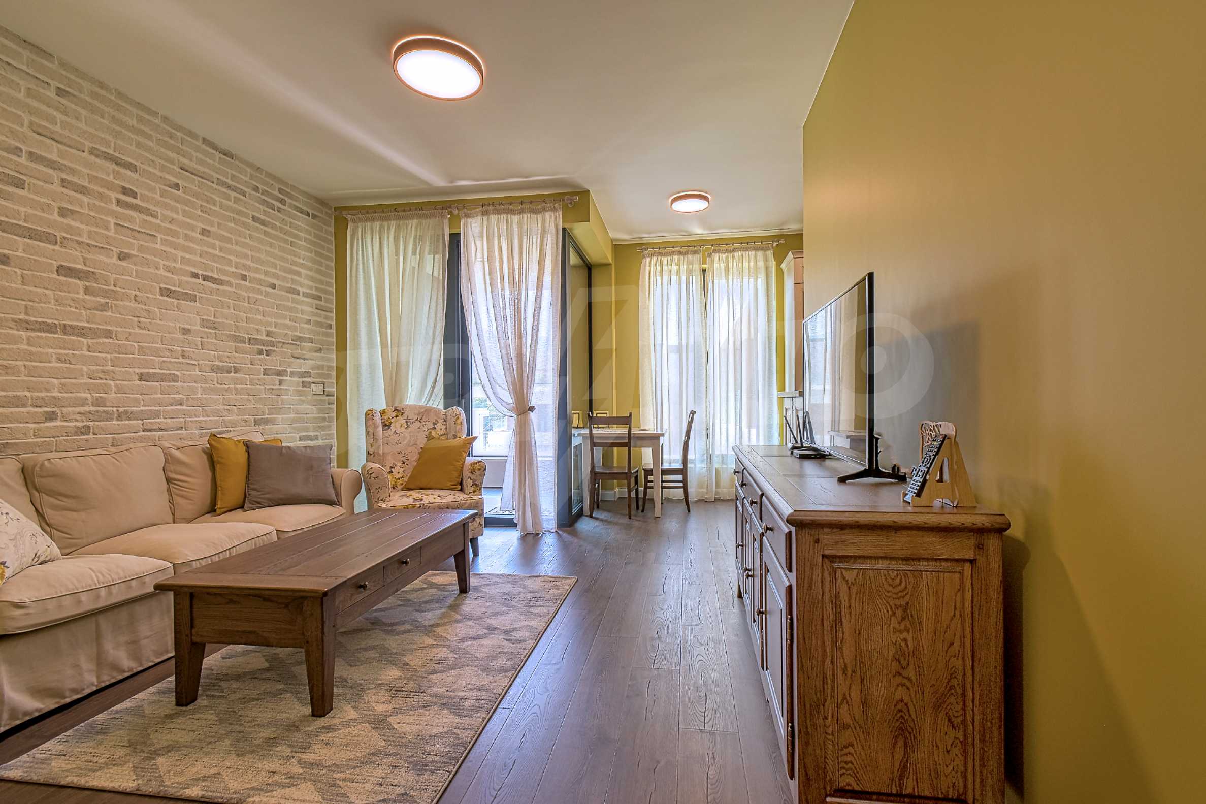 The apartment consists of a living room with a separate kitchen, a dining room and a corner with sofas, a spacious bedroom with a large wardrobe and a bathroom, as well as a terrace to the living room, from which there is a magnificent panoramic view of Vitosha. The apartment is offered fully furnished with top-class furniture made of solid wood (oak) and equipped with built-in electrical appliances and sanitary ware from leading global brands. Underfloor heating has been installed and a standalone Bosch gas boiler has been installed. The system is equipped with the NEA SMART 2.0 regulators, which allow remote control (for each room) of the underfloor heating via a smartphone. Massive entrance door, armored with MDF wood decor with mechanical and electronic control, 3D adjustable hidden hinges, automatic threshold, video peephole with built-in touch display, with the possibility of remote control via mobile phone.
