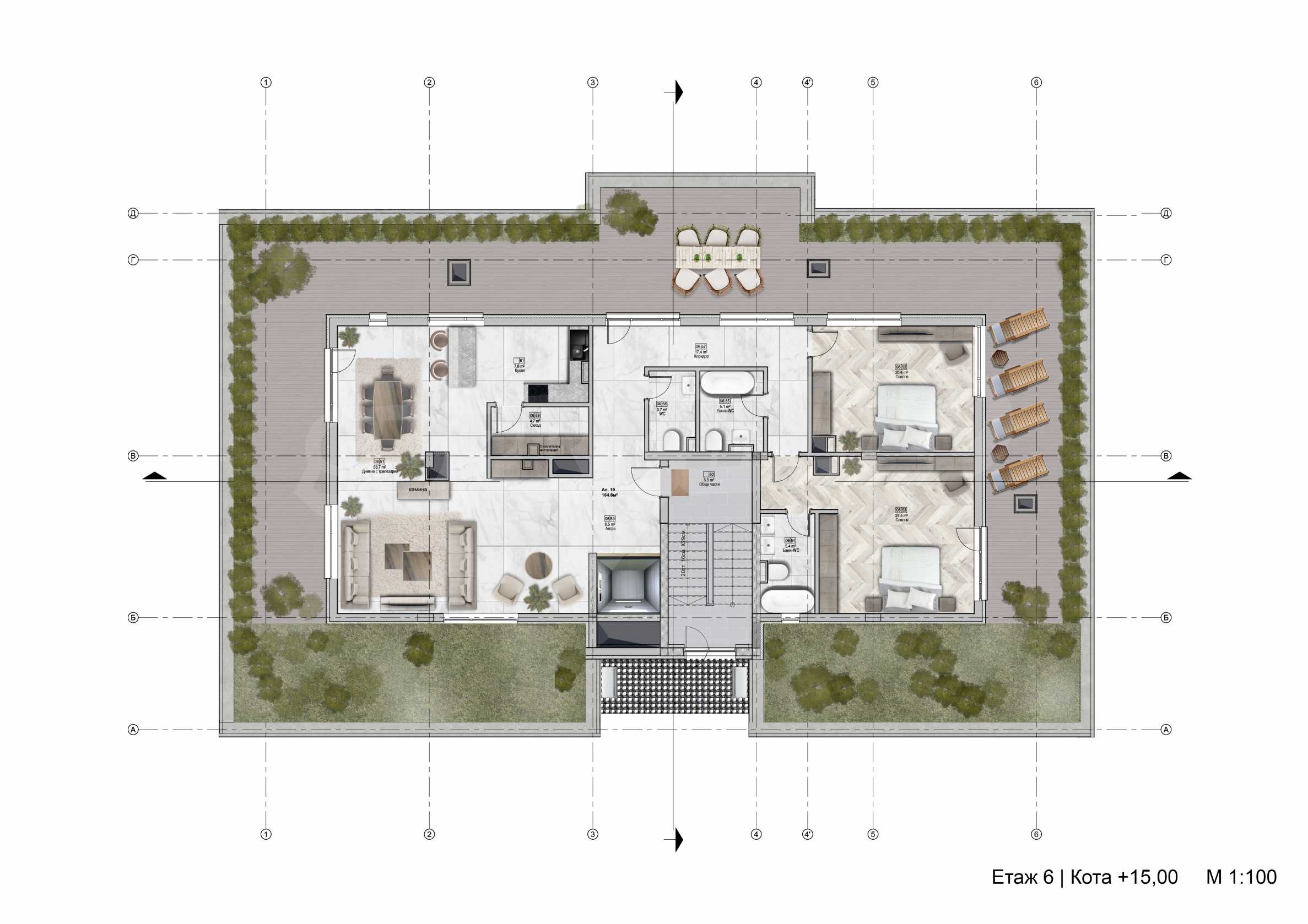 The penthouse we offer in this complex is located on the last 6th floor and has a total area of 356.15 m2. (net area 181.30 m2. + common parts 22.32 m2.). The apartment has the following layout: 2 bedrooms, open-plan kitchenette, dining area, living room, roof terrace, toilet, 2 bathrooms with bathtub and toilet to the room, closet.