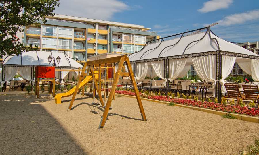 The complex is of a closed type, with access control, round-the-clock security and video surveillance, which guarantees you a peaceful stay and autonomy. There is a bus stop and grocery stores nearby, and only 250 meters from the complex - an exotic beach with natural sand dunes. Two popular beaches "Cocoa Beach" and "Bedrum", with world-famous restaurants with a unique atmosphere, exclusive "star" events and unforgettable, refined cuisine - only 250 meters from the complex. The place is also suitable for the beach and practicing various water sports, as well as for spa treatments. In the neighborhood is also the Old Town of Nessebar - the most recognizable seaside town-UNESCO site.