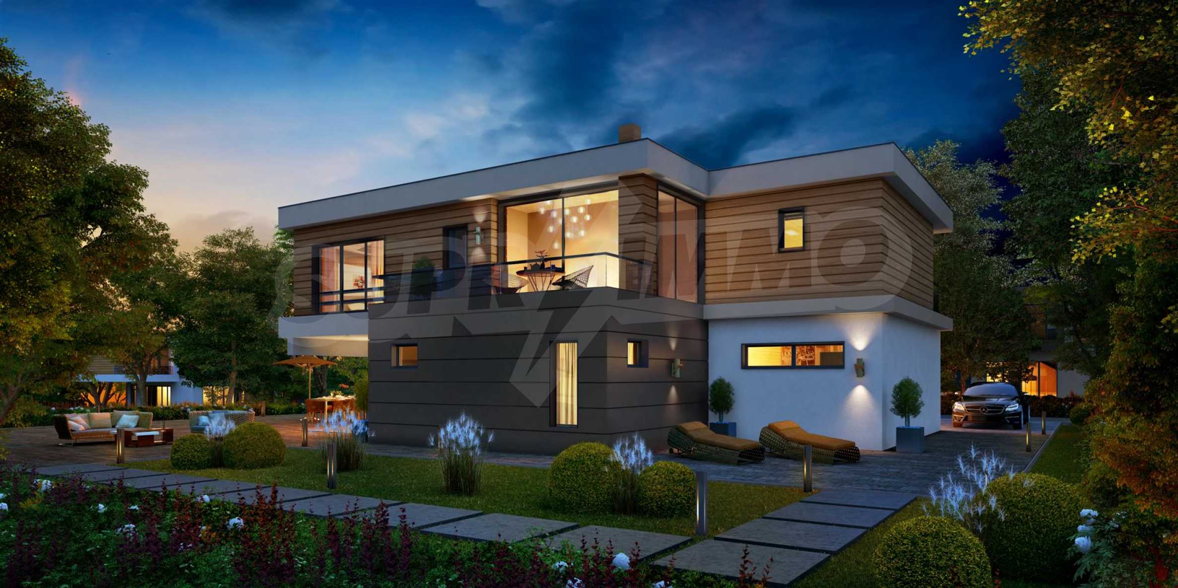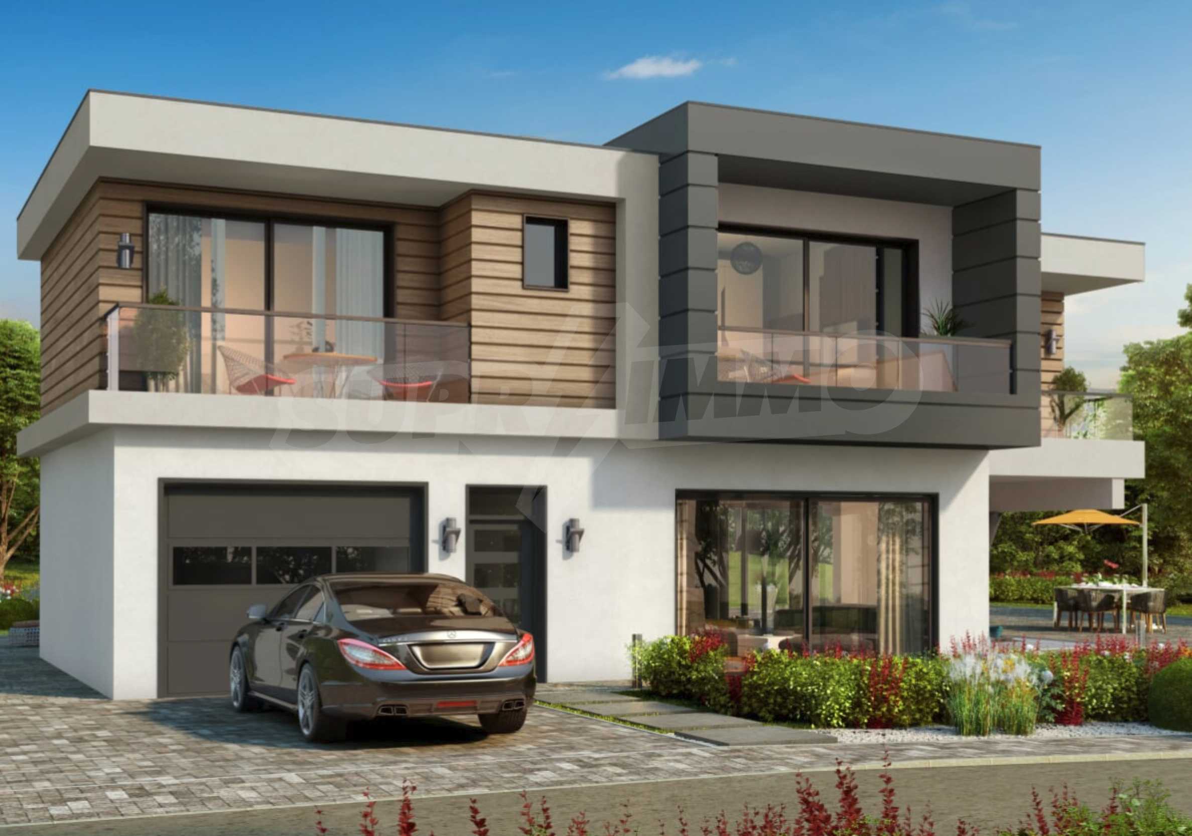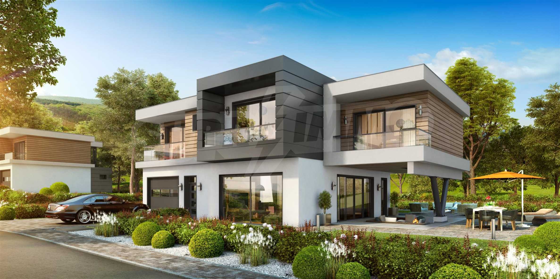 The complex has an administrative part, which includes a coffee bar and restaurant, a kindergarten, a fitness center, a minimarket, a car wash, a football field, a tennis court, a private garage, and 24-hour security. 90 luxury houses will be built, which are separated into 10 neighborhoods on a total area of 100 acres and are divided into four types according to your preferences.