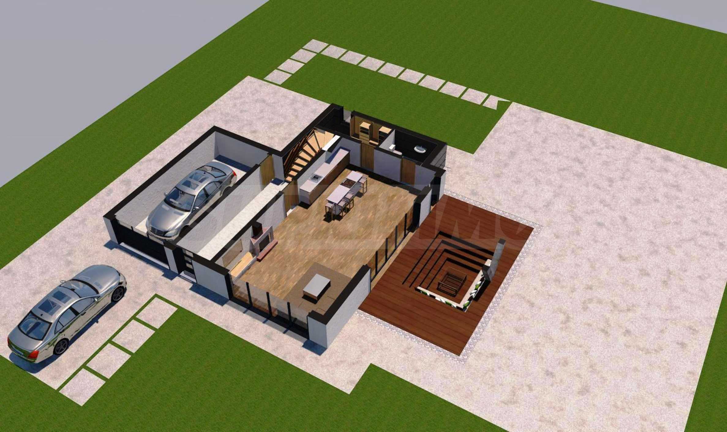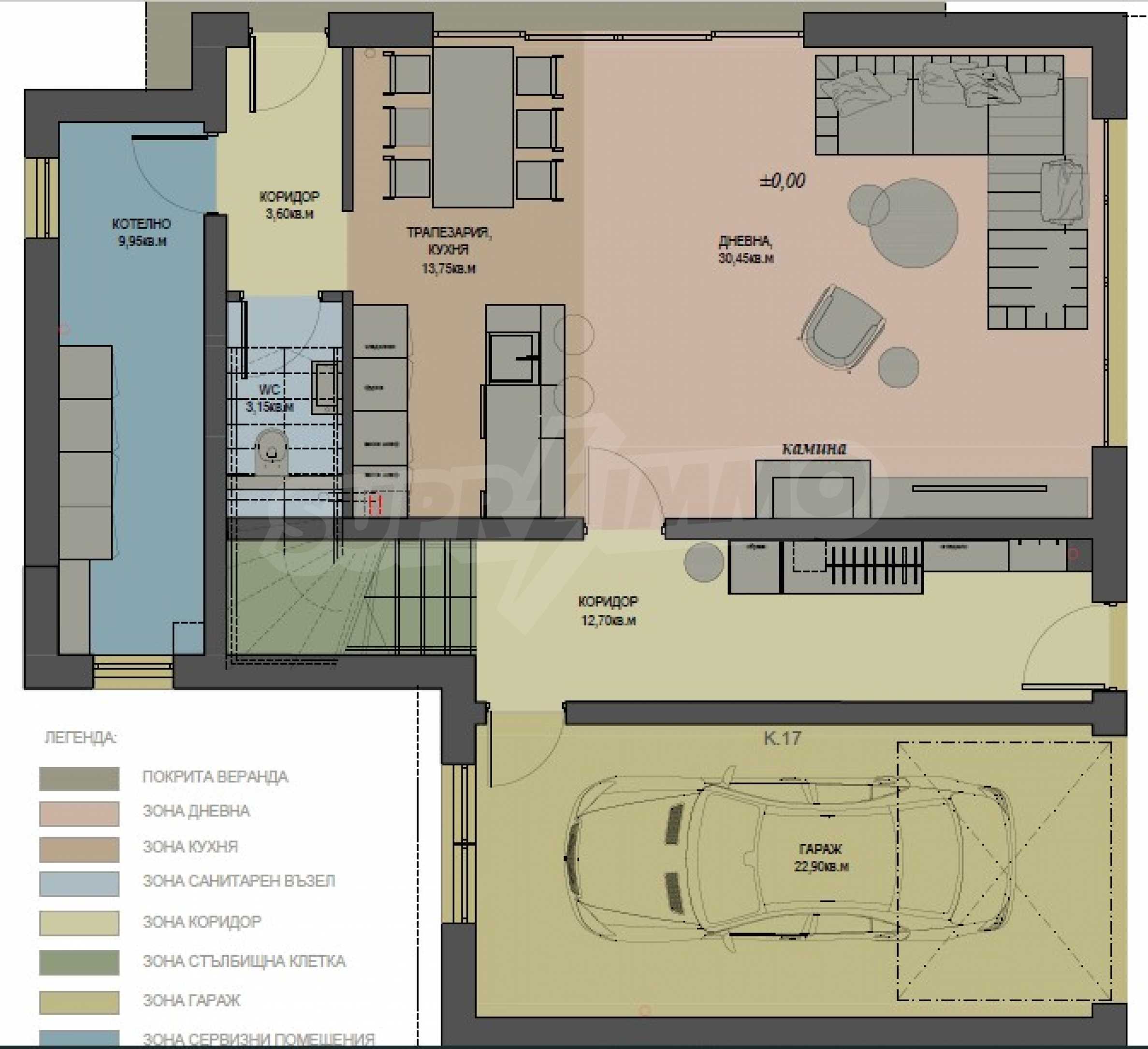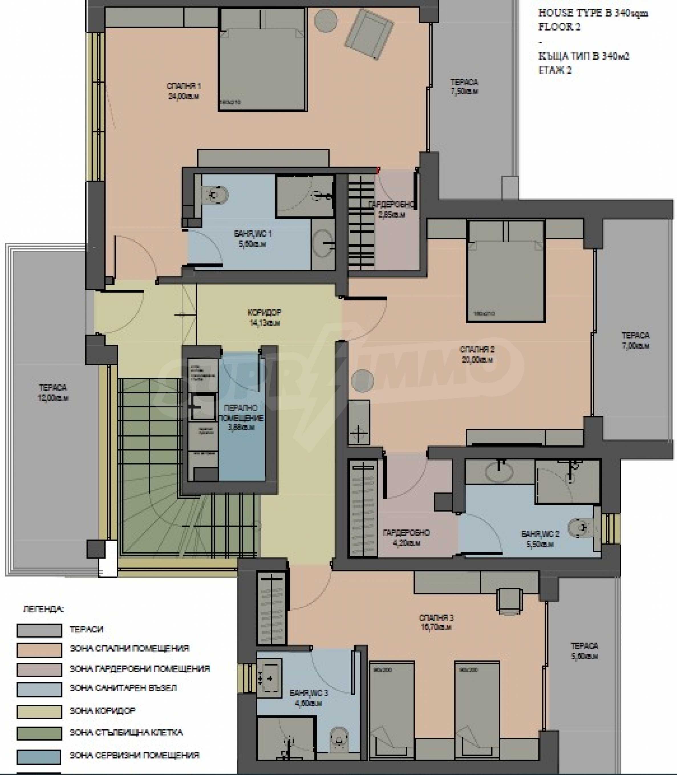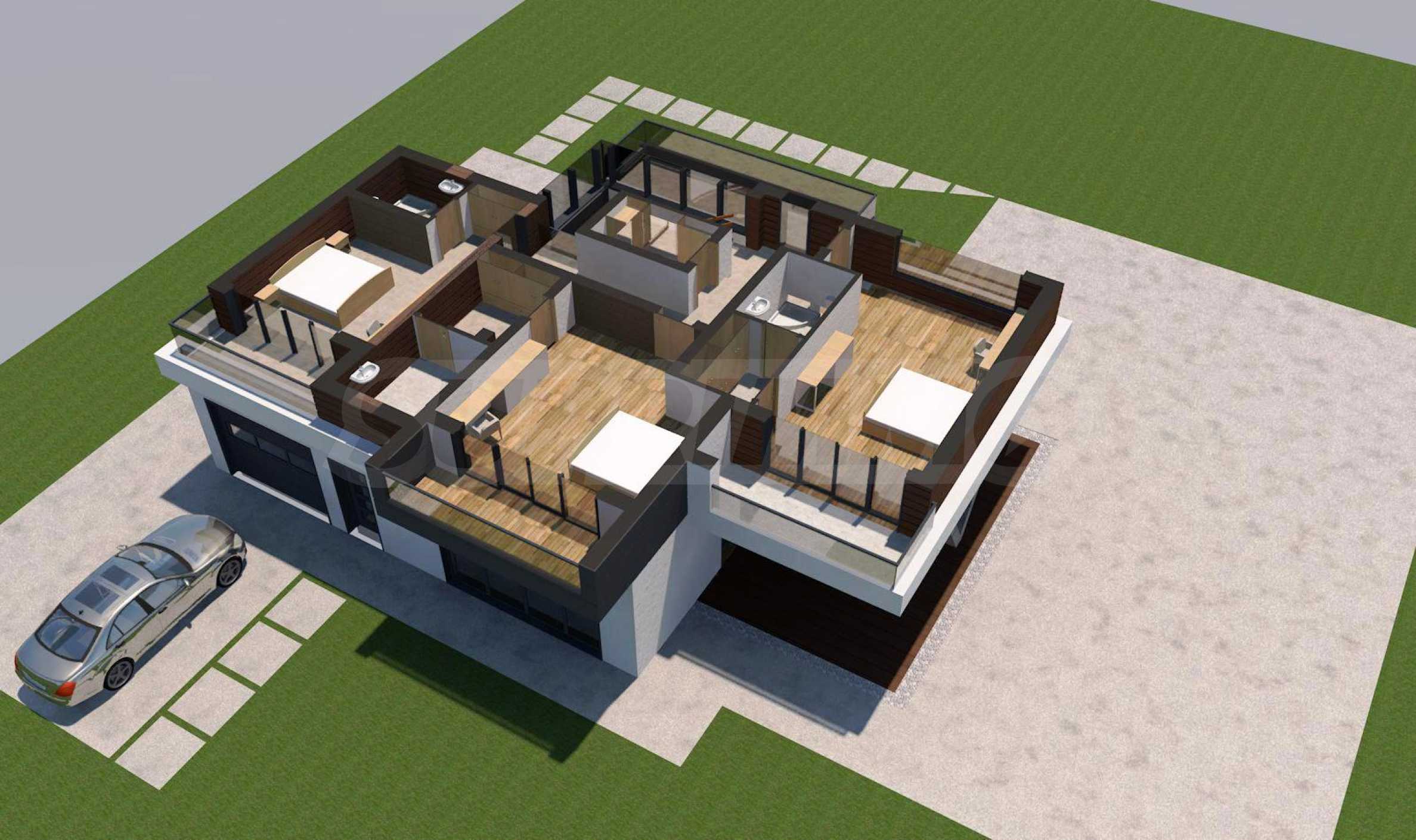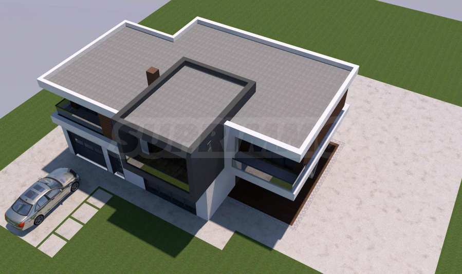 The total area of the property of this type is 340 sq.m and is built on a plot of 682 sq.m. It has a living room with a dining room, two bedrooms, one children's room - each with a bathroom, a covered veranda and a garage.