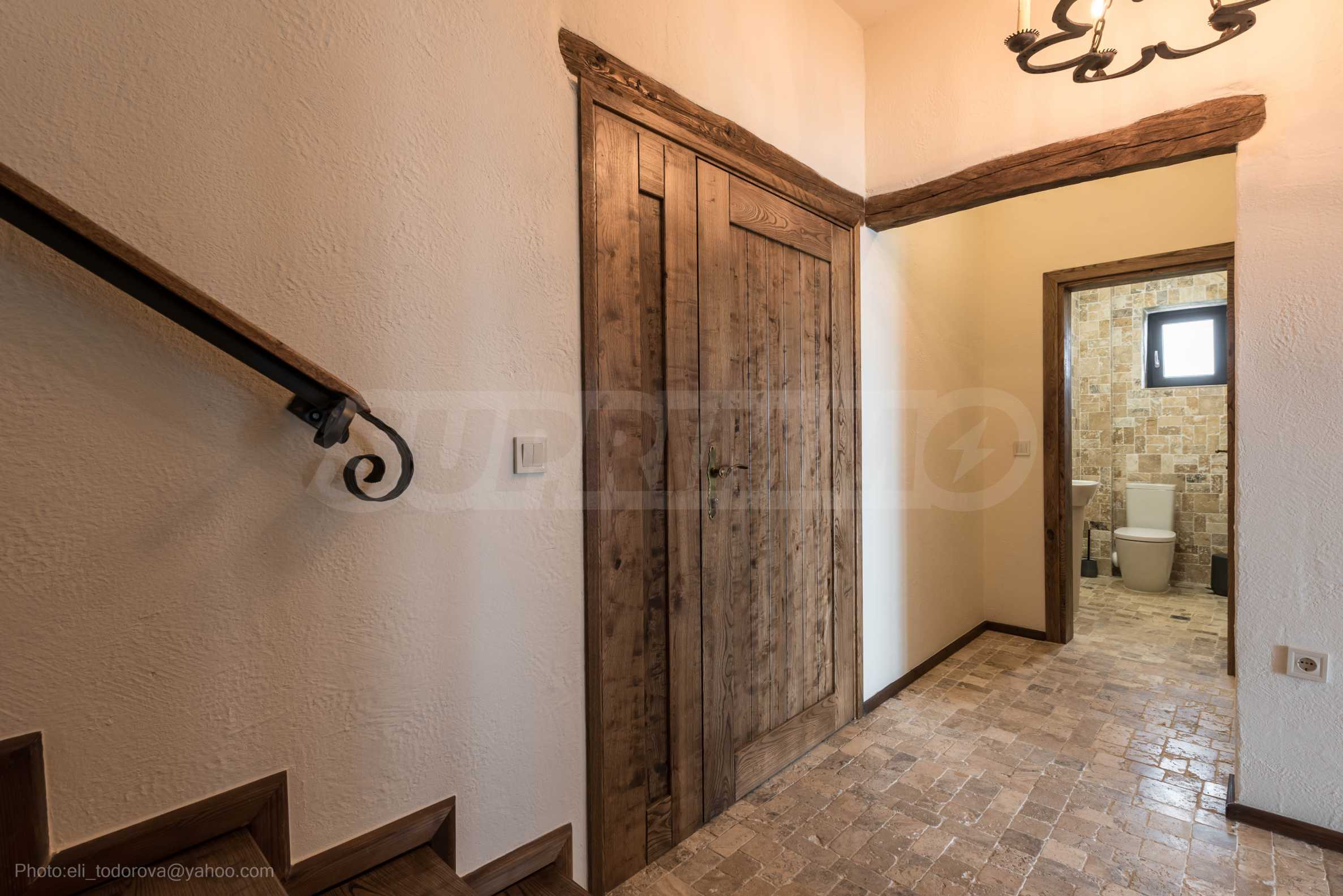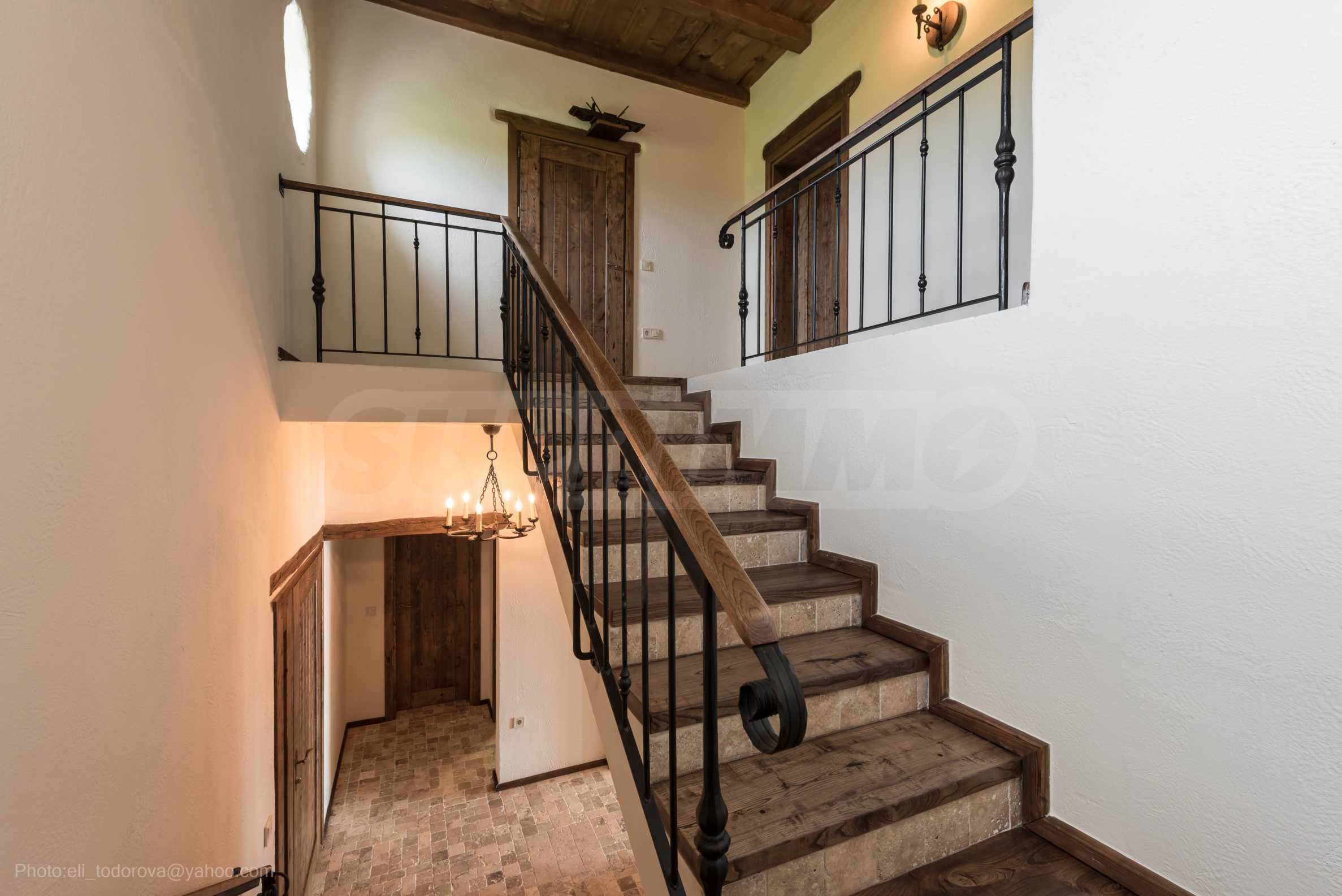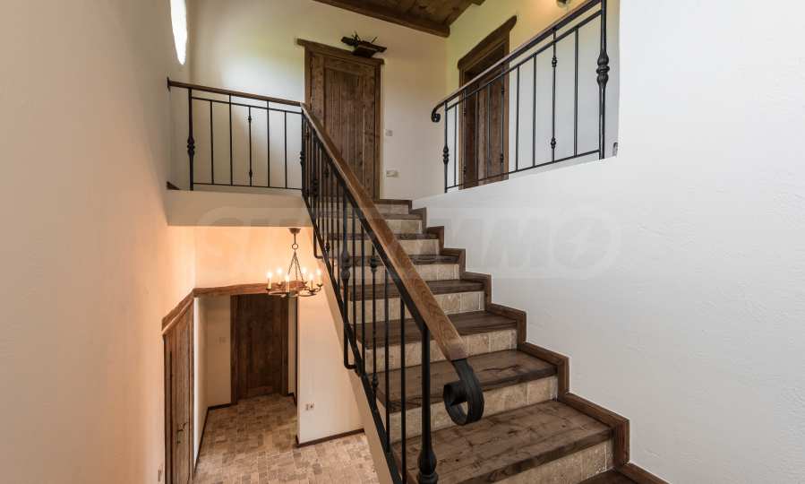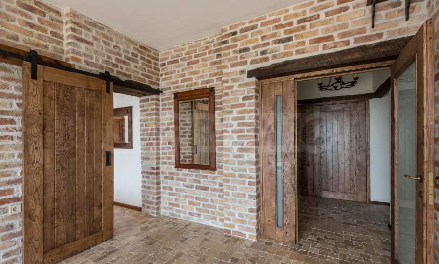 Интерьер дома обставлен меблировкую из массива дуба, которая наполняет уютом и теплом каждый уголок. Двери изготовлены из высококачественного дерева, что дополняет очарование дома.