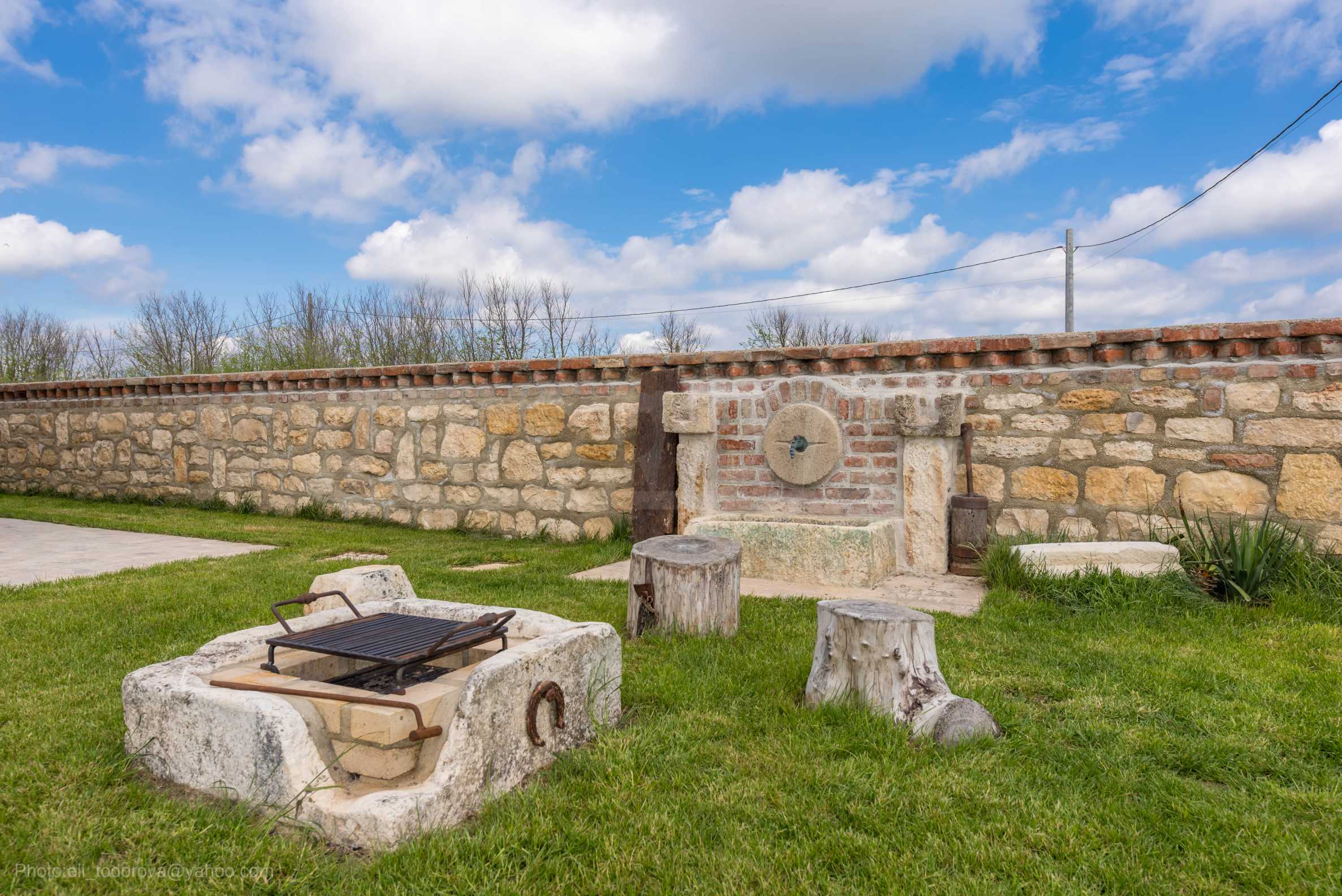 Во дворе дома имеются парковочные места для нескольких автомобилей, уличная каменная мойка, декоративные элементы из подлинных старинных предметов, подчеркивающие уникальность дома, и ухоженная растительность, которая прекрасно вписывается в окружающую природу.