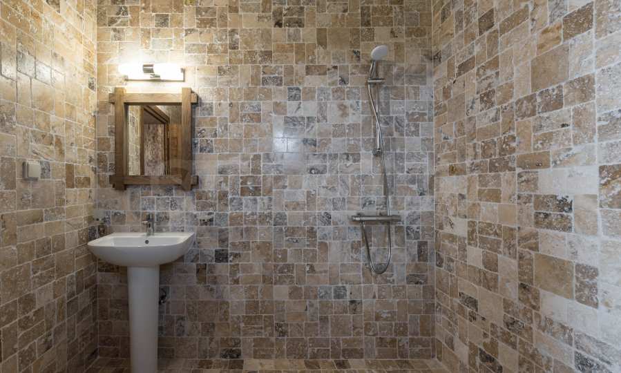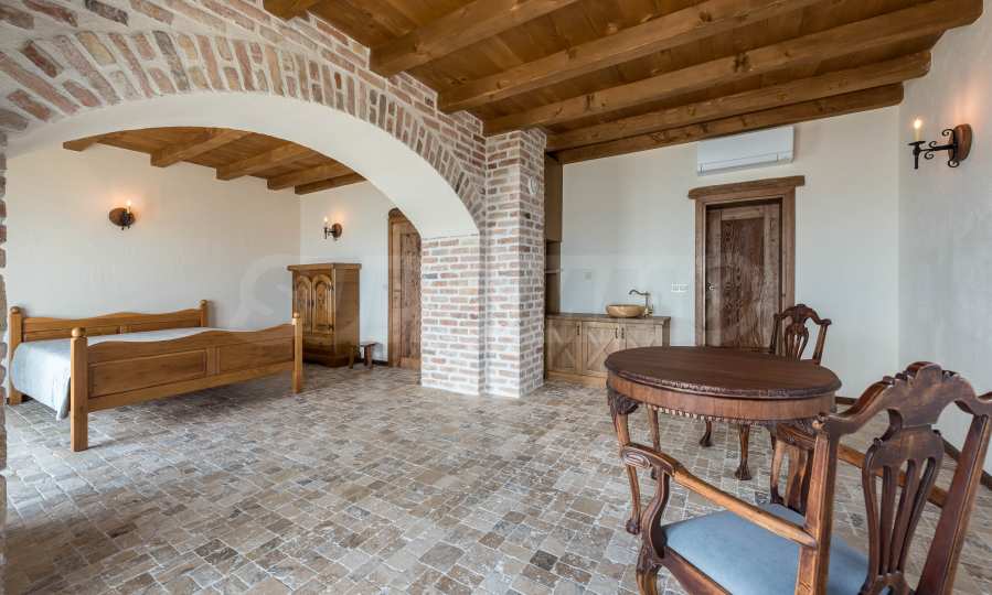 Вилла имеет простую, но выразительную форму, напоминающую крепость, и идеально вписывается в окружающую среду. Она позволяет объединить современный комфорт и роскошь с непреходящей исторической ценностью в уникальном симбиозе. Среди исключительных деталей, сохраняющих историческую ценность объекта, – раковина из оникса в главной спальне и элементы римской эпохи по всему дому.