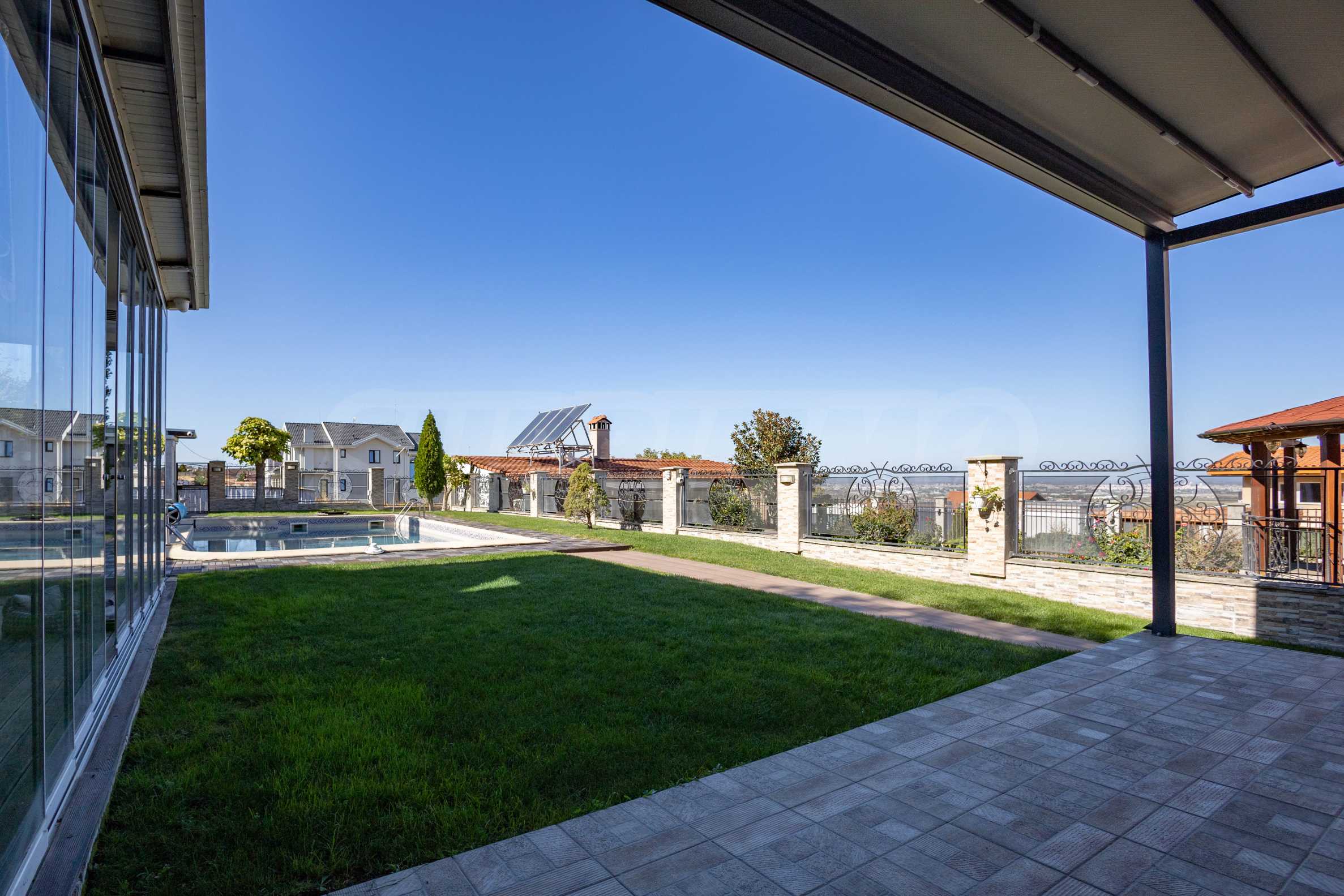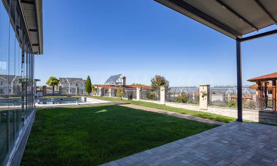 Отсюда есть прямой выход на открытую веранду, летнюю кухню с барбекю и внешний бассейн, что создает идеальное пространство для развлечений на свежем воздухе или спокойного отдыха в саду.