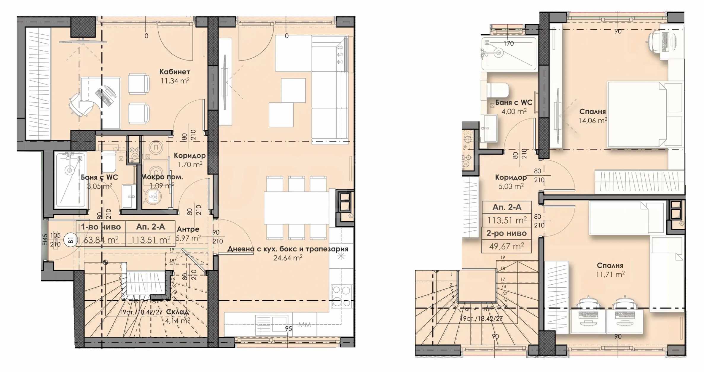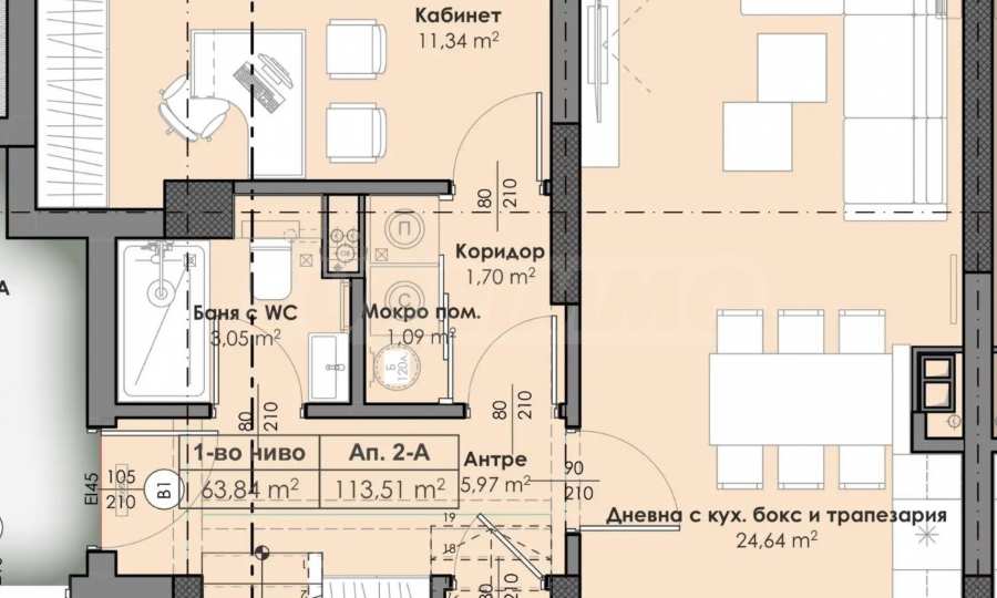 Квартира расположена на 1 и 2 этаже из 9 и имеет общую площадь 138,12 кв. м. Продается с высококачественной отделкой по болгарским стандартам (на шпаклевке и стяжке).