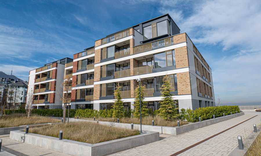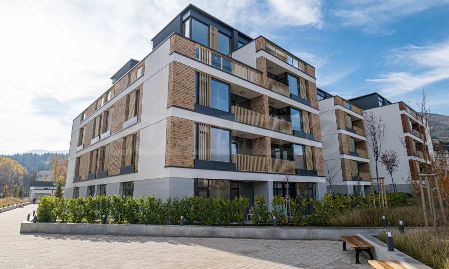 Архитектура комплекса гармонирует с окружающей средой, а фасады отделаны натуральными материалами, такими как дерево и камень, что обеспечивает современный вид, отличную изоляцию и долговечность.