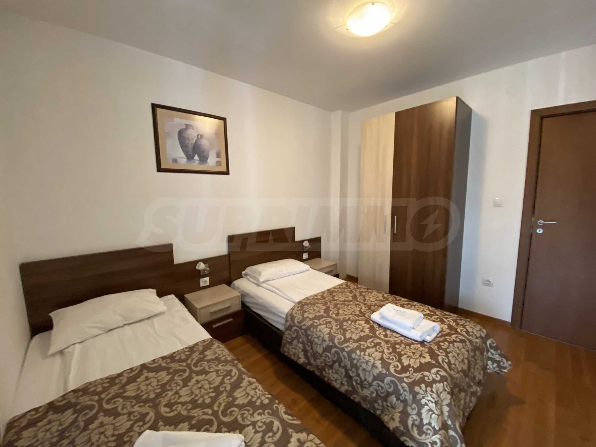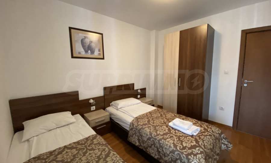 Две спальни, одна из которых с большой спальней, меблирована прикроватными тумбочками, туалетным столиком, телевизором и шкафом. Во второй спальне — две односпальные кровати, прикроватные тумбочки, шкаф для одежды, телевизор.