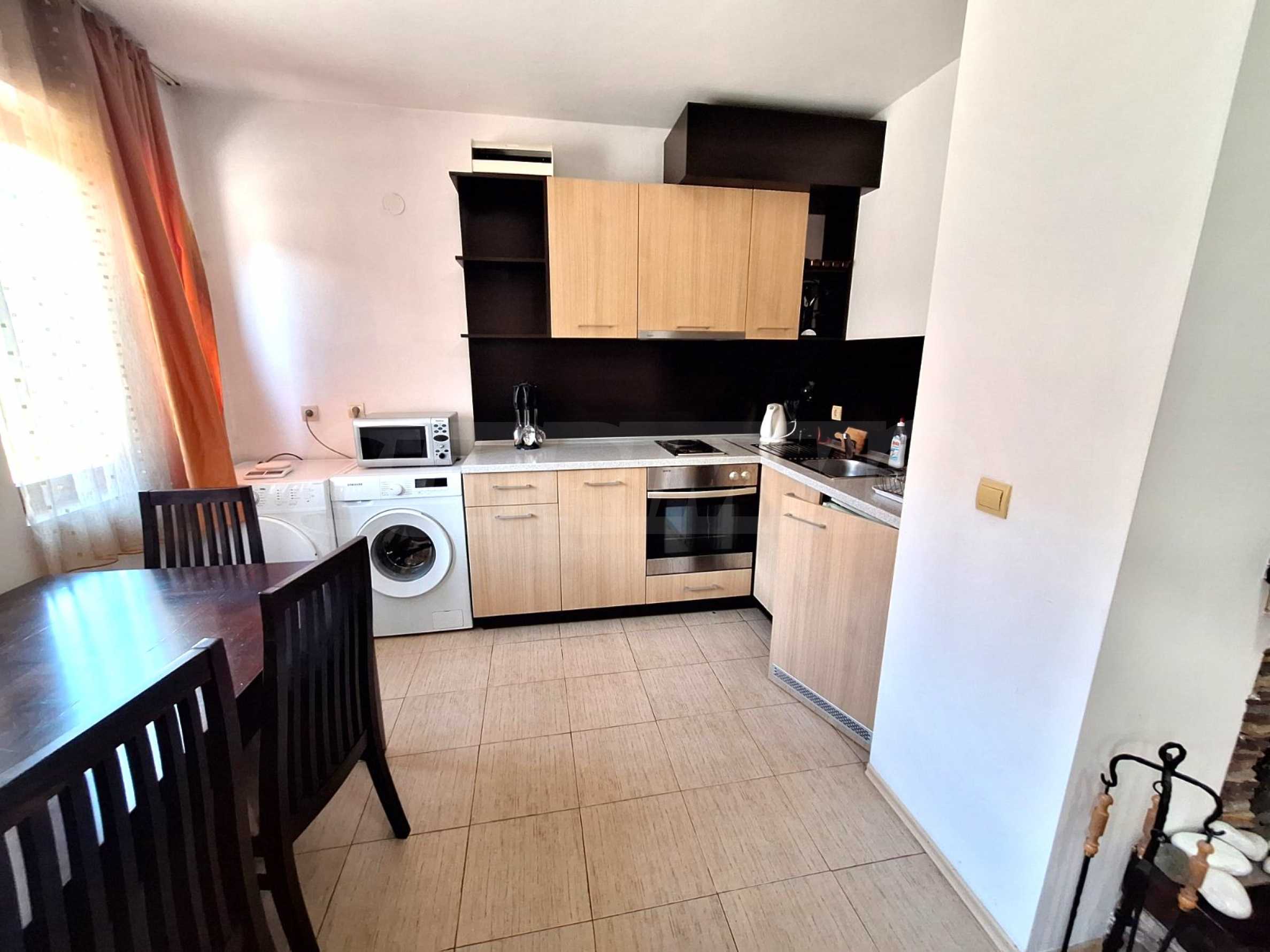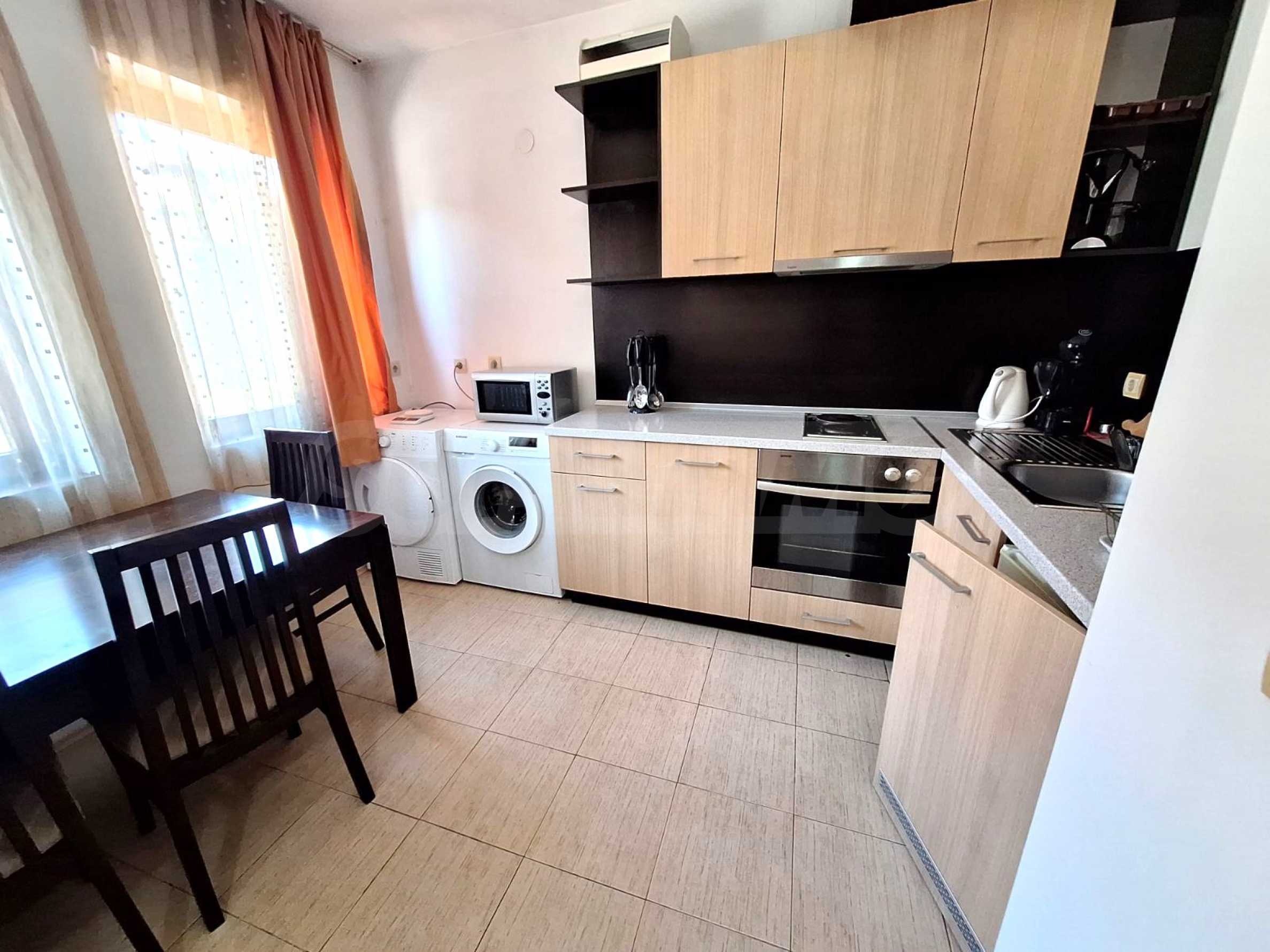 Мини-кухня оборудована электрической плитой с 4 конфорками, вытяжкой, микроволновой печью, холодильником, стиральной машиной, сушилкой, тостером, электрическим чайником и кухонными принадлежностями;