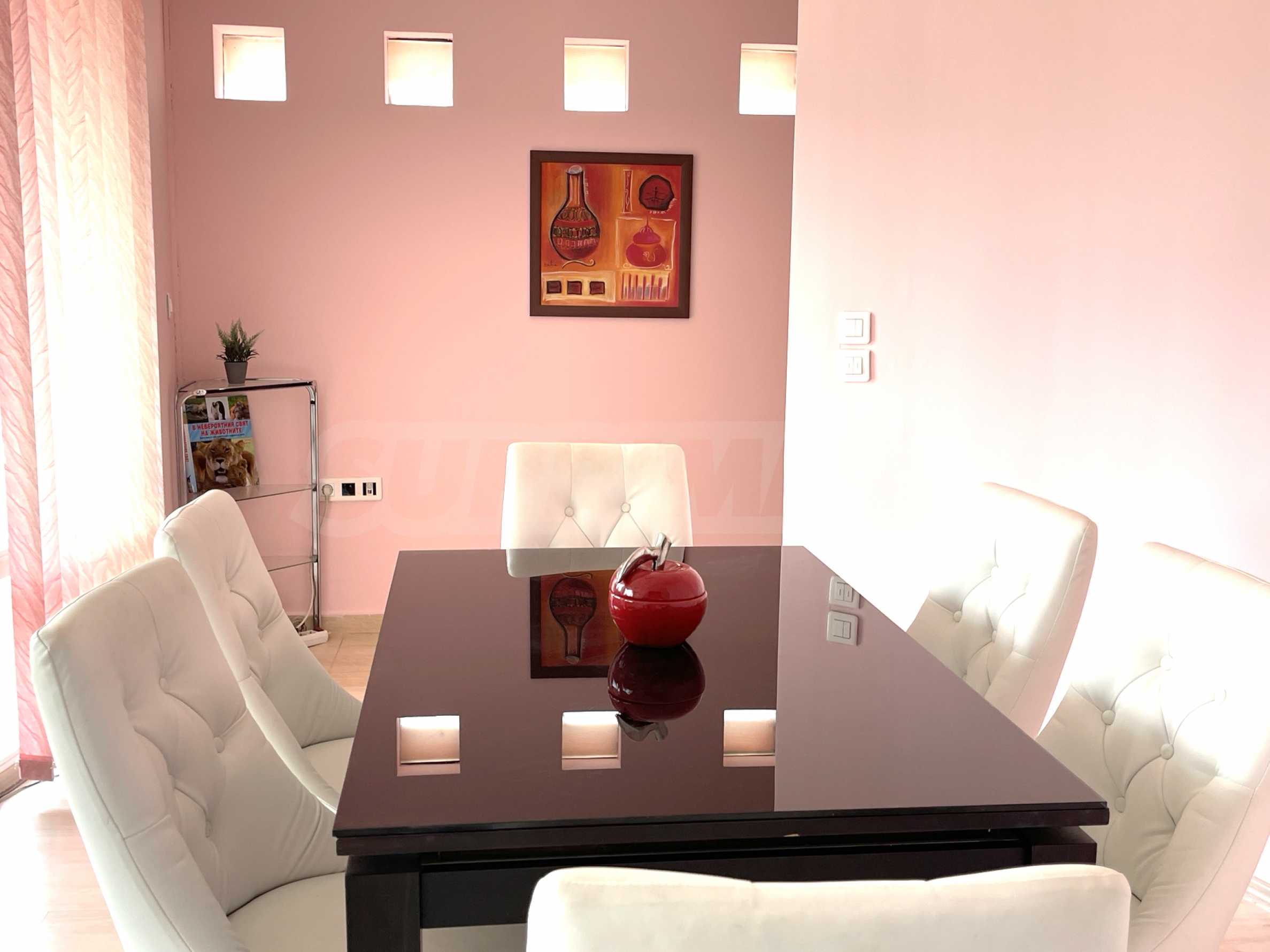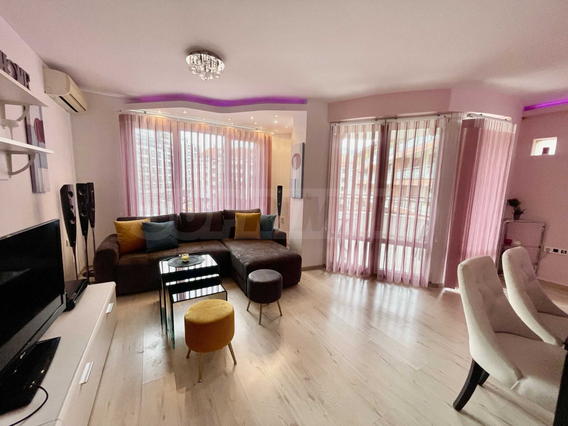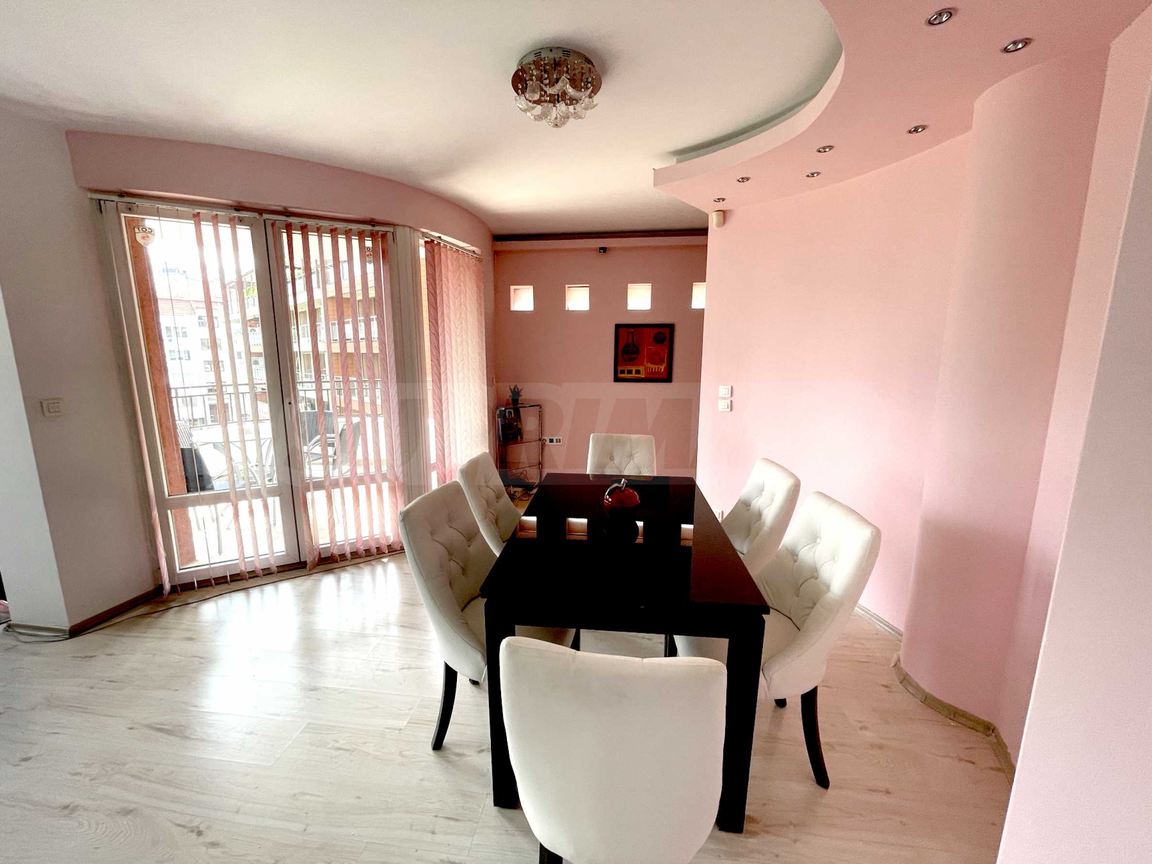 - Светлая гостиная с частично французскими окнами – обеденный стол, диван с журнальным столиком, телевизор, кондиционер и зона отдыха;