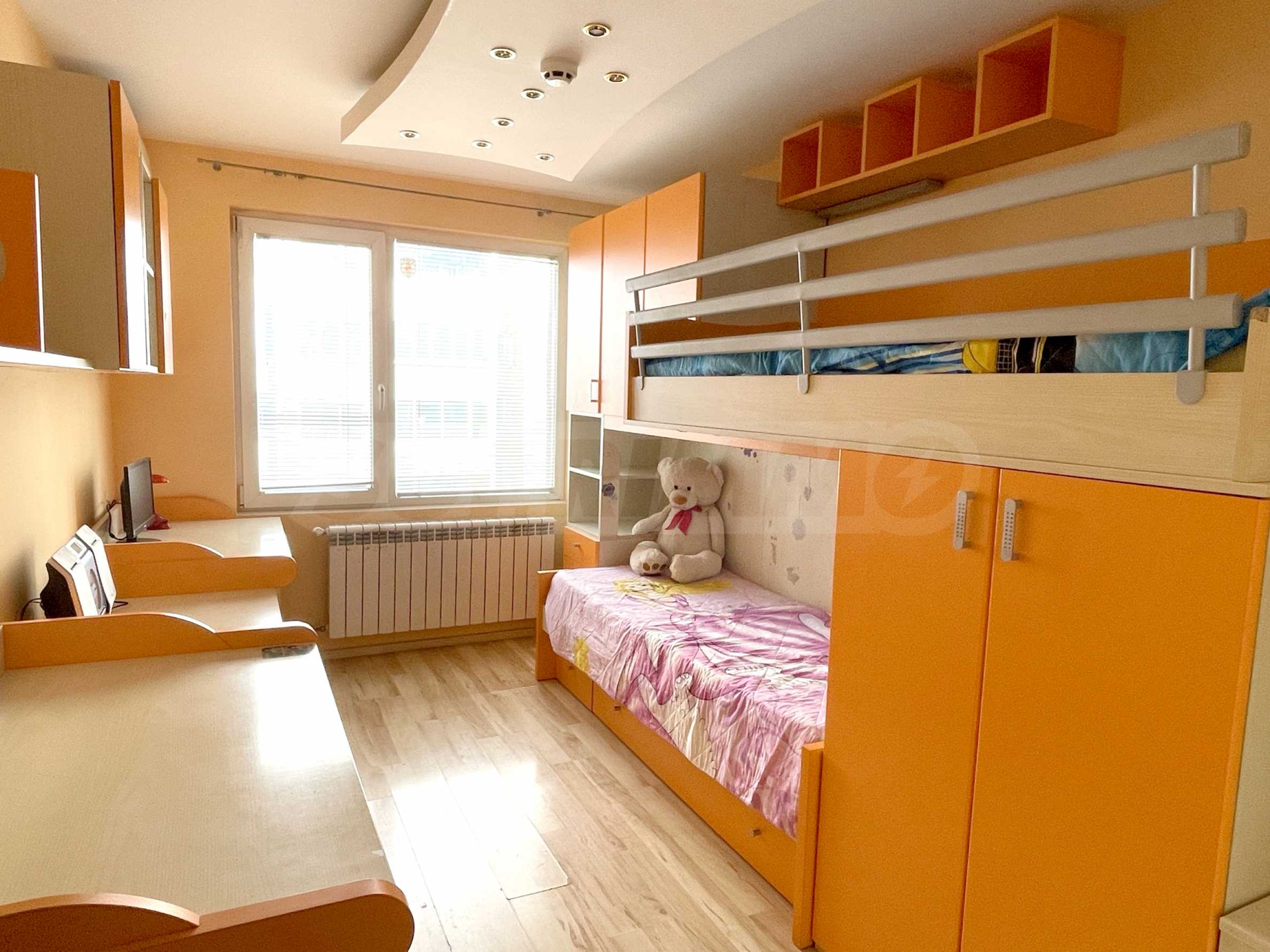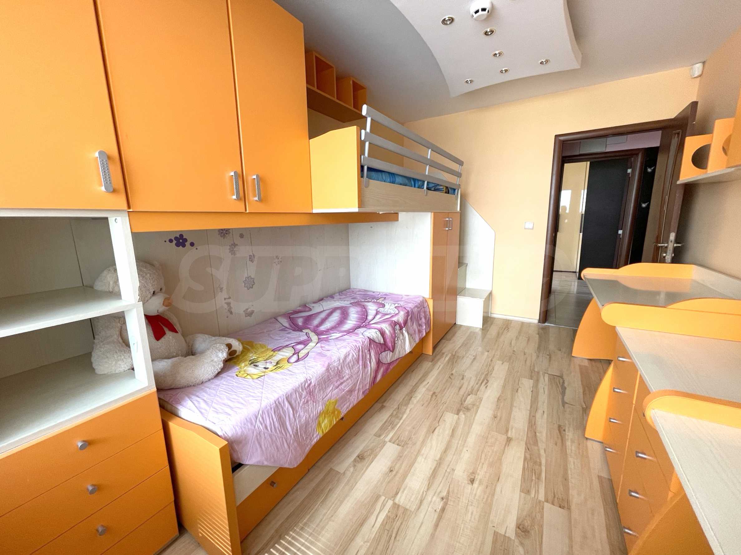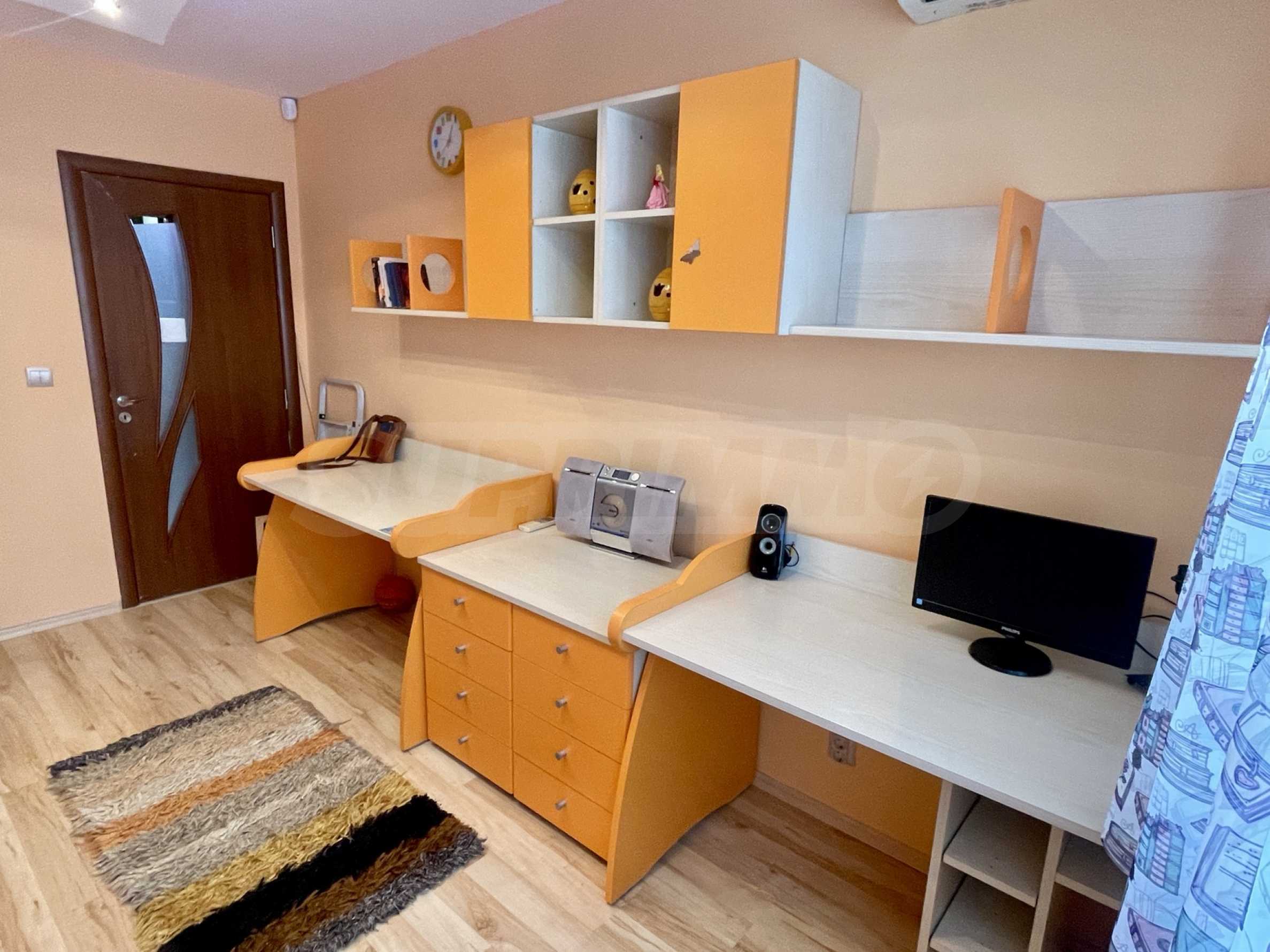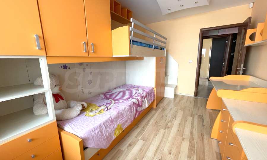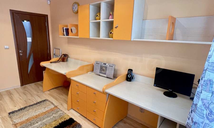 - Детская комната - двухъярусная кровать в специальном углу с лестницей, два письменных стола с контейнерами, два книжных шкафа, гардероб, кондиционер и вторая ванная комната для детей рядом с комнатой;