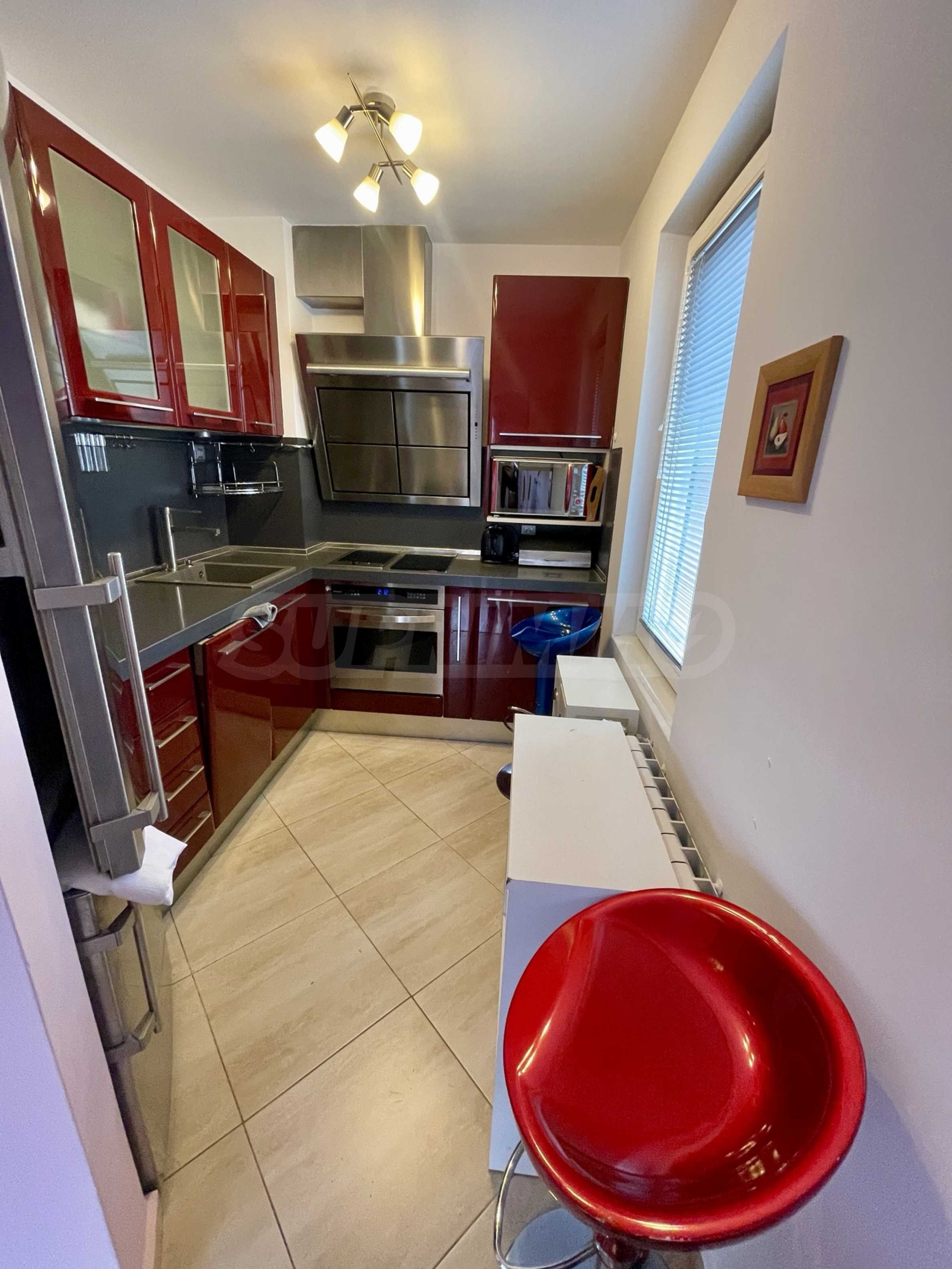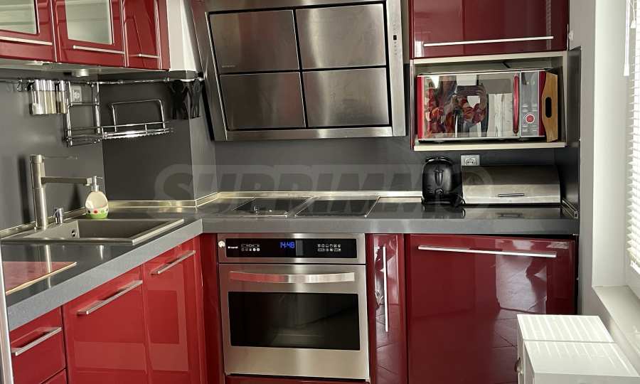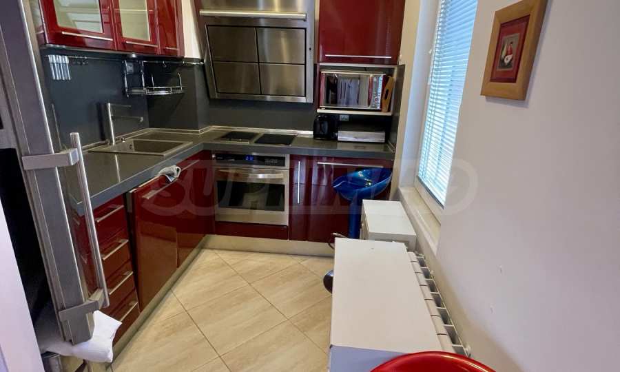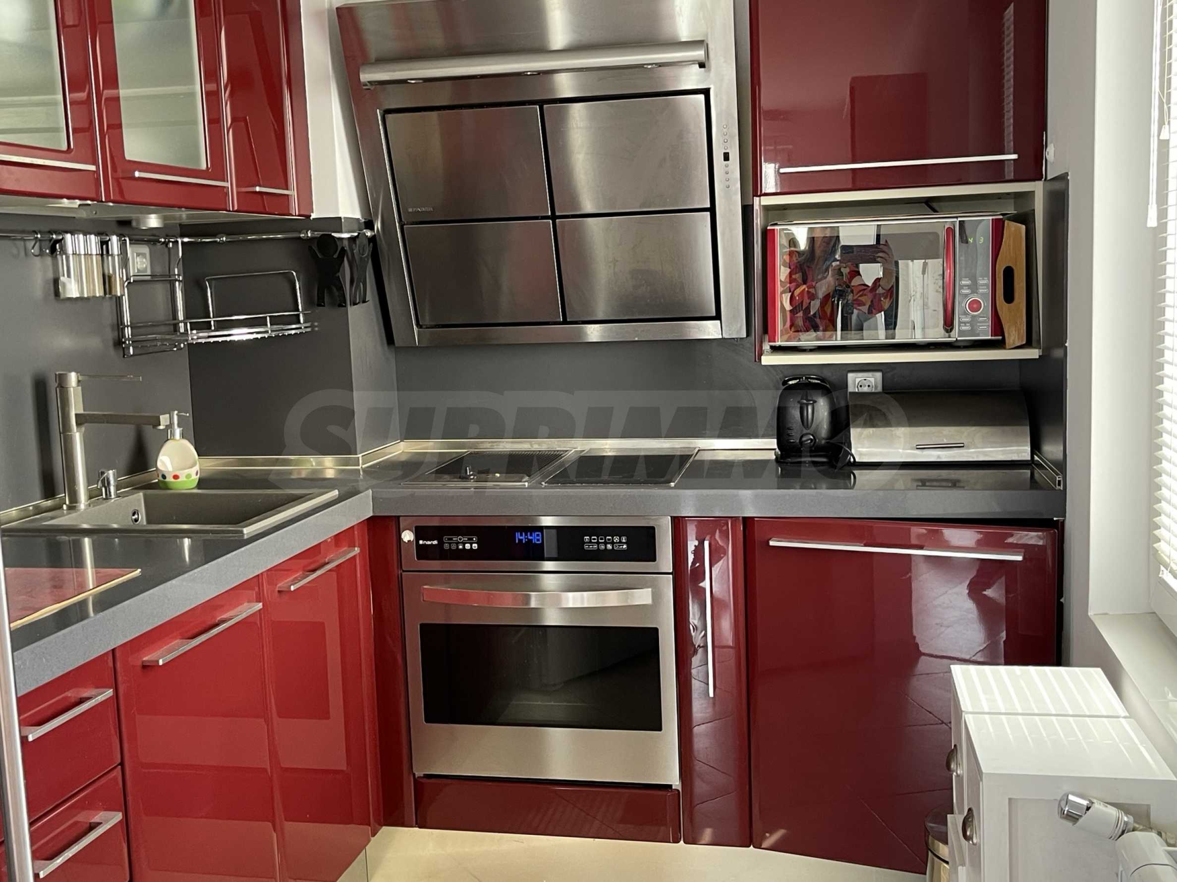 - Кухня обставлена итальянской меблировкую и оснащена качественной бытовой техникой: посудомоечной машиной, духовкой, стеклокерамической варочной панелью и стеклокерамическим грилем, микроволновой печью, большим холодильником, стиральной машиной с сушилкой.