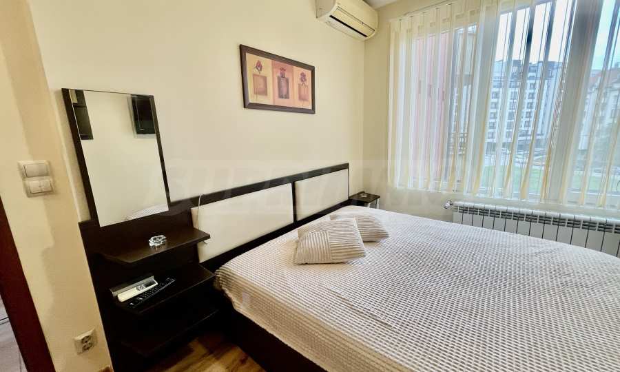 - Главная спальня с собственной ванной комнатой – двуспальная кровать с поднимающимся матрасом, телевизор, шкаф для одежды, встроенный сейф, кондиционер;