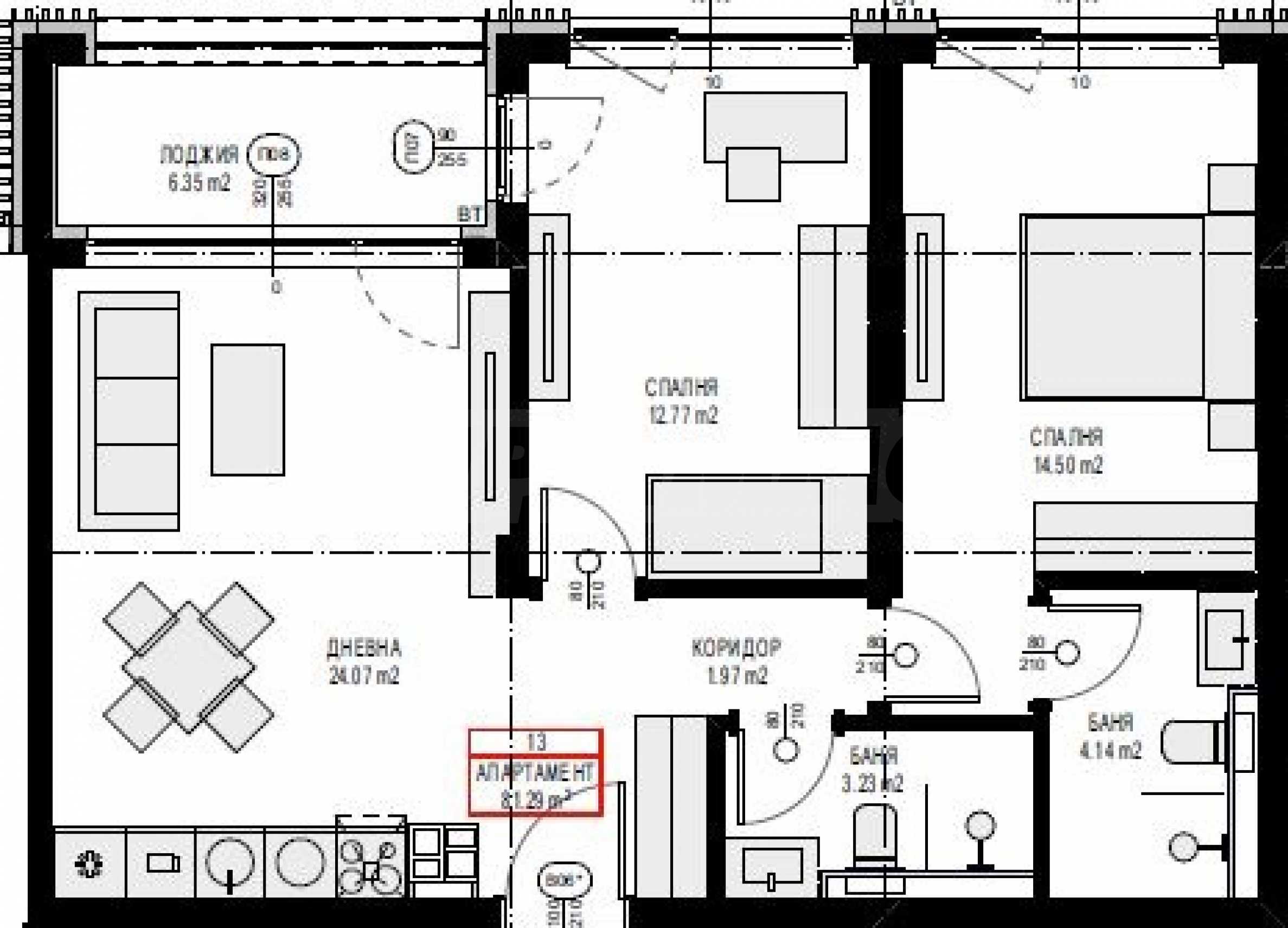 Квартира № 13 расположена на 3-м этаже, выходит окнами на запад и имеет общую площадь 95,18 м2.