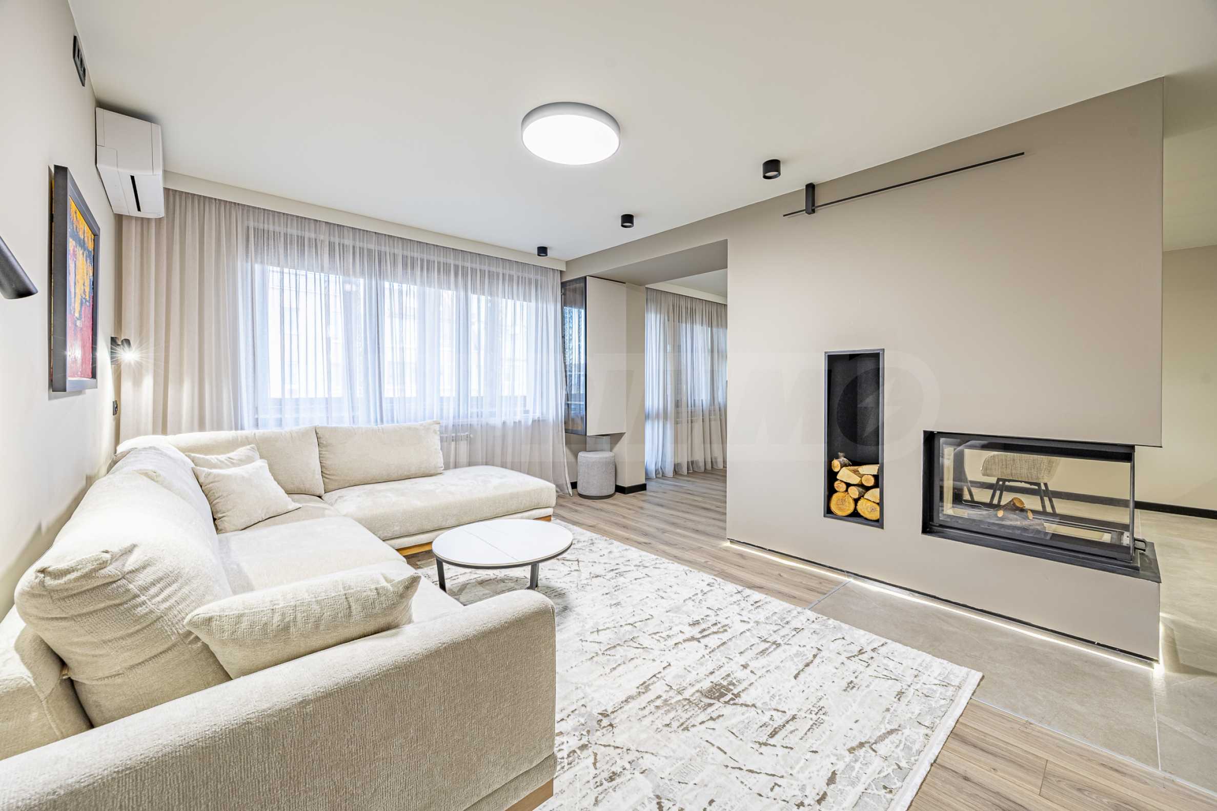 • просторная и светлая гостиная с современным камином;