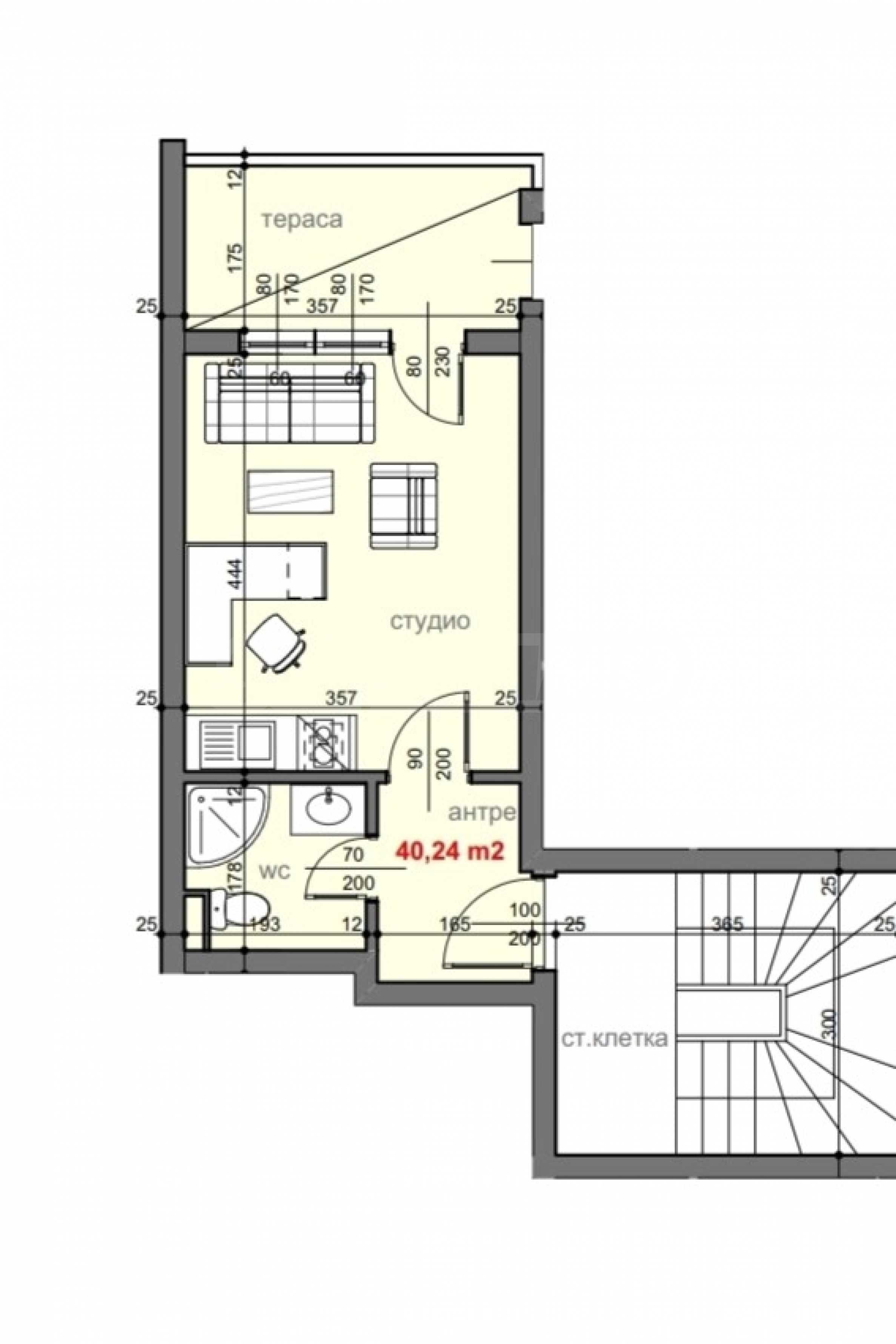 Квартира общей площадью 40,24 кв. м расположена на 1 этаже с террасой.