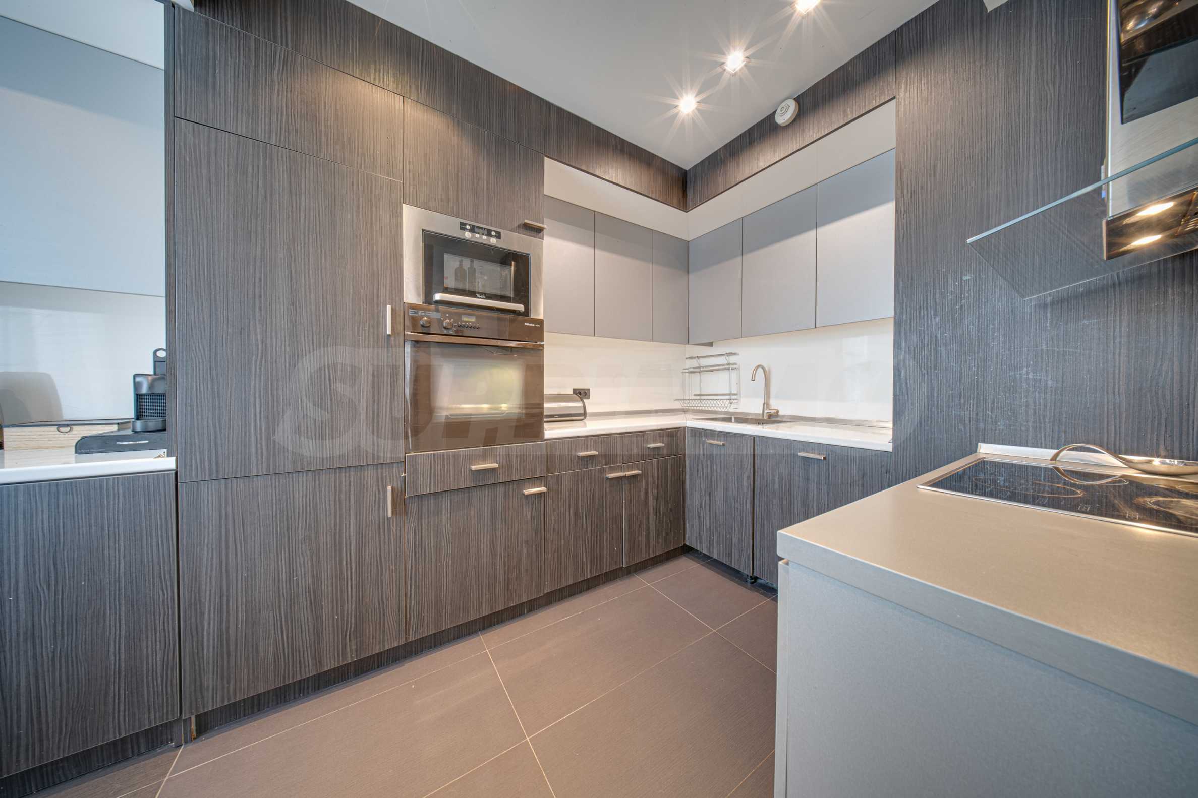 • Мягкая меблировку, обеденный стол с шестью стульями, журнальный столик, тумба под ТВ; светодиодные светильники «Philips», встроенная кухня; холодильник «Liebherr», духовой шкаф «Miele», варочная панель с конфоркой «Miele», микроволновая печь «Whirlpool»; вытяжка «Elica», посудомоечная машина «Miele», стиральная машина «Miele», сушилка «Miele», кровати, встроенные шкафы, письменный стол, тумбы, шторы, светильники и т. д.