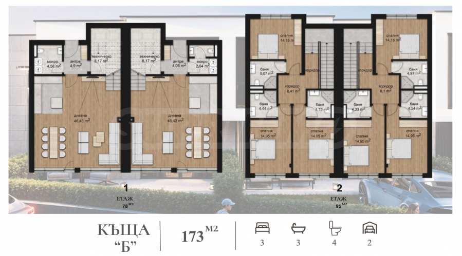 Общая площадь объекта составляет 173 кв. м, собственный двор площадью 198 кв. м, с двумя парковочными местами и следующая функциональная планировка: