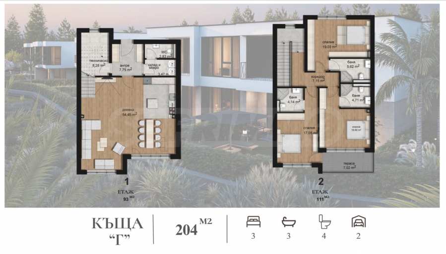 Общая площадь объекта недвижимости составляет 204 кв. м, собственный двор площадью 211 кв. м, с двумя парковочными местами и следующая функциональная планировка:
