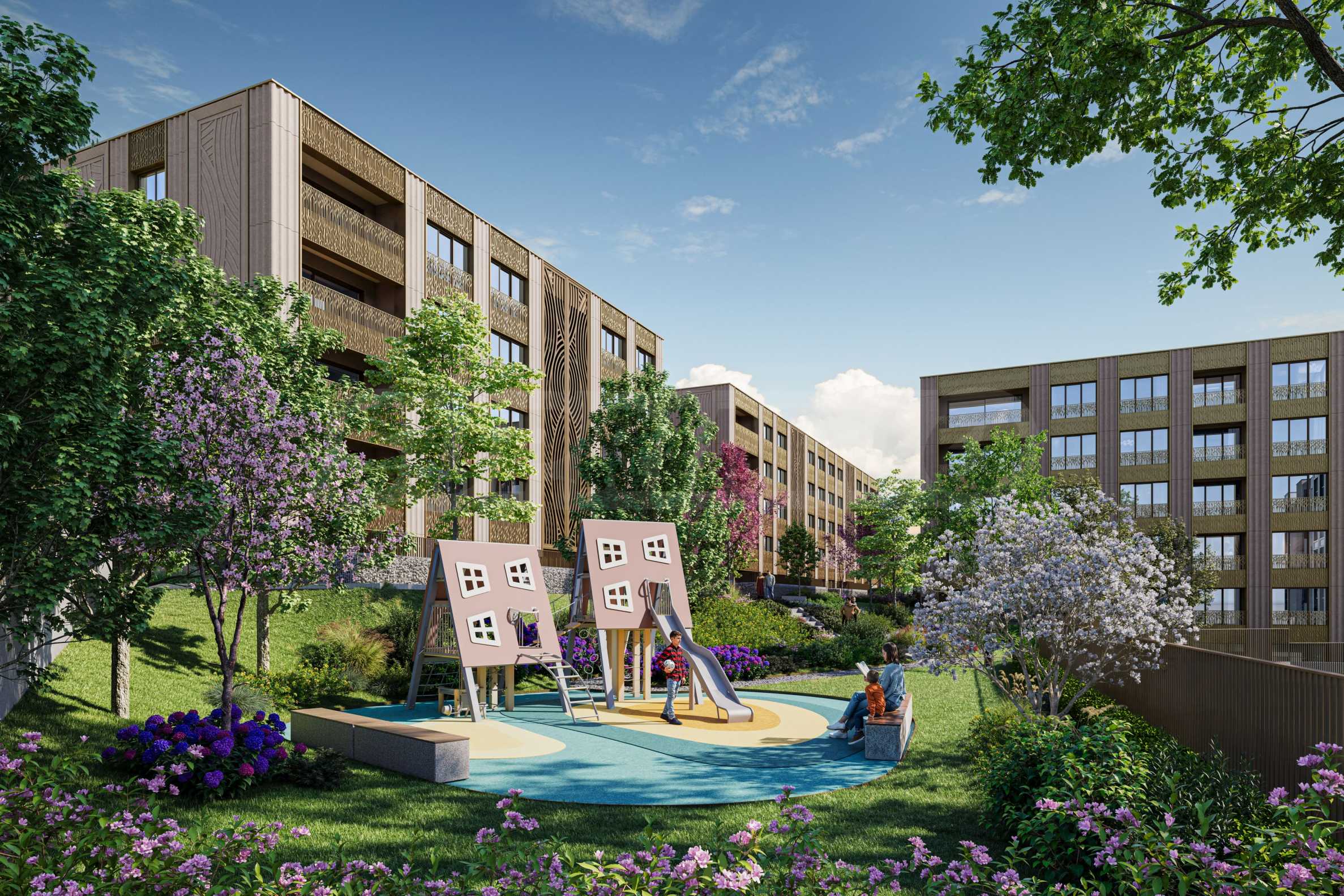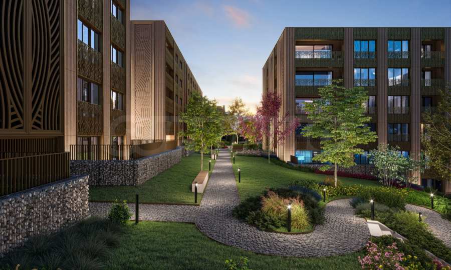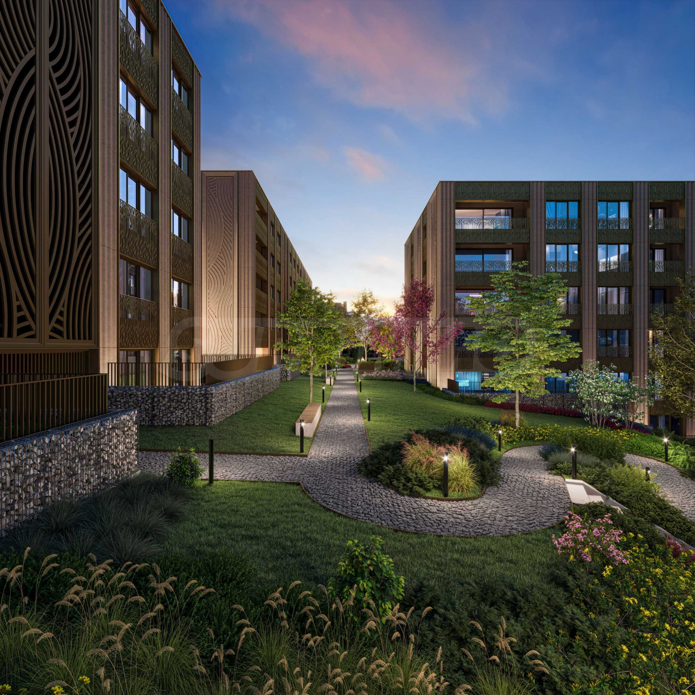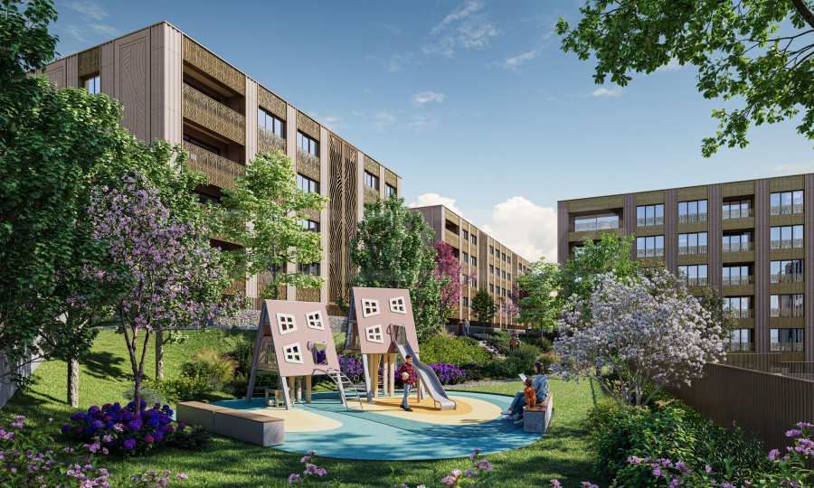 На огороженной территории площадью почти 8 акров мы строим 2 малоэтажных жилых дома по 5 этажей каждый. В наличии около 110 квартир, которые спроектированы таким образом, чтобы их можно было легко объединить с соседними домами, учитывая интерес покупателей из более крупных районов. Также предлагаются несколько квартир на первом этаже с просторными внутренними двориками с ландшафтным дизайном. Предусмотрена парковка в подземном гараже на 2 уровнях, где для каждой квартиры достаточно парковочных мест, и, как правило, на каждую квартиру можно приобрести 2 парковочных места. Вся территория обеспечена подземными дорогами, поэтому автомобили не проезжают по территории вокруг зданий. Таким образом, остается достаточно места для большого, пышно озелененного двора, который дополняет общую концепцию спокойной жизни у гор. Также имеется магазин – коммерческое помещение, а также небольшая площадка с несколькими офисами.