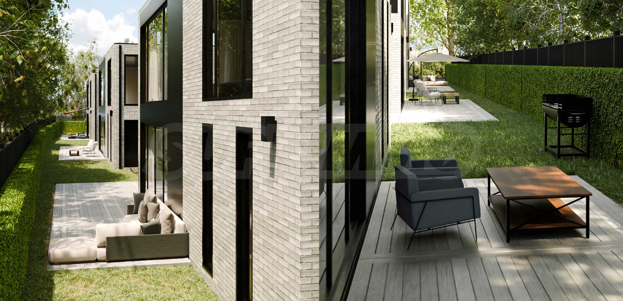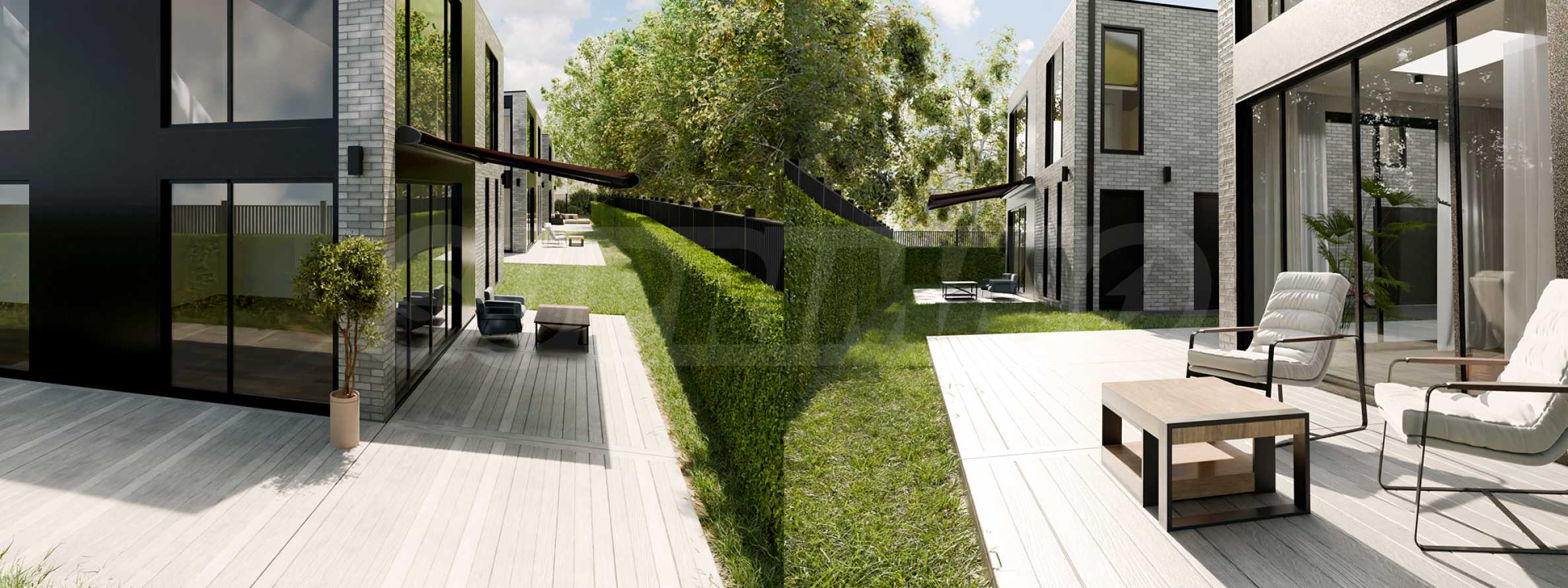 Проект представляет собой мини-комплекс из трех независимых одноквартирных домов, расположенных на регулируемом земельном участке площадью 1076 кв. м. Каждый дом имеет собственный двор, отдельный подъезд, парковочное место на открытом воздухе и гараж. Расстояние между зданиями составляет 7,2 м, что обеспечивает отсутствие прямой видимости между основными жилыми помещениями.