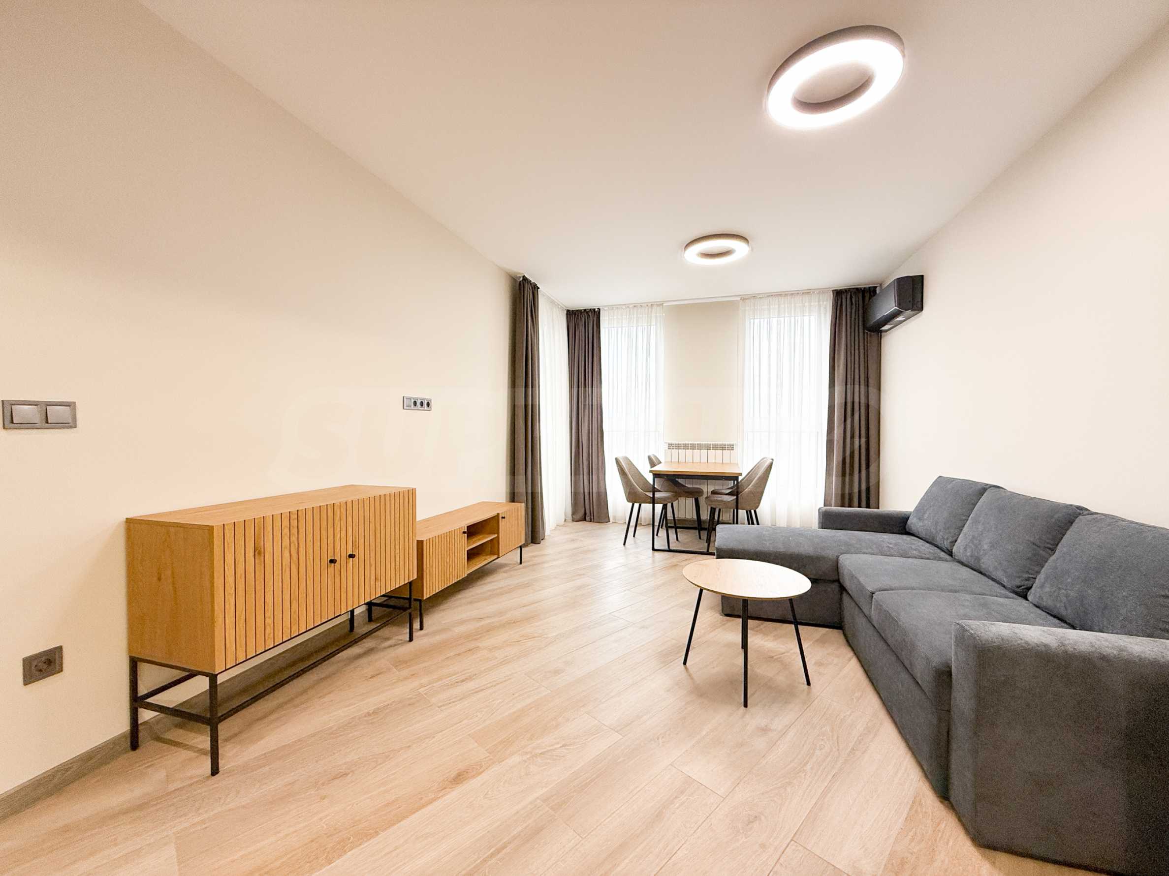 • Светлая гостиная предлагает комфортное пространство для отдыха. Она оборудована удобным диваном, двумя тумбами под телевизор, низким журнальным столиком и обеденным столом со стульями.