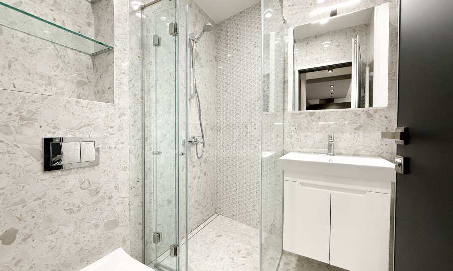 • Ванная комната оборудована высококачественной стильной сантехникой, включая унитаз, раковину и душевую кабину.