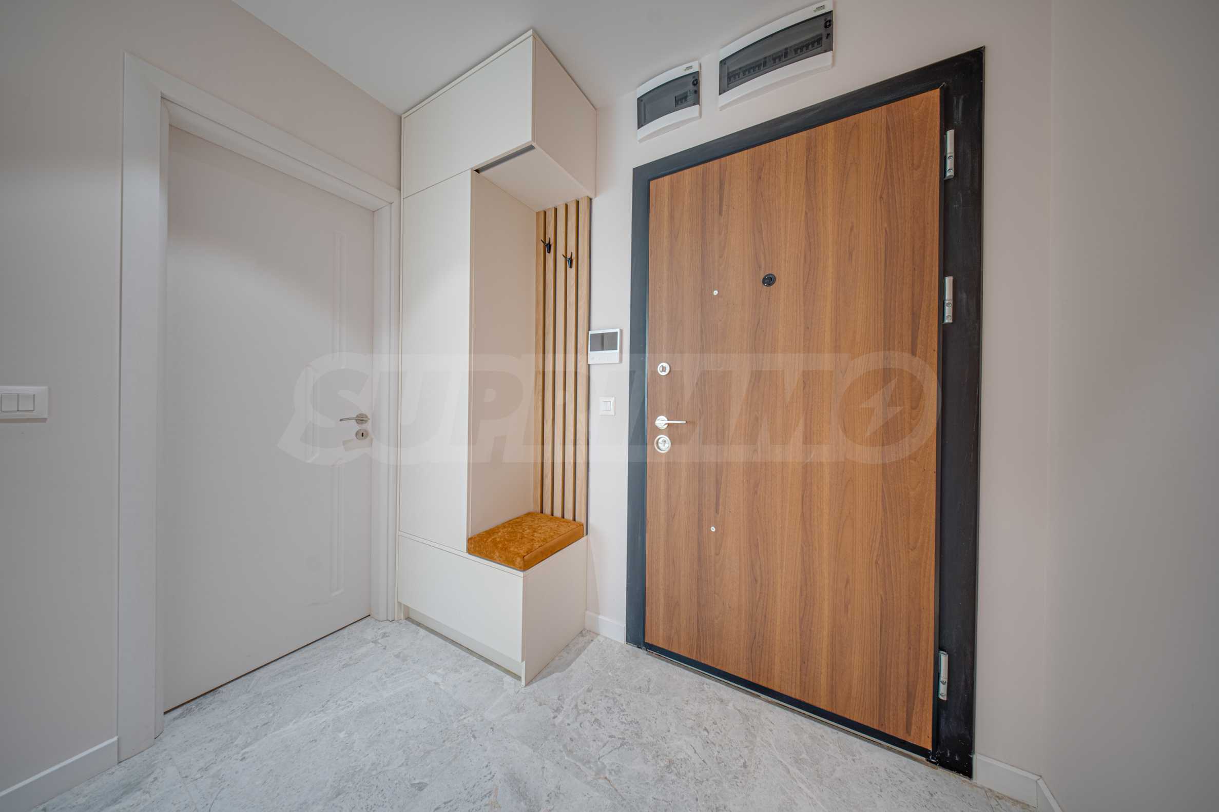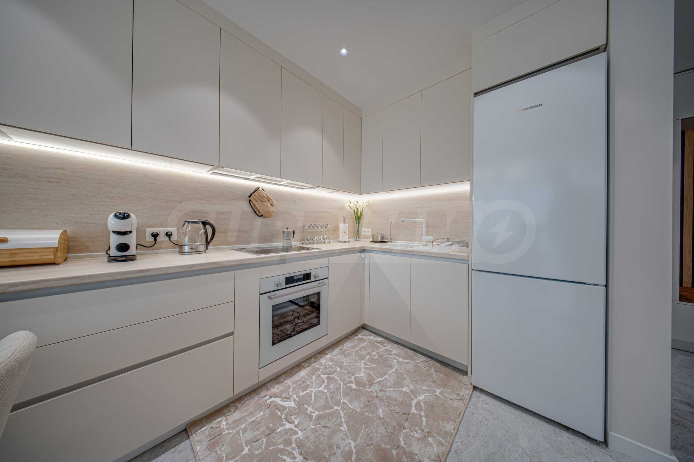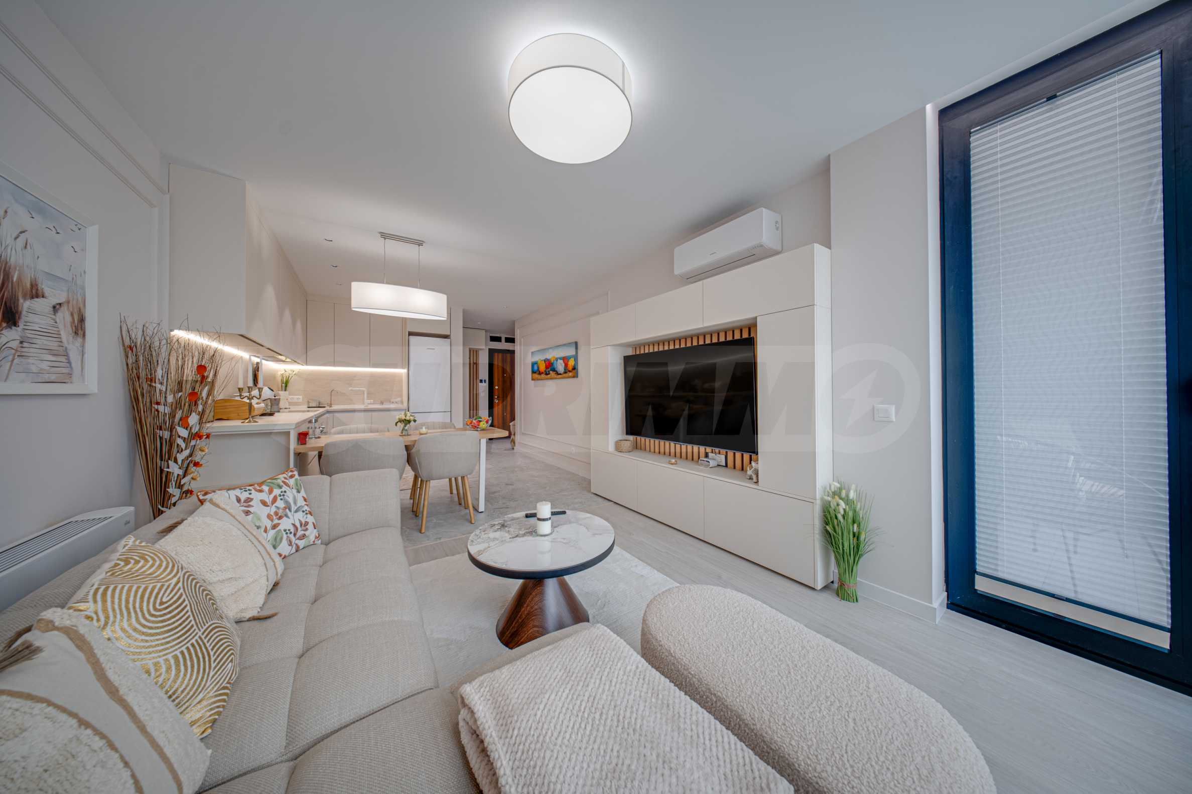 Квартира расположена на 7-м этаже, полностью ориентирована на юг и имеет вид на гору Витоша и внутренний двор комплекса. Квартира новая, обставлена высококачественной меблировкую и бытовой техникой, подобранной с вниманием к деталям и комфорту.