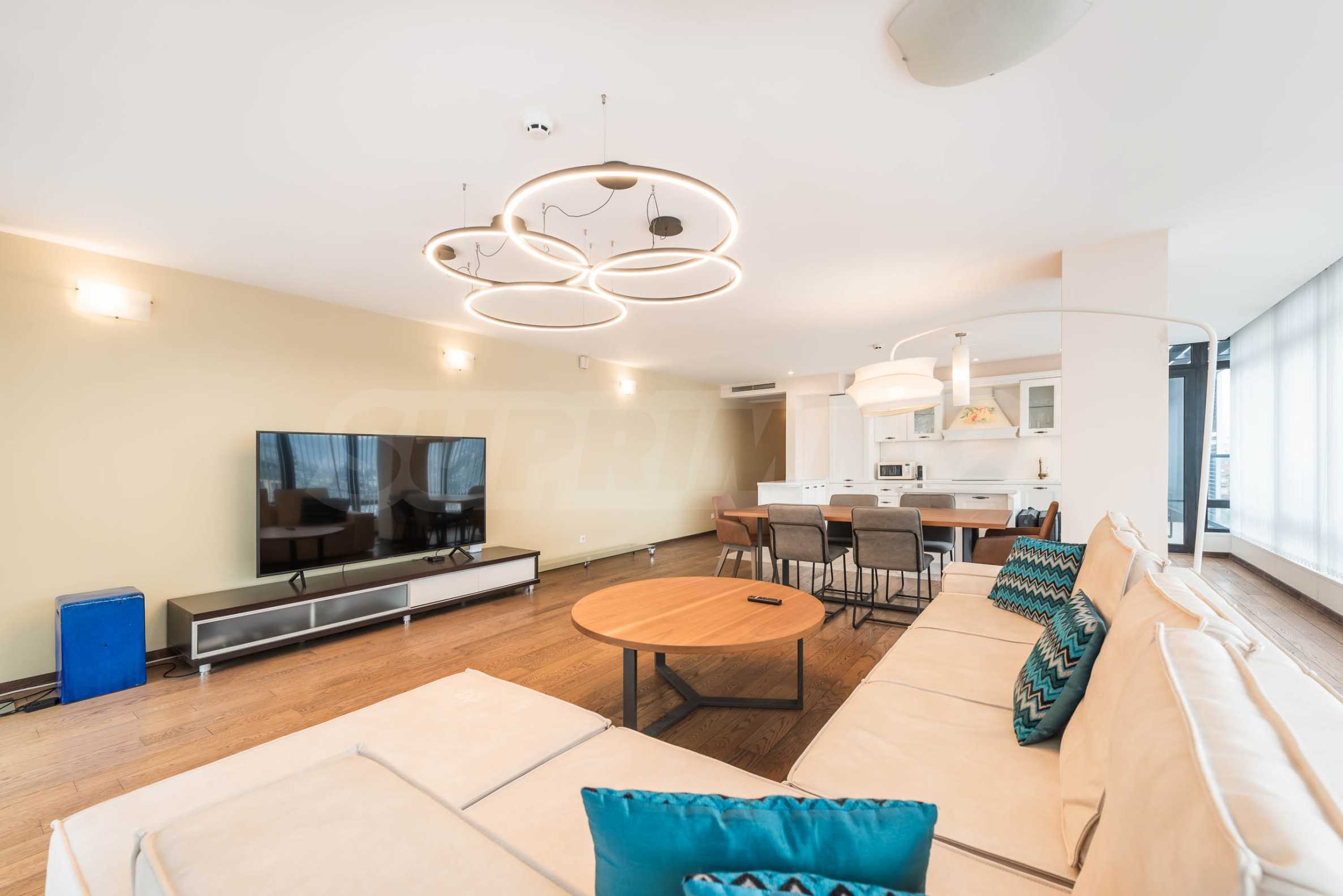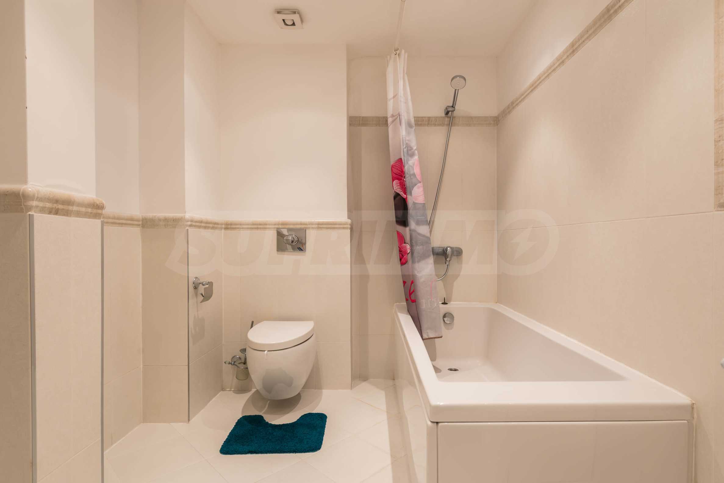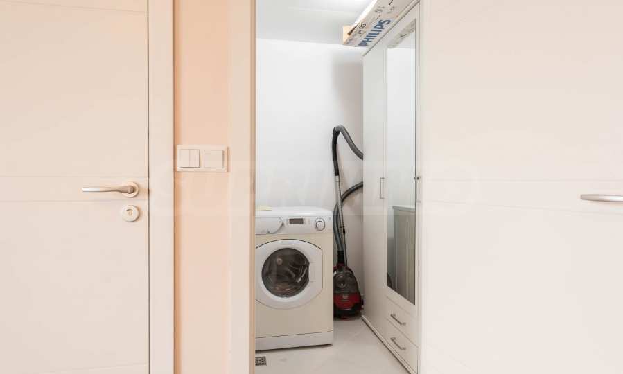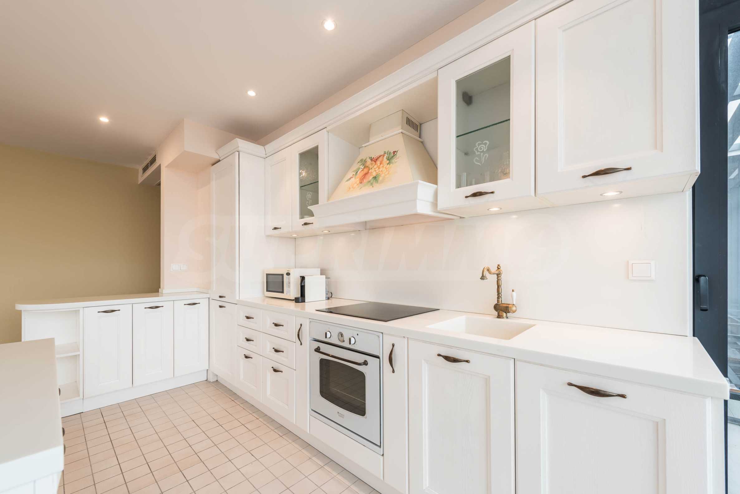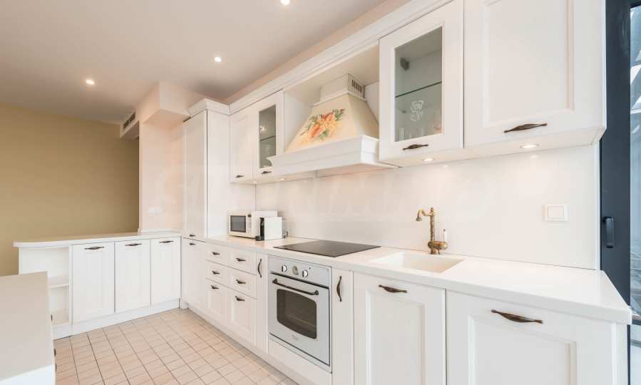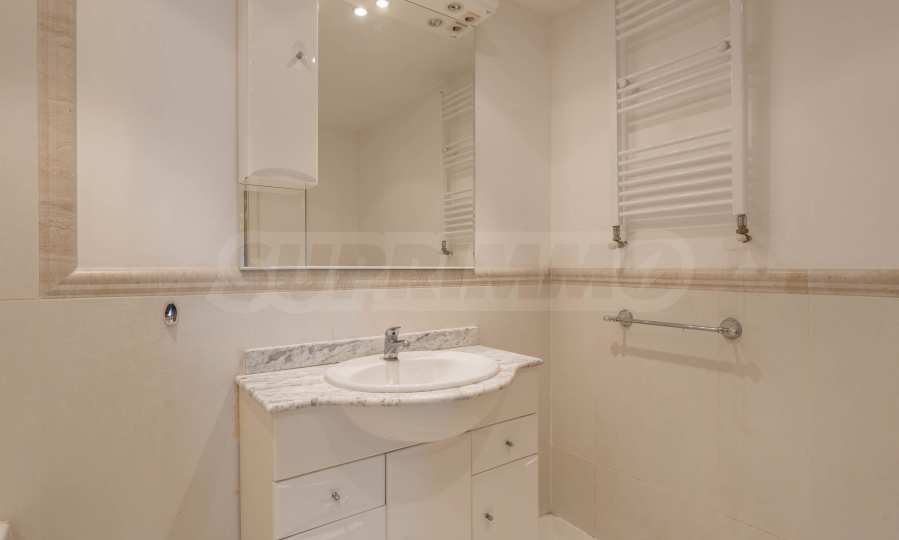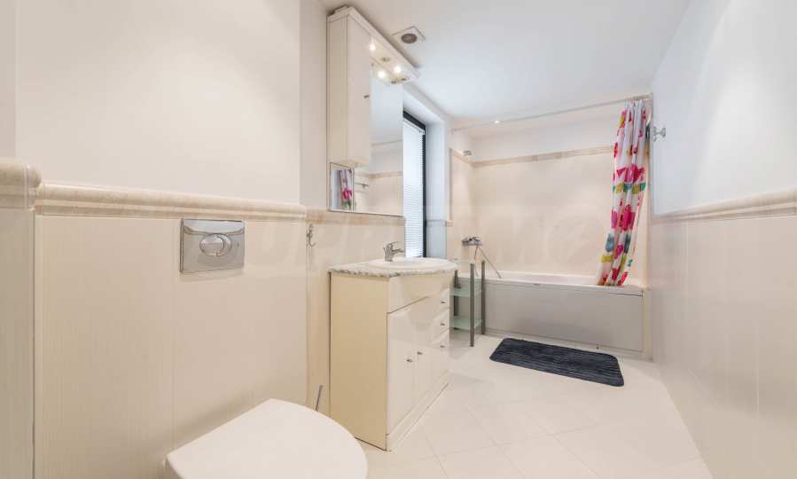 Квартира обставлена качественной и функциональной меблировкую и бытовой техникой. Интерьер выполнен в современном стиле и предлагает все необходимое для комфортного проживания в самом сердце приморской столицы. Отопление и кондиционирование в квартире обеспечивается мультисплит-системой с тепловым насосом (DAIKIN) и напольными конвекторами в каждой комнате. Пол выложен паркетом, оконные рамы выполнены из алюминиевых профилей с теплопереходами. Три ванные комнаты просторные и полностью оборудованы, в каждой есть душевая кабина, две ванны, три унитаза и три раковины. В квартире установлена система сигнализации и пожарной безопасности, а также домофон.
