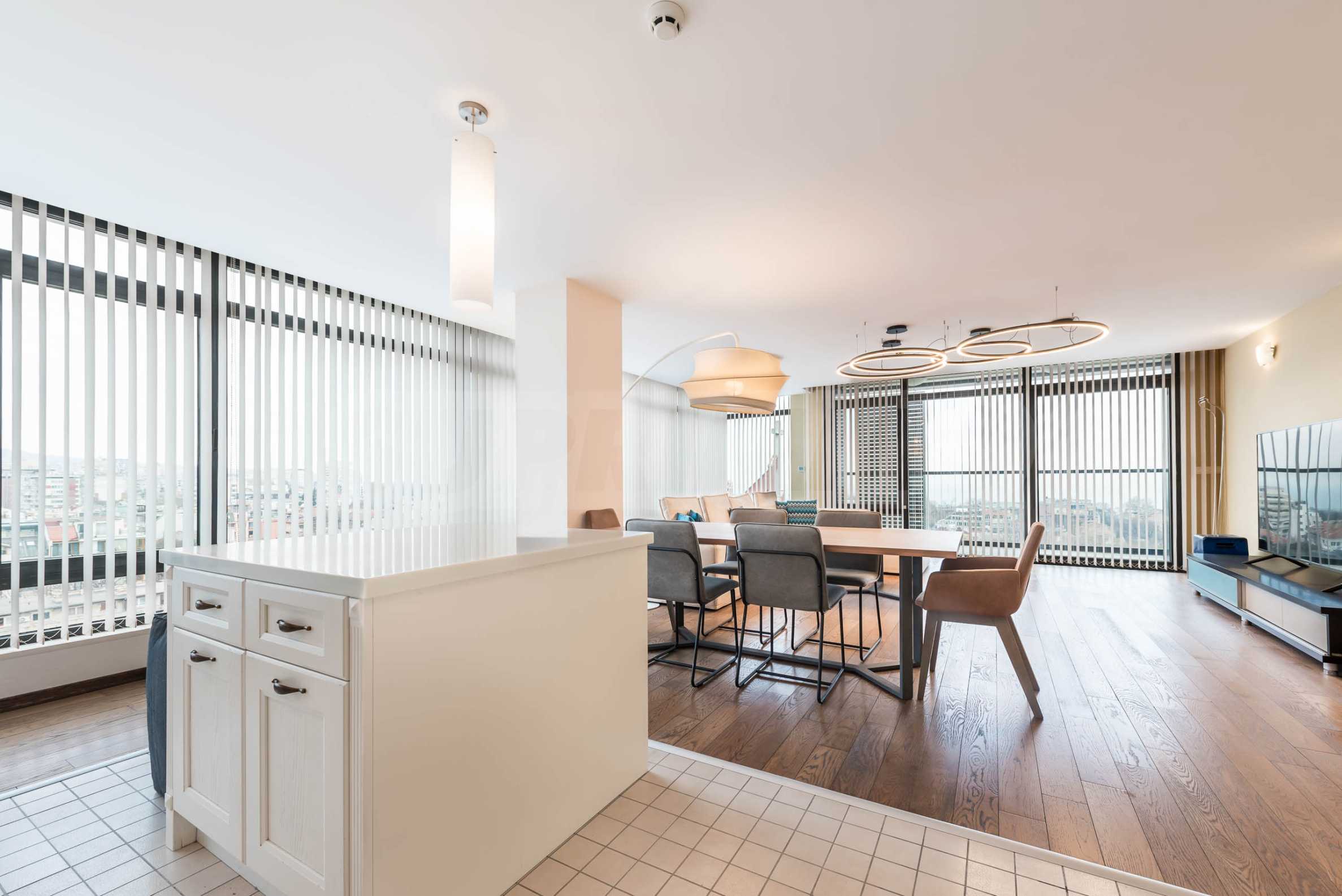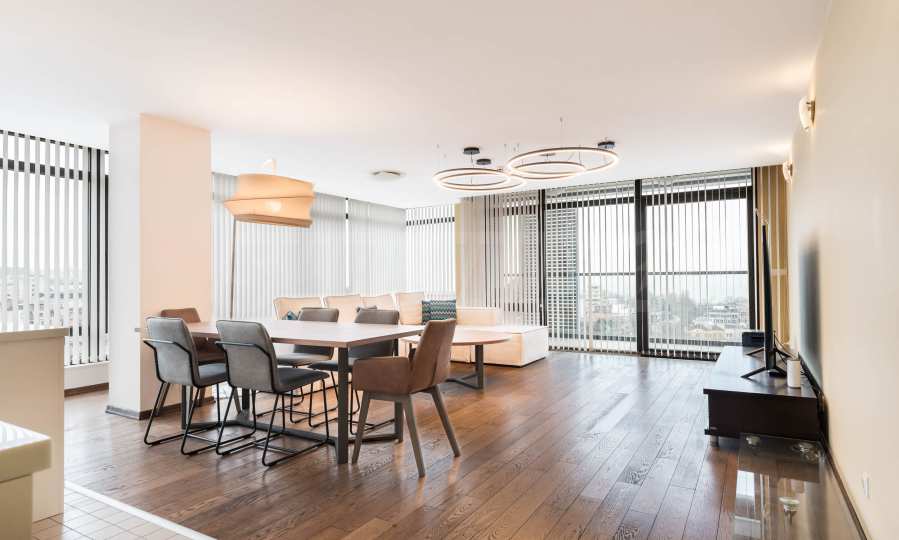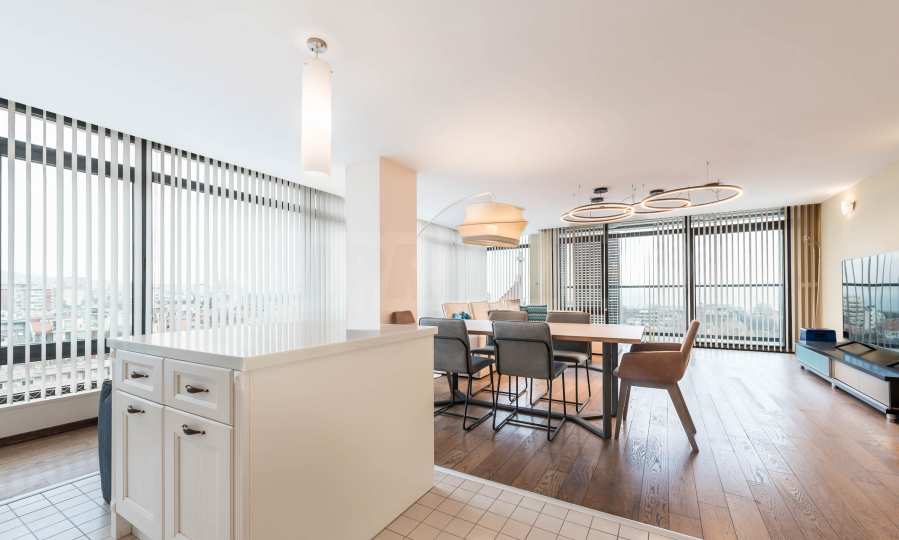 Квартира расположена на 10-м этаже 11-этажного жилого дома и имеет общую площадь 179 кв. м. Из нее открывается прекрасный панорамный вид на город и морской залив.