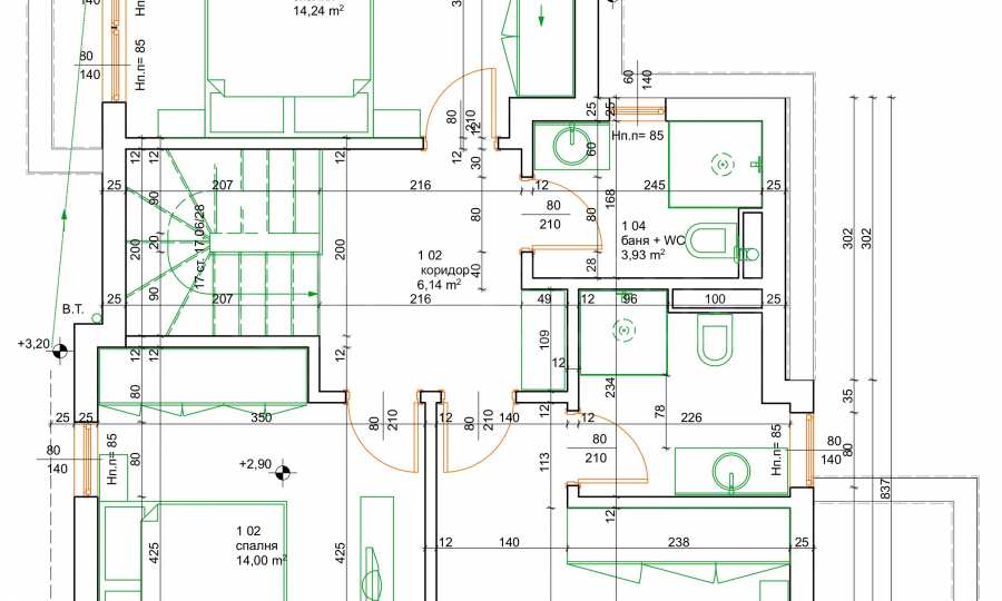• 2 этаж: три спальни, две ванные комнаты с туалетами, террасы.