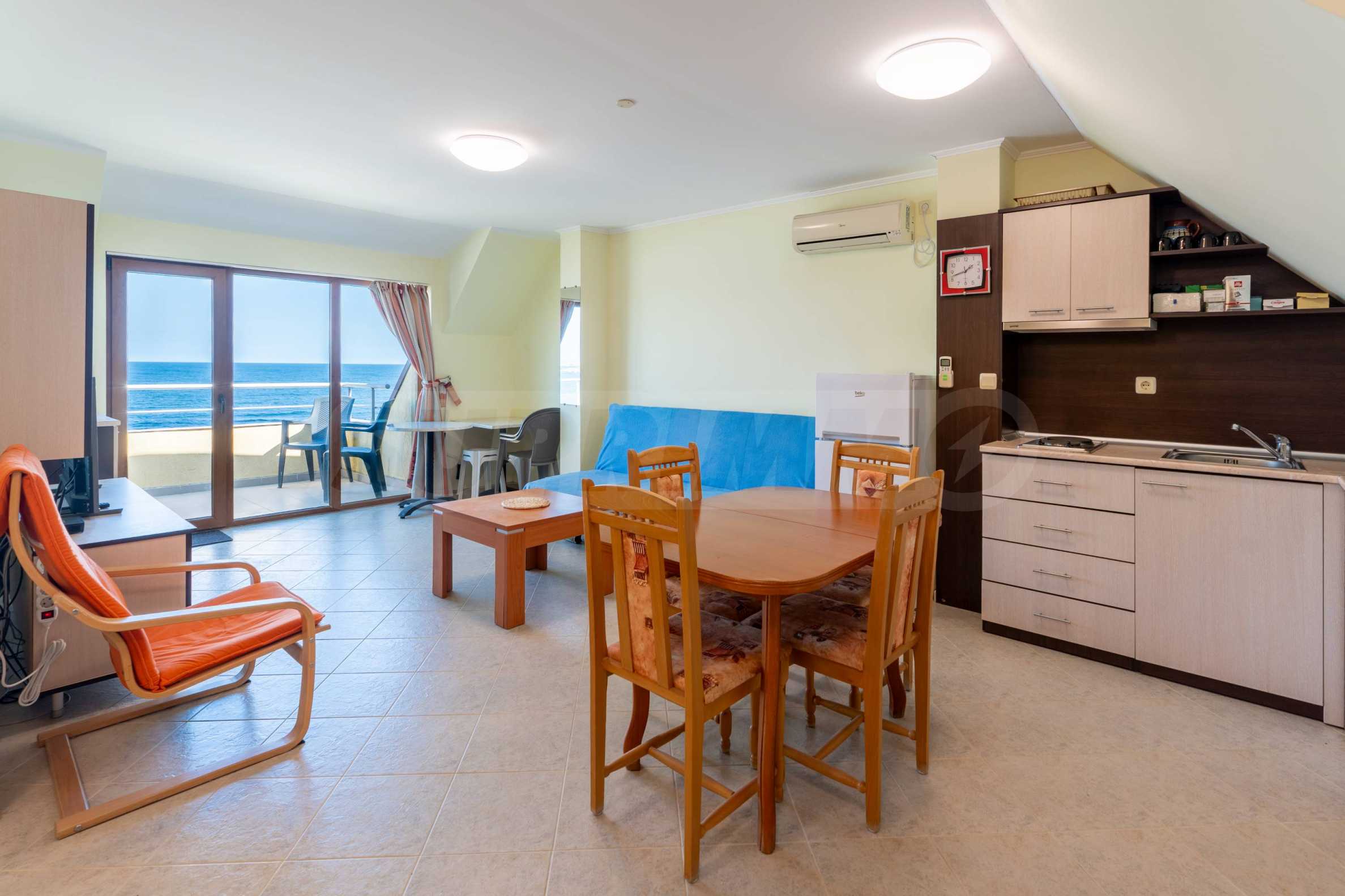 Общая площадь объекта составляет 56,90 кв. м, он расположен на 3-м этаже и предлагает беспрепятственный панорамный вид на море и пляж.