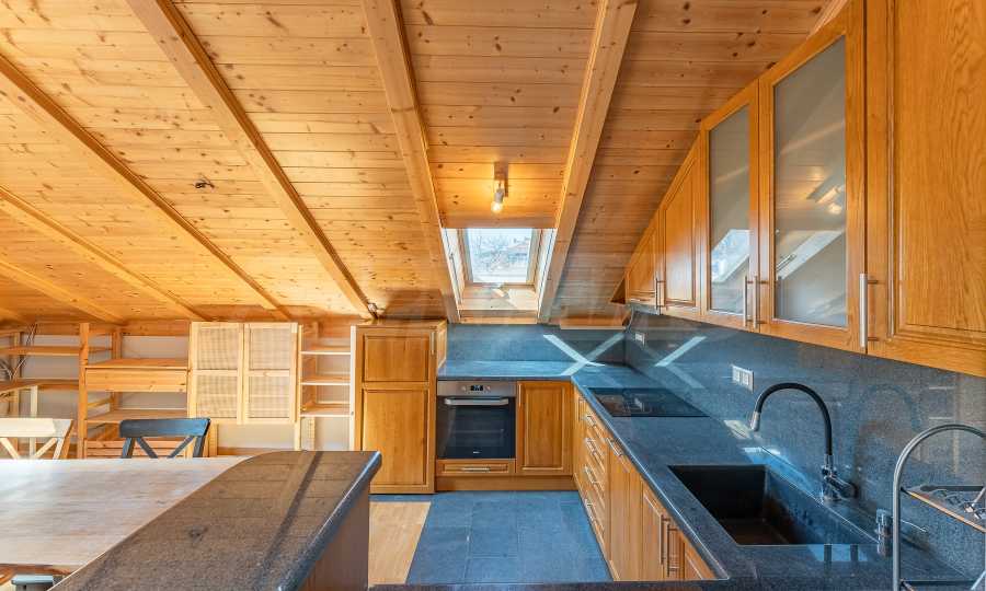 Квартира общей площадью 58 кв. м впечатляет высокими наклонными потолками, полностью отделанными натуральным деревом, видимыми балками и многочисленными мансардными окнами, которые наполняют пространство естественным светом в течение всего дня.