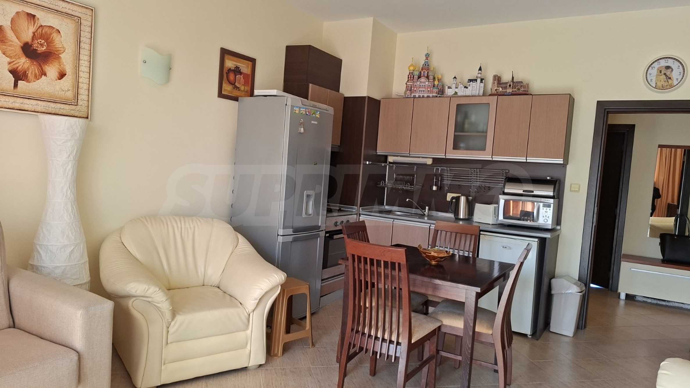 Предлагаем к продаже меблированную однокомнатную квартиру в элитном закрытом комплексе на второй линии от моря, в районе Голден Сэндс. В тихой парковой части курорта.