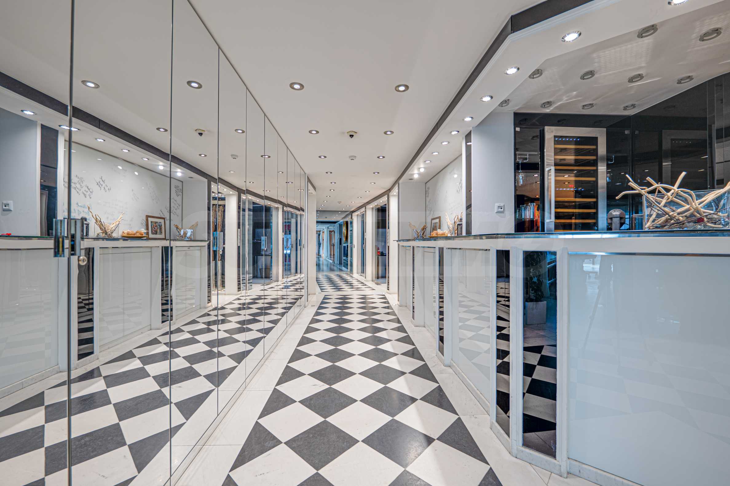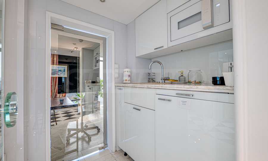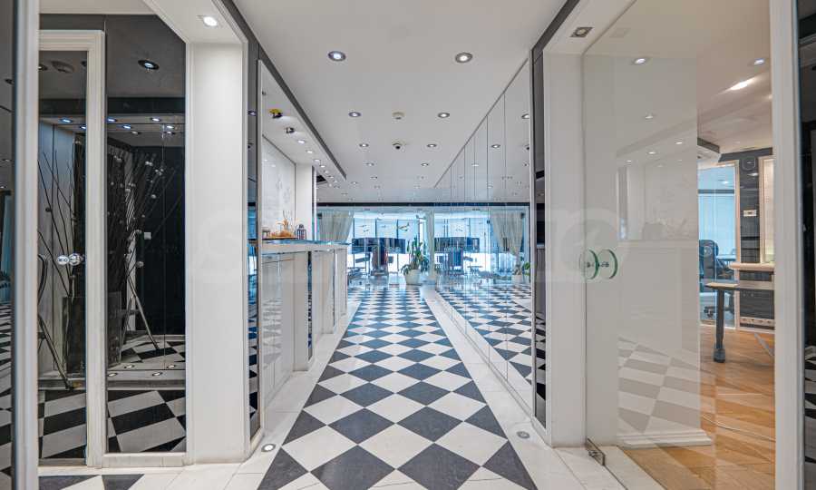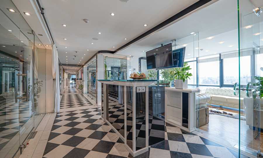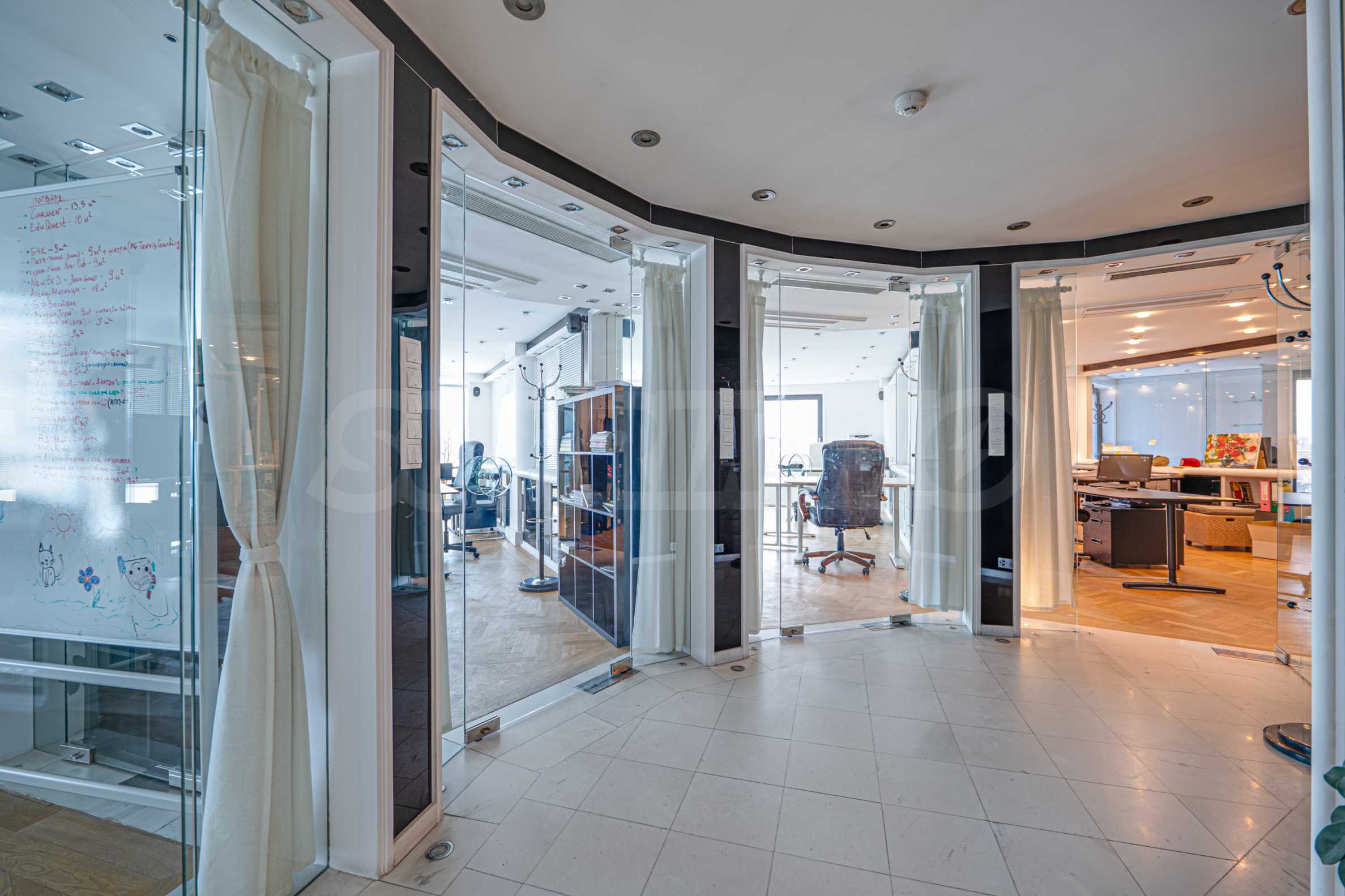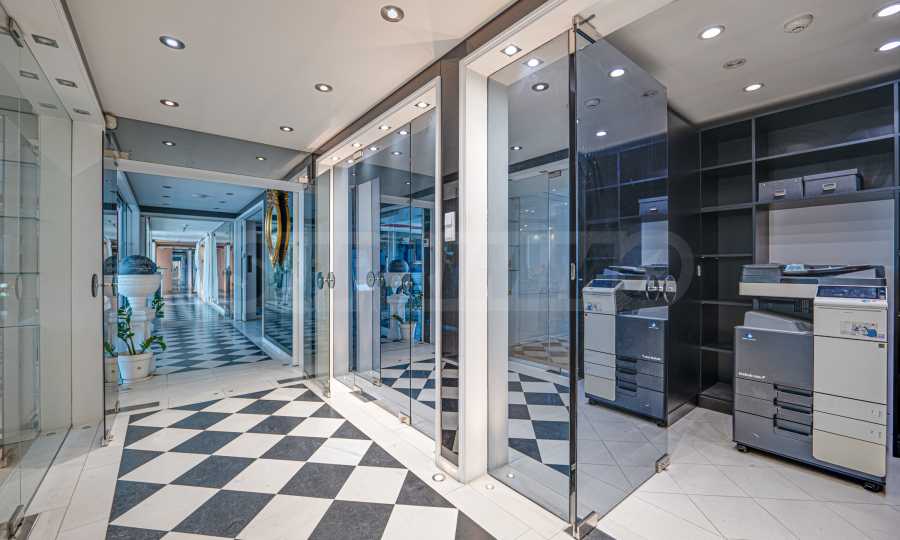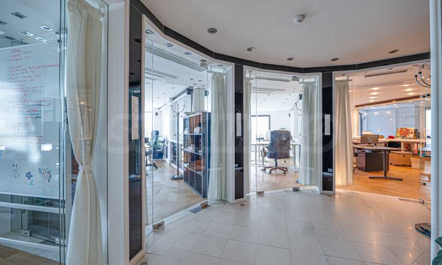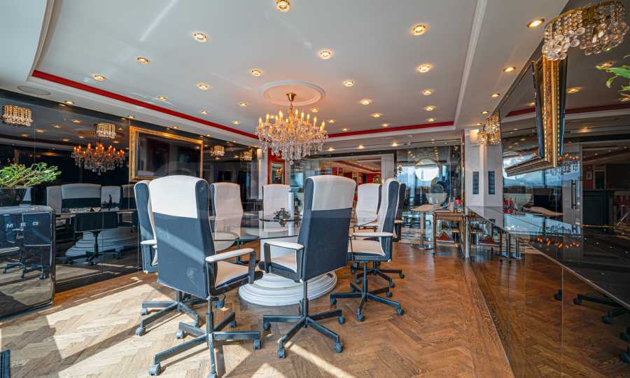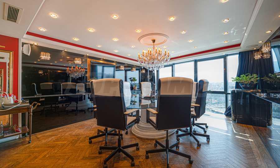 Полы выполнены из натурального паркета и мрамора. Офисы обставлены новой мебелью: столами и стульями. Перегородки массивные, из стекла. В переговорной комнате установлен роскошный стол, стулья, телевизор и шкафы. Благодаря удобной планировке и раздвижным дверям, ведущим в офисную зону, квартиру можно использовать и для проведения встреч и мероприятий.