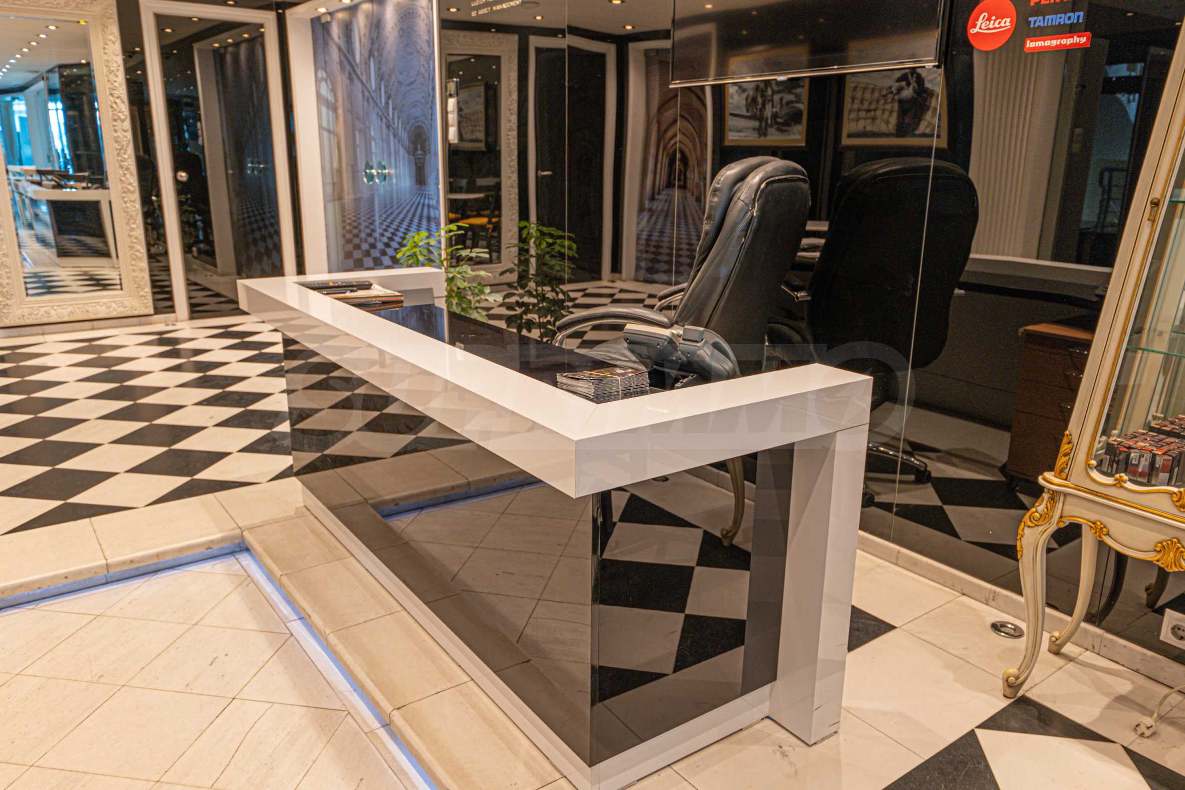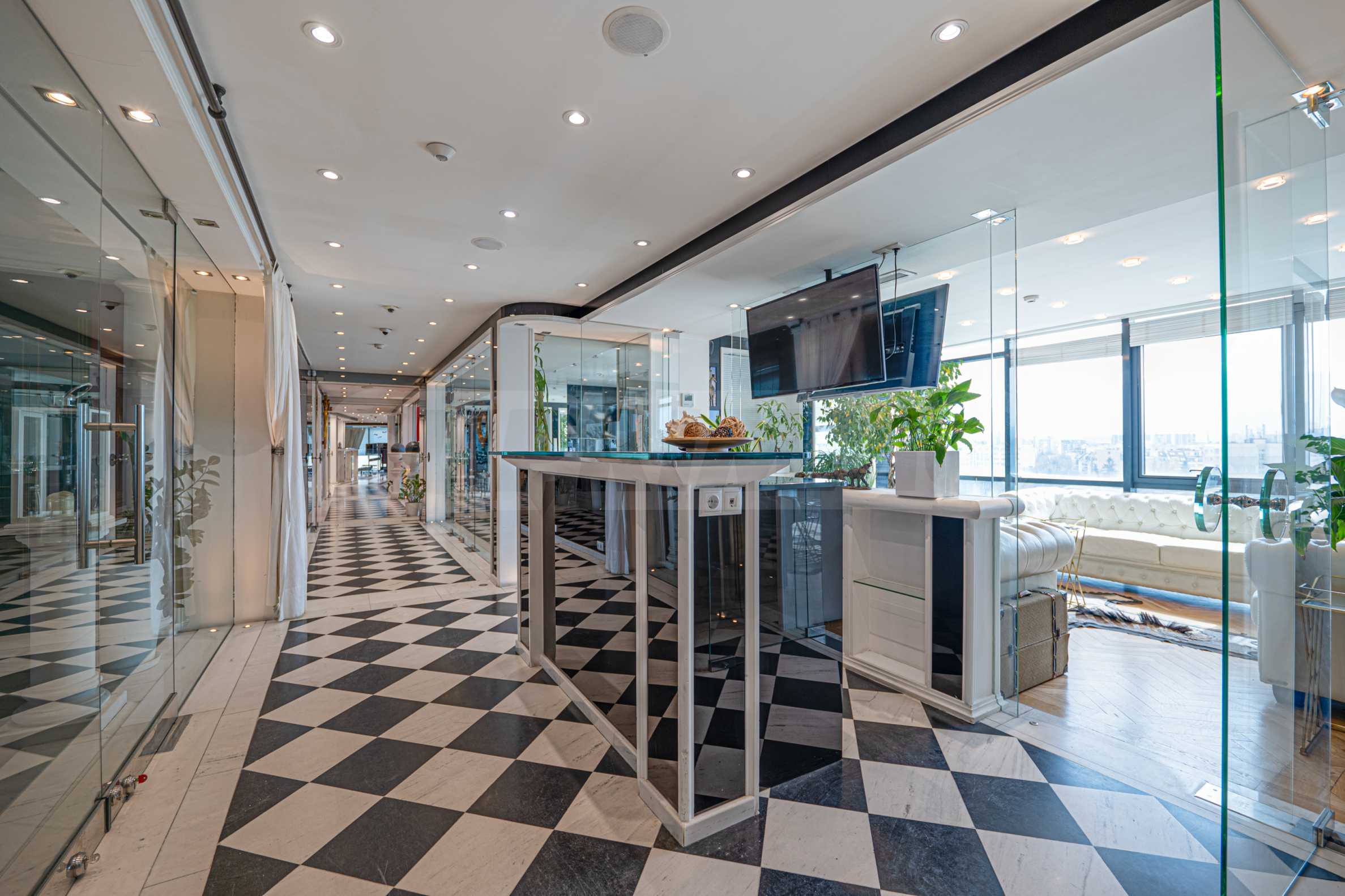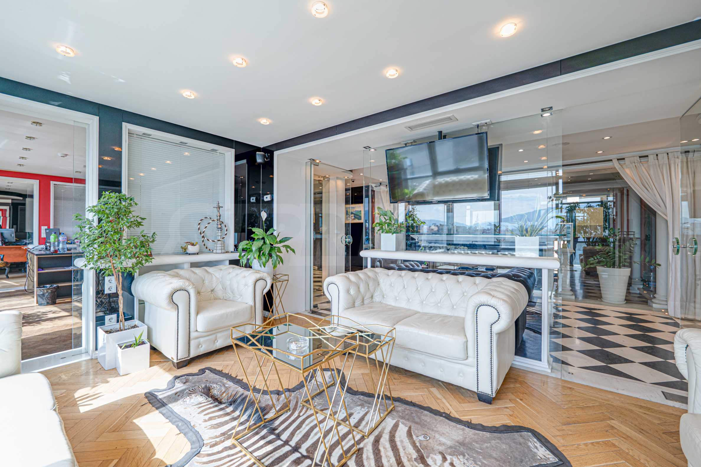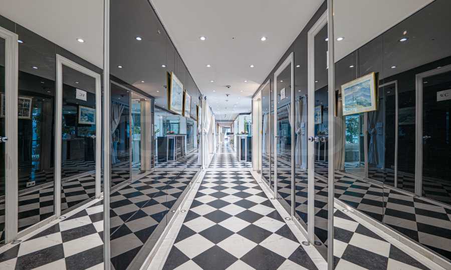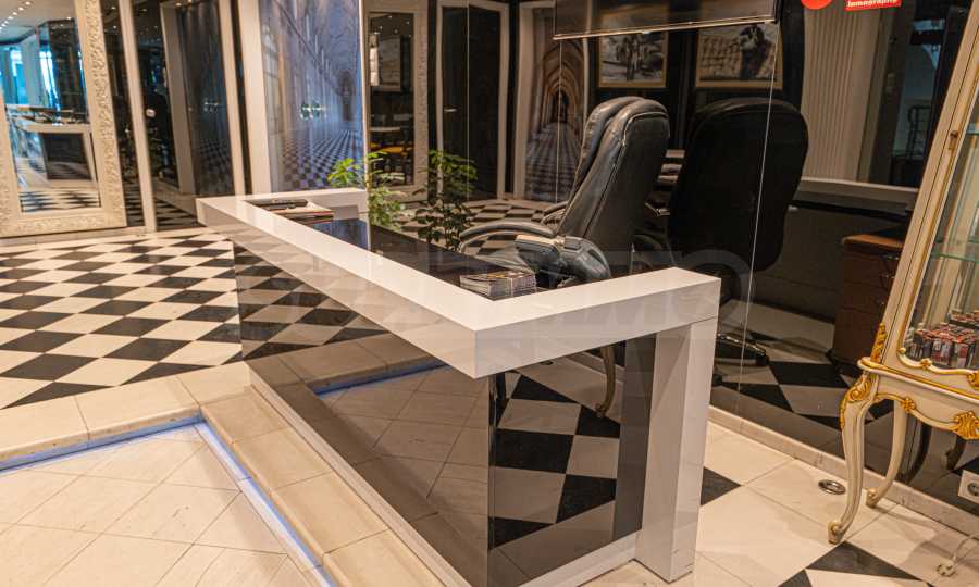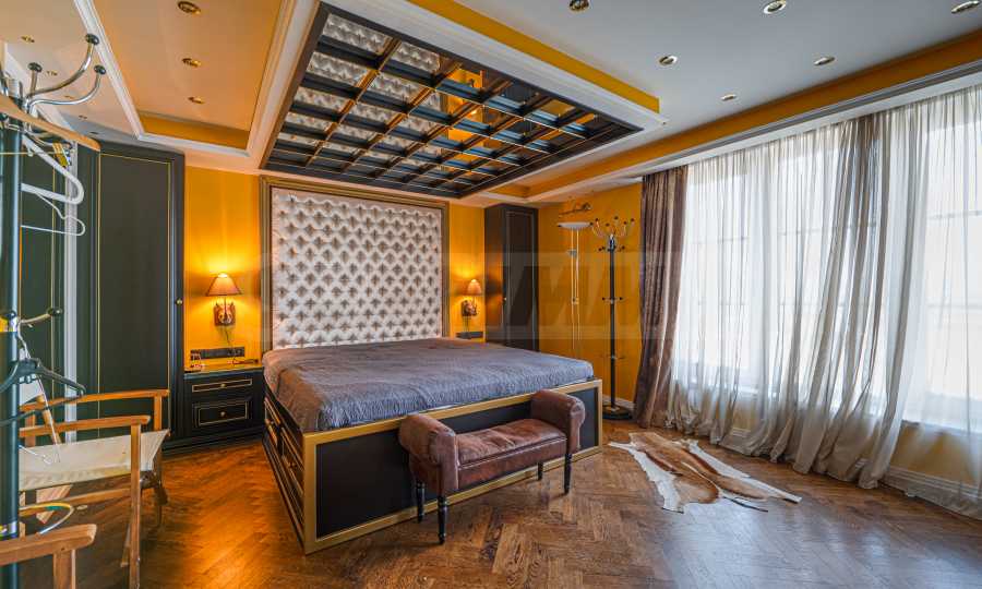 Полы выполнены из натурального паркета и мрамора. Офисы обставлены новой мебелью: столами и стульями. Перегородки массивные, из стекла. В переговорной комнате установлен роскошный стол, стулья, телевизор и шкафы. Благодаря удобной планировке и раздвижным дверям, ведущим в офисную зону, квартиру можно использовать и для проведения встреч и мероприятий.