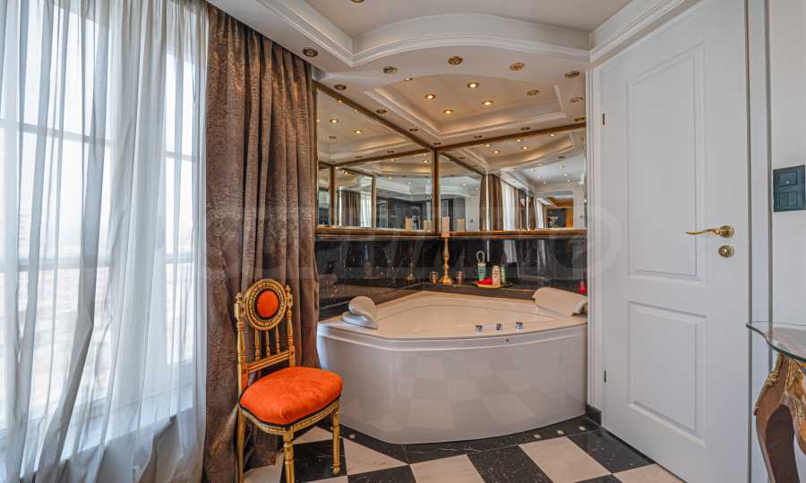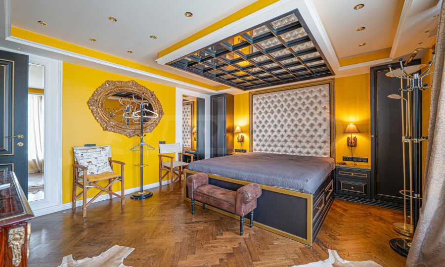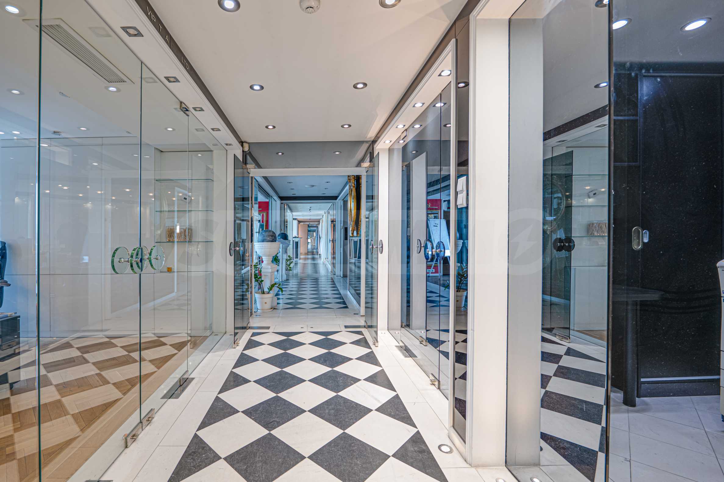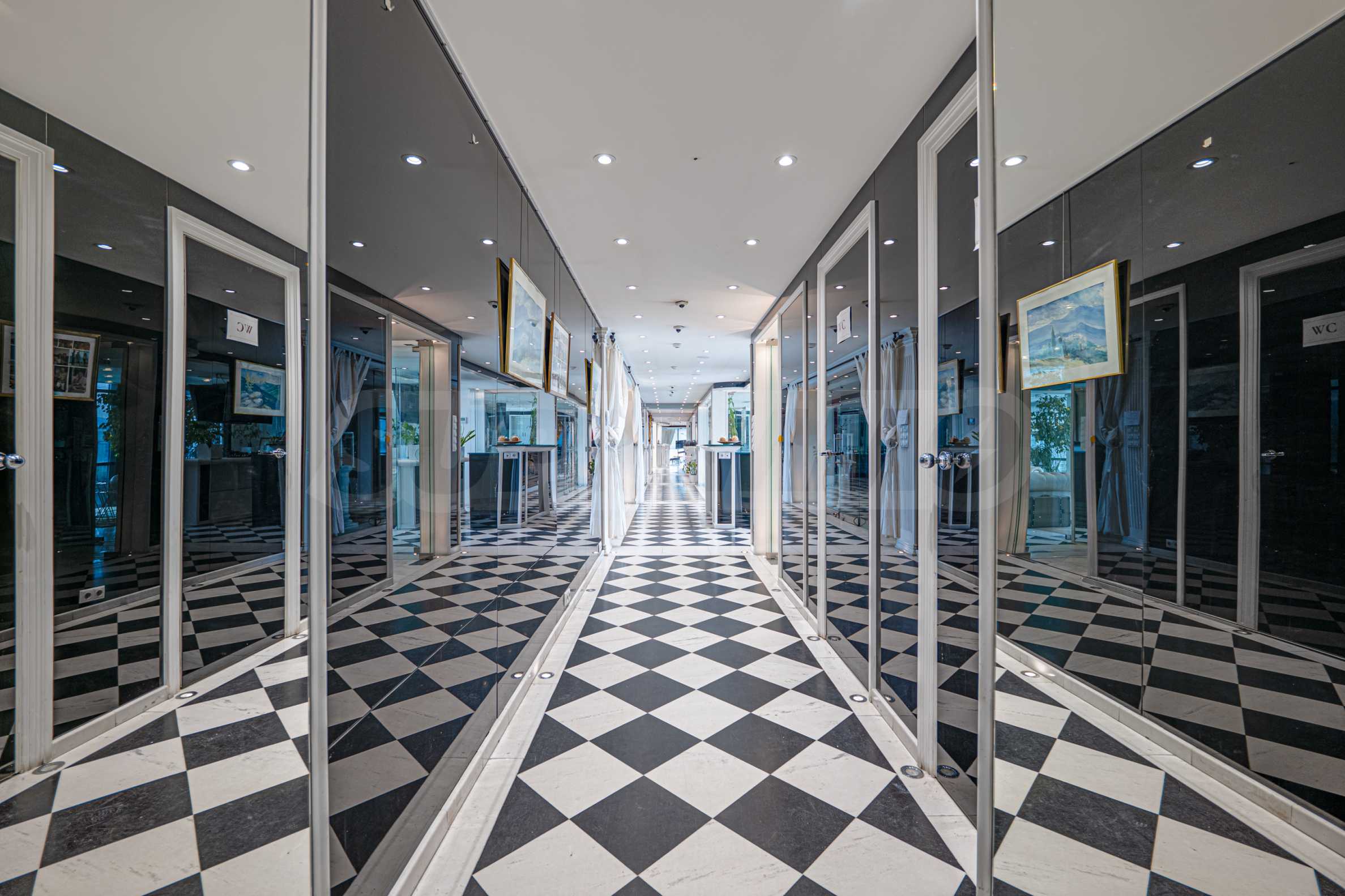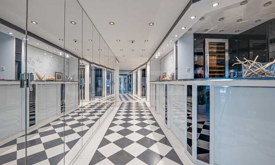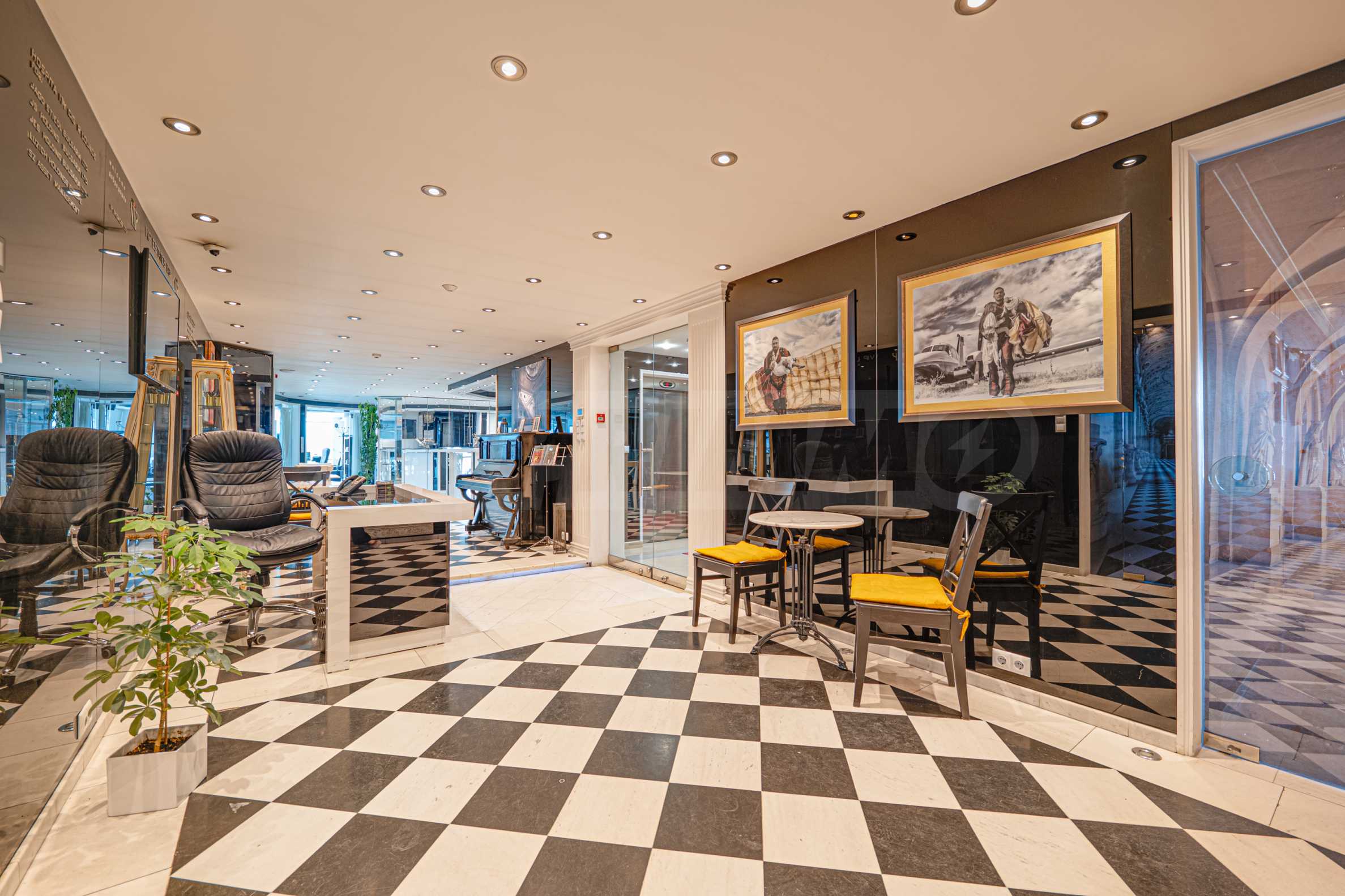 Полы выполнены из натурального паркета и мрамора. Офисы обставлены новой мебелью: столами и стульями. Перегородки массивные, из стекла. В переговорной комнате установлен роскошный стол, стулья, телевизор и шкафы. Благодаря удобной планировке и раздвижным дверям, ведущим в офисную зону, квартиру можно использовать и для проведения встреч и мероприятий.