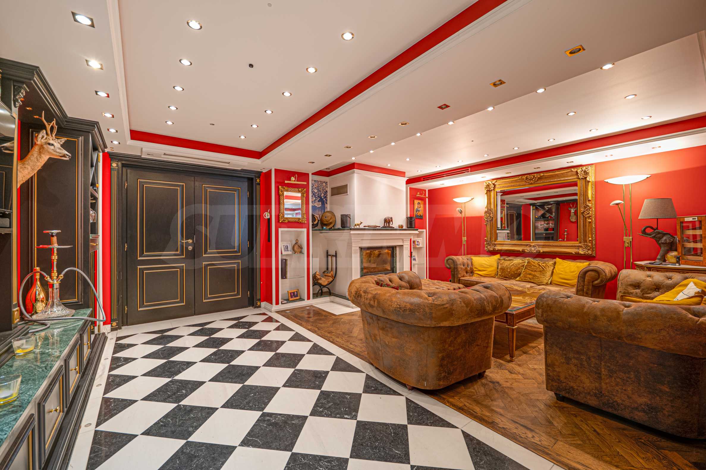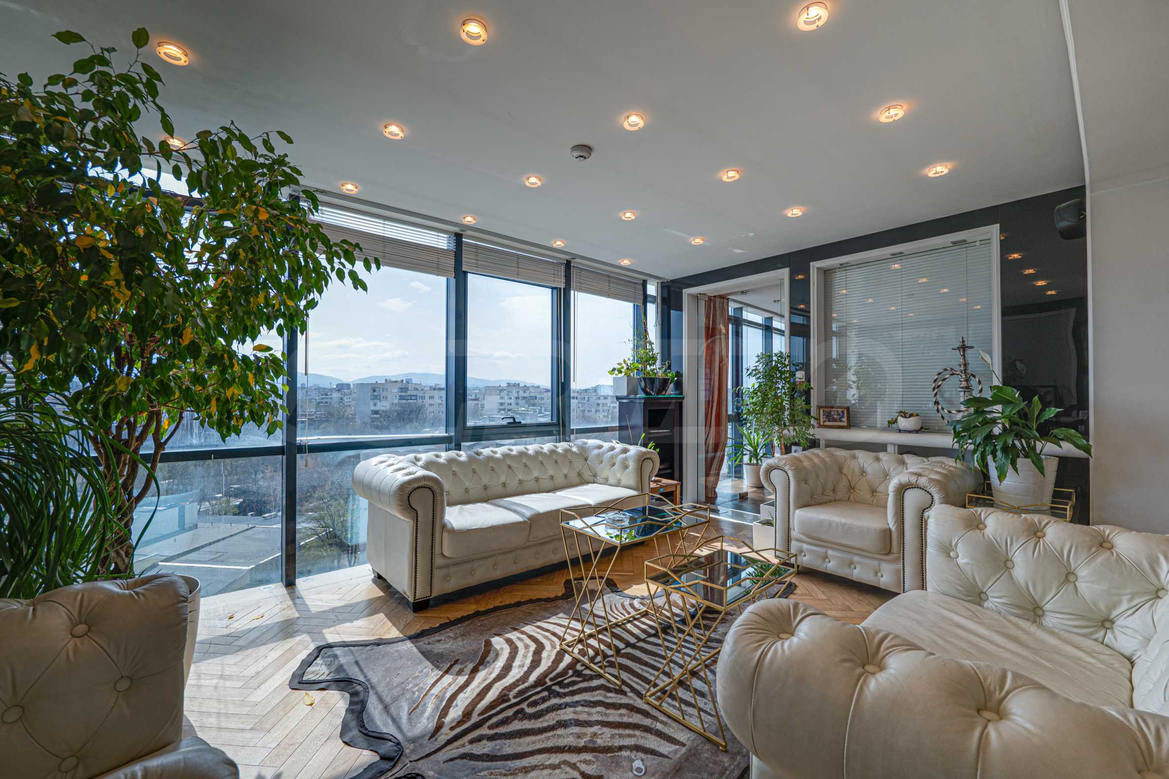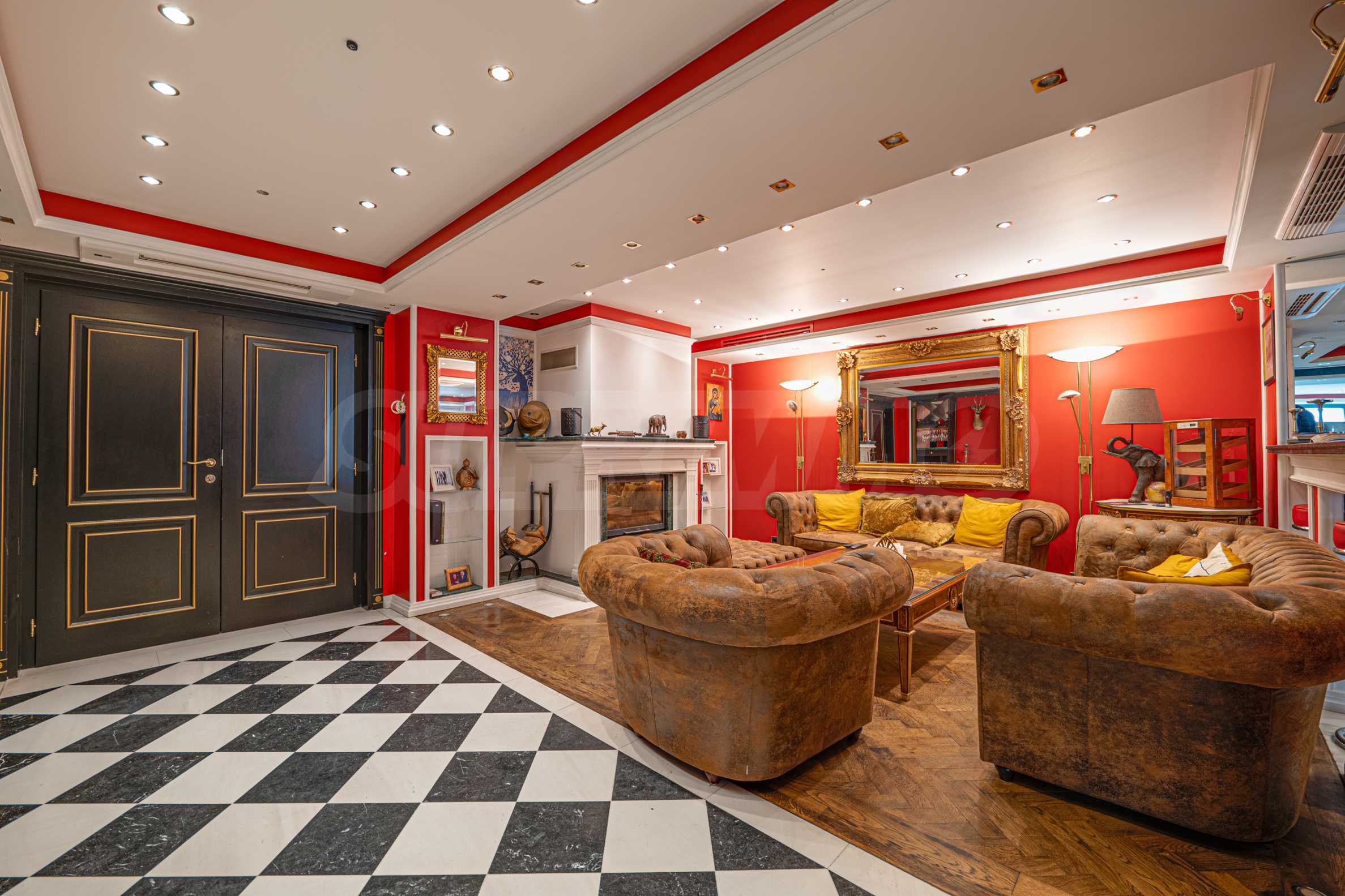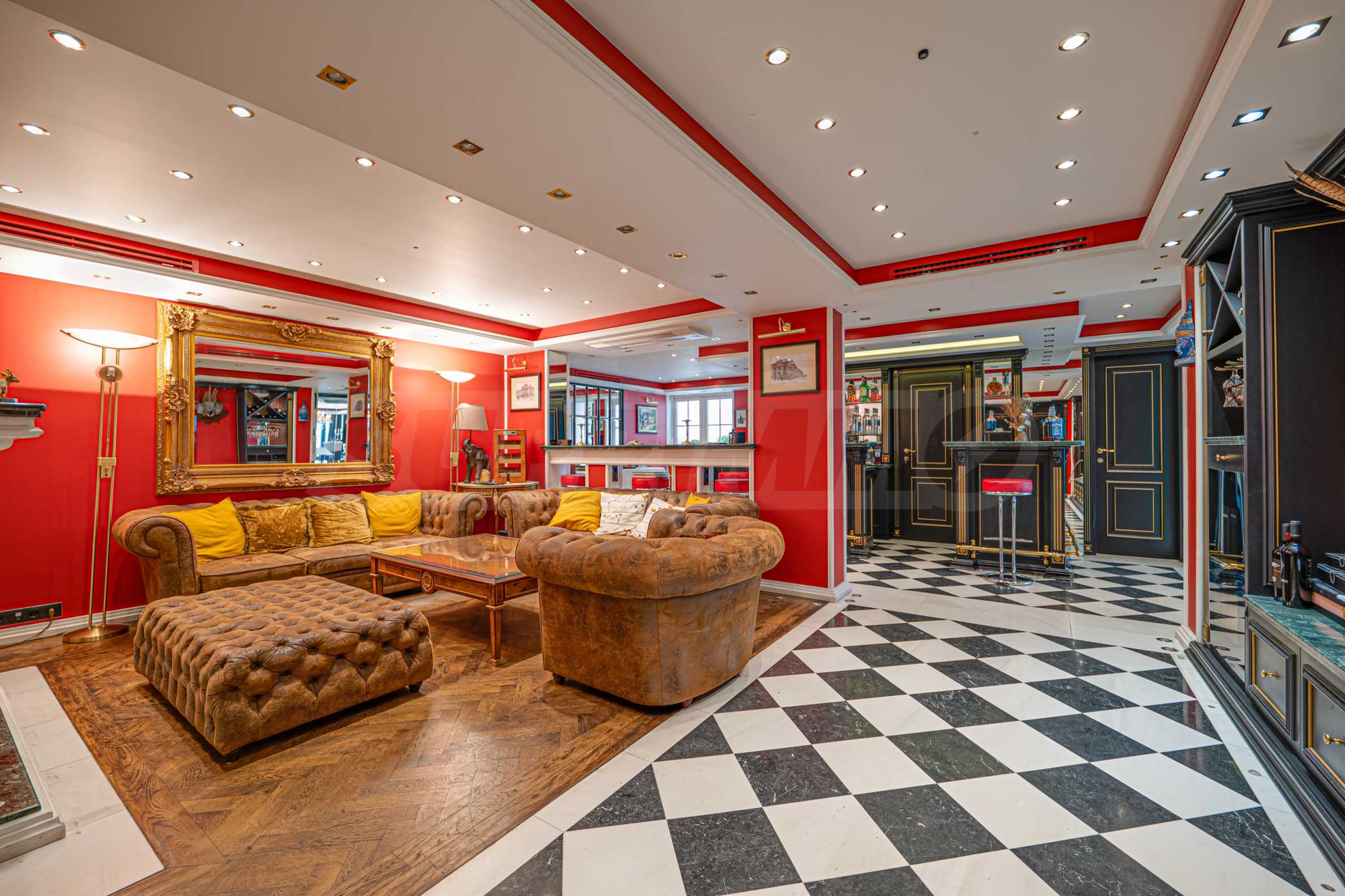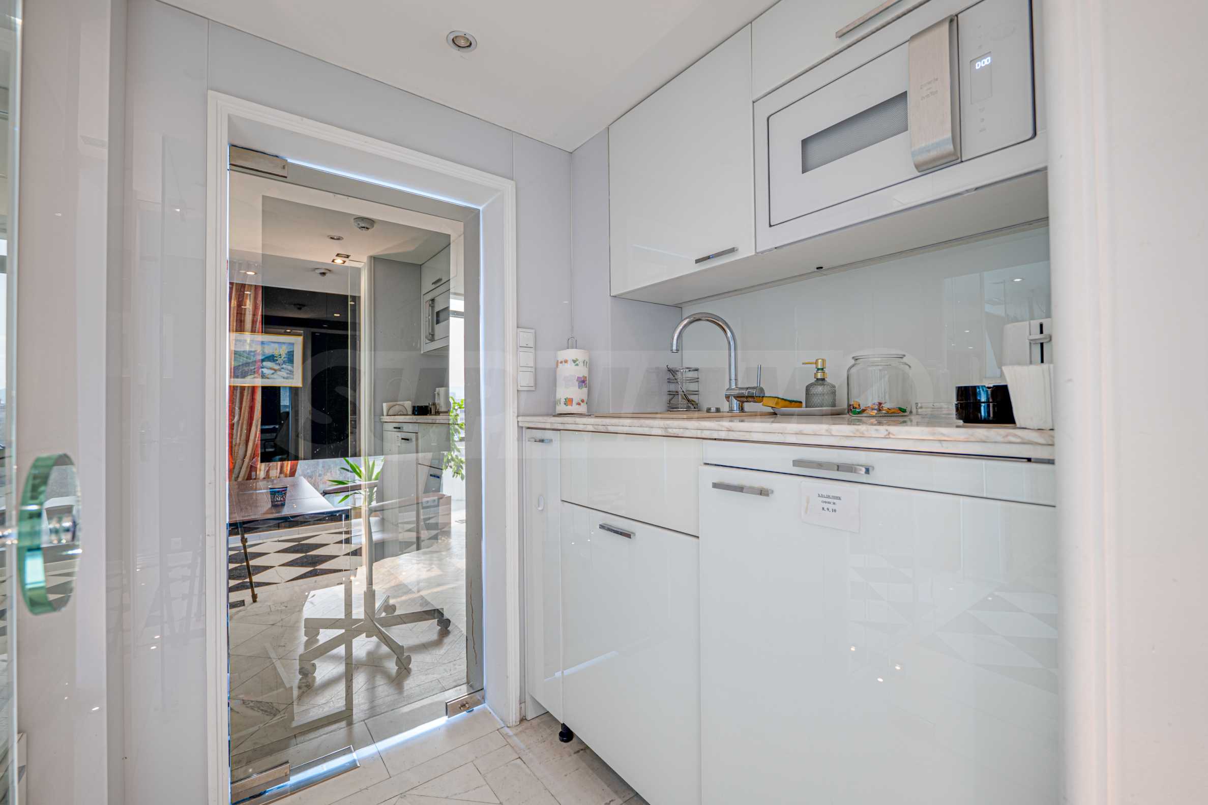Полы выполнены из натурального паркета и мрамора. Офисы обставлены новой мебелью: столами и стульями. Перегородки массивные, из стекла. В переговорной комнате установлен роскошный стол, стулья, телевизор и шкафы. Благодаря удобной планировке и раздвижным дверям, ведущим в офисную зону, квартиру можно использовать и для проведения встреч и мероприятий.