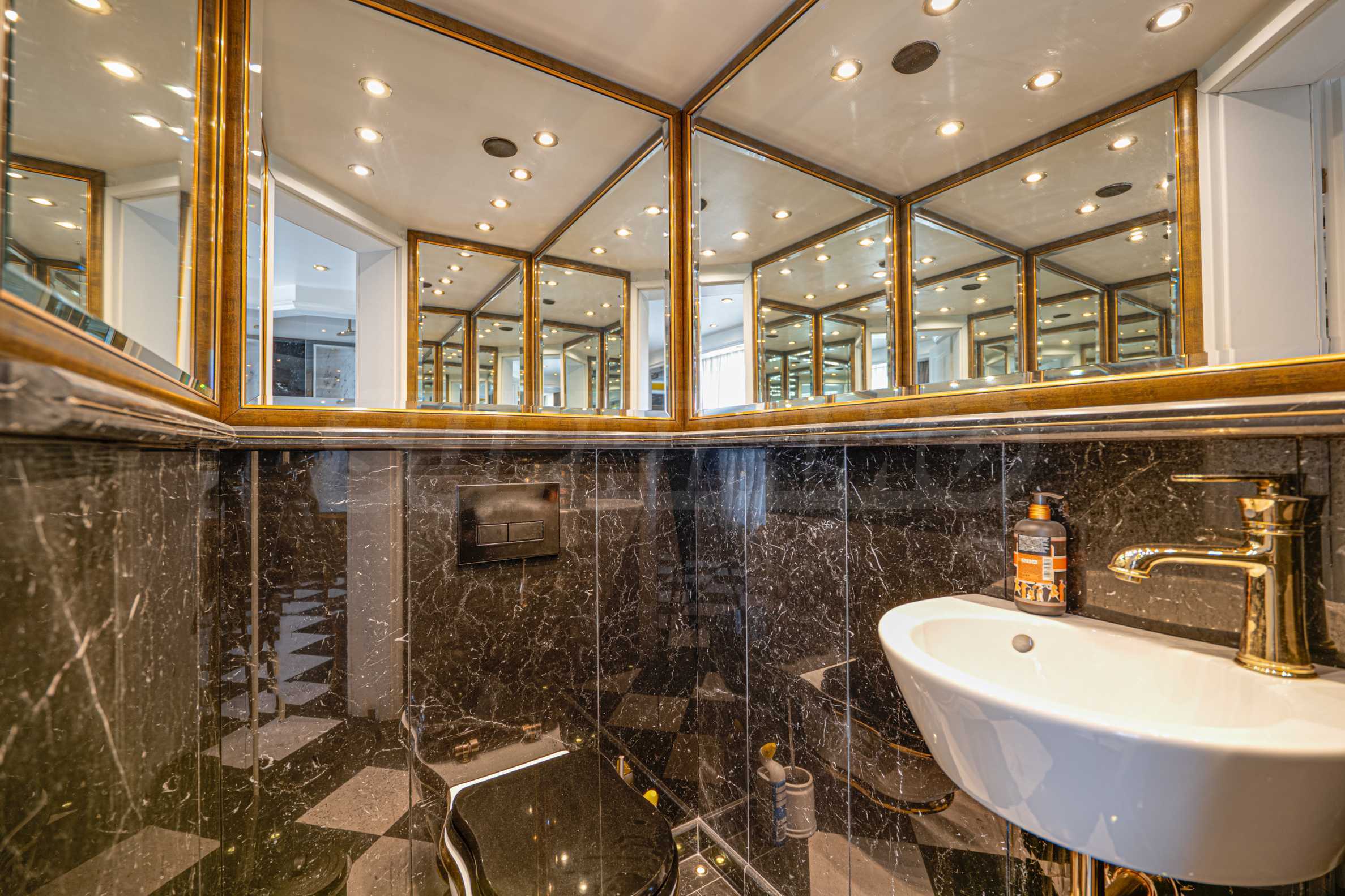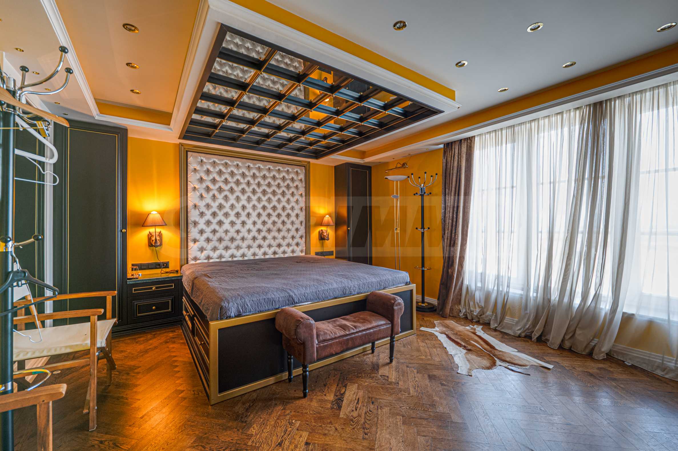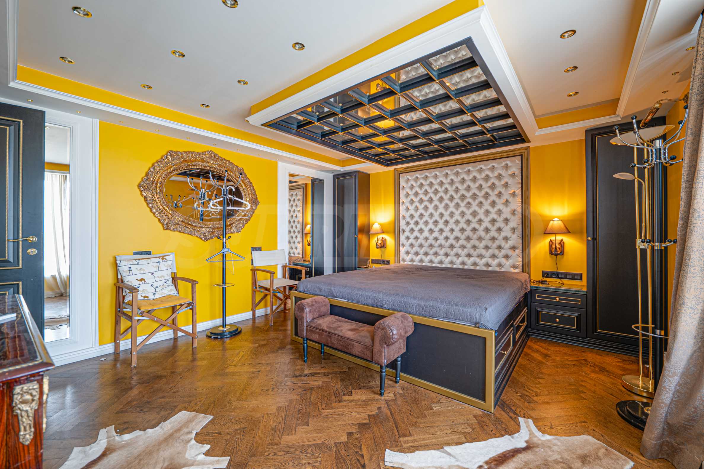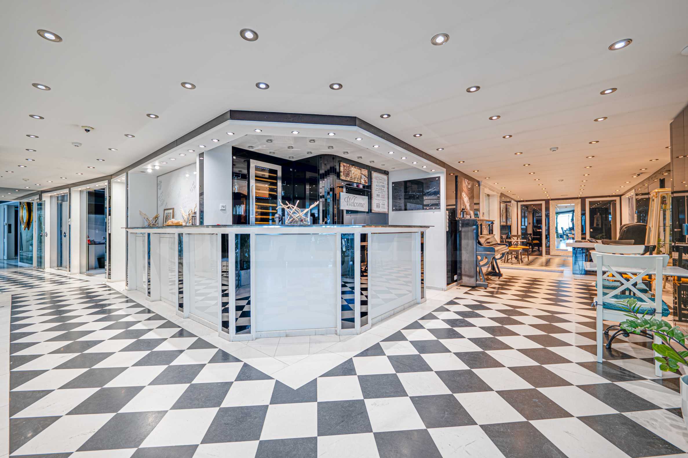 Полы выполнены из натурального паркета и мрамора. Офисы обставлены новой мебелью: столами и стульями. Перегородки массивные, из стекла. В переговорной комнате установлен роскошный стол, стулья, телевизор и шкафы. Благодаря удобной планировке и раздвижным дверям, ведущим в офисную зону, квартиру можно использовать и для проведения встреч и мероприятий.