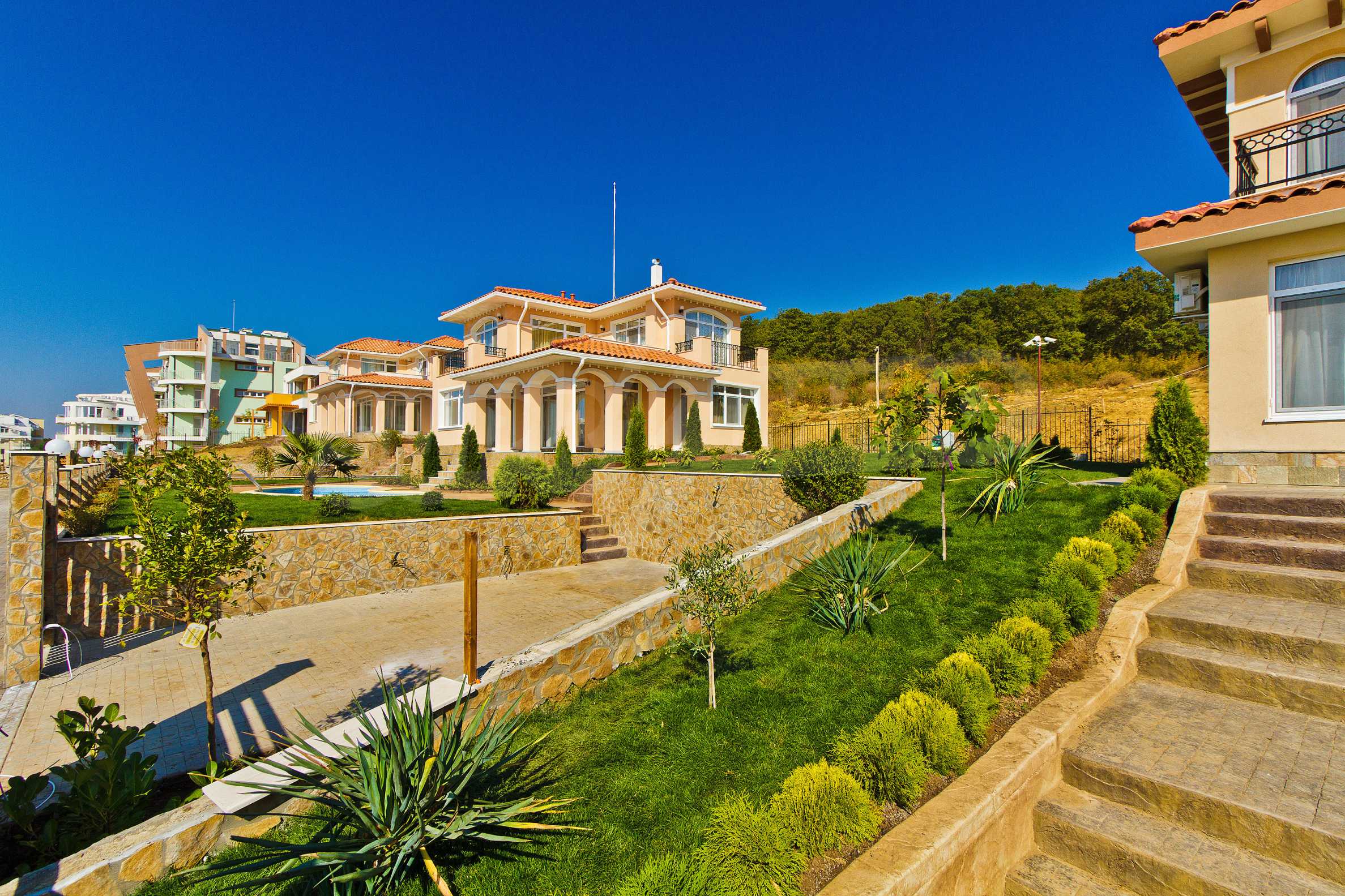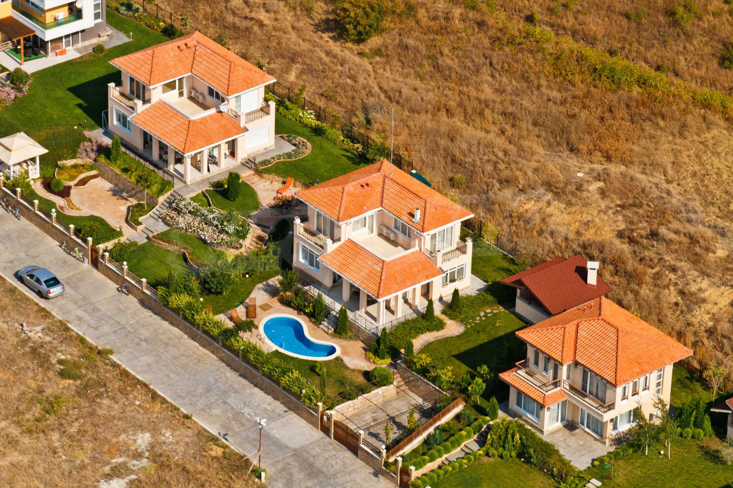 Дачный поселок раскинут на площади около 12 000 кв.м. и состоит из 18 участков, каждый из которых отведен под строительство семейных домов с собственным двориком. К каждому участку подведены все коммуникации, можно сразу начать строительство. Оформлены внутренние улицы, обеспечены контроль и охрана. Уже построены первые 7 роскошных вилл в средиземноморском стиле.